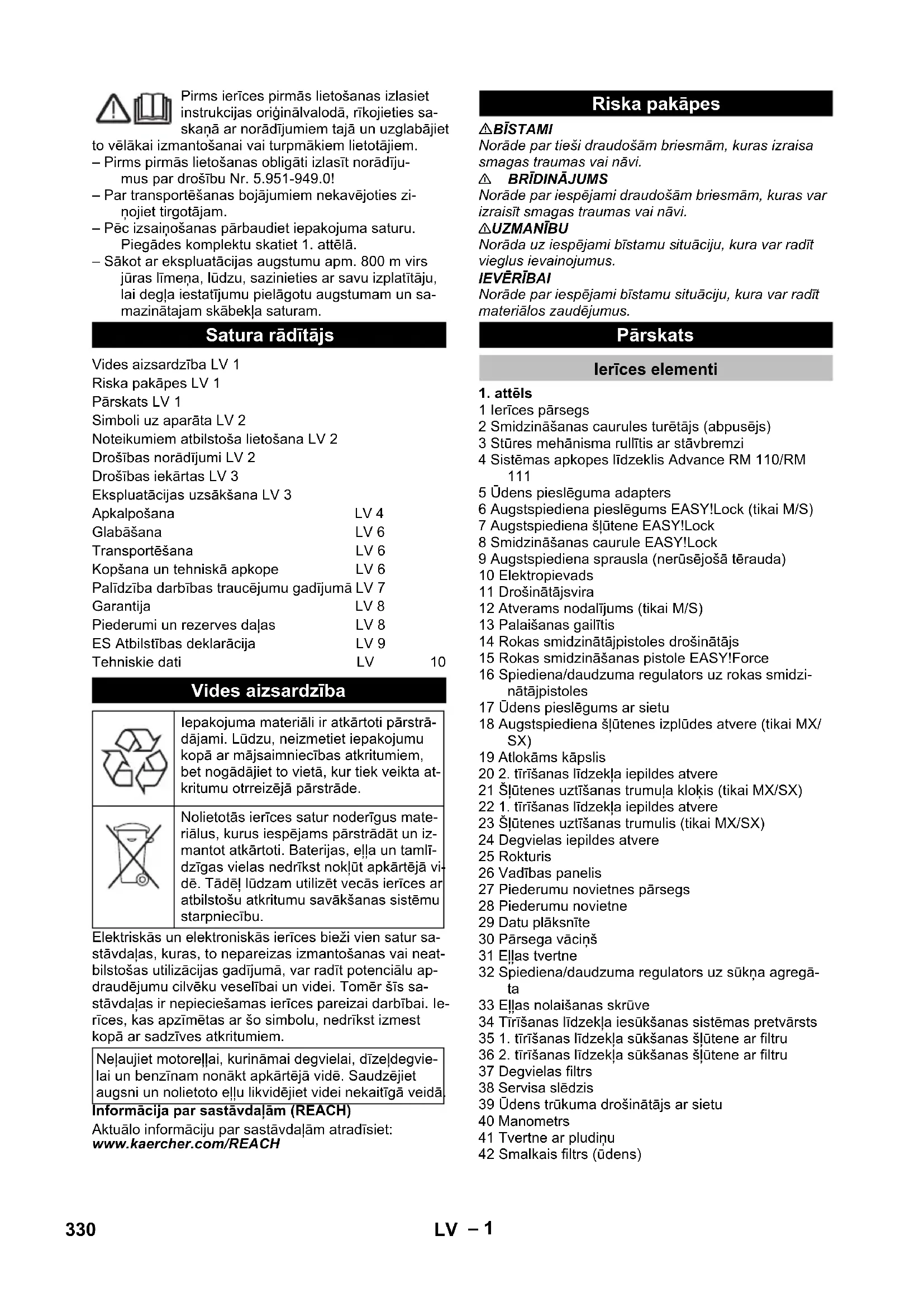 33 Eļļas nolaišanas skrūve 34 Tīrīšanas līdzekļa iesūkšanas sistēmas pretvārsts 35 1. tīrīšanas līdzekļa sūkšanas šļūtene ar filtru 36 2. tīrīšanas līdzekļa sūkšanas šļūtene ar filtru 37 Degvielas filtrs 38 Servisa slēdzis 39 Ūdens trūkuma drošinātājs ar sietu 40 Manometrs 41 Tvertne ar pludiņu 42 Smalkais filtrs (ūdens) Satura rādītājs Vides aizsardzība LV 1 Riska pakāpes LV 1 Pārskats LV 1 Simboli uz aparāta LV 2 Noteikumiem atbilstoša lietošana LV 2 Drošības norādījumi LV 2 Drošības iekārtas LV 3 Ekspluatācijas uzsākšana LV 3 Apkalpošana LV 4 Glabāšana LV 6 Transportēšana LV 6 Kopšana un tehniskā apkope LV 6 Palīdzība darbības traucējumu gadījumā LV 7 Garantija LV 8 Piederumi un rezerves daļas LV 8 ES Atbilstības deklarācija LV 9 Tehniskie dati LV 10 Vides aizsardzība Iepakojuma materiāli ir atkārtoti pārstrā- dājami. Lūdzu, neizmetiet iepakojumu kopā ar mājsaimniecības atkritumiem, bet nogādājiet to vietā, kur tiek veikta at- kritumu otrreizējā pārstrāde. Nolietotās ierīces satur noderīgus mate- riālus, kurus iespējams pārstrādāt un iz- mantot atkārtoti. Baterijas, eļļa un tamlī- dzīgas vielas nedrīkst nokļūt apkārtējā vi- dē. Tādēļ lūdzam utilizēt vecās ierīces ar atbilstošu atkritumu savākšanas sistēmu starpniecību. Neļaujiet motoreļļai, kurināmai degvielai, dīzeļdegvie- lai un benzīnam nonākt apkārtējā vidē. Saudzējiet augsni un nolietoto eļļu likvidējiet videi nekaitīgā veidā. Riska pakāpes Pārskats Ierīces elementi 330 LV– 2