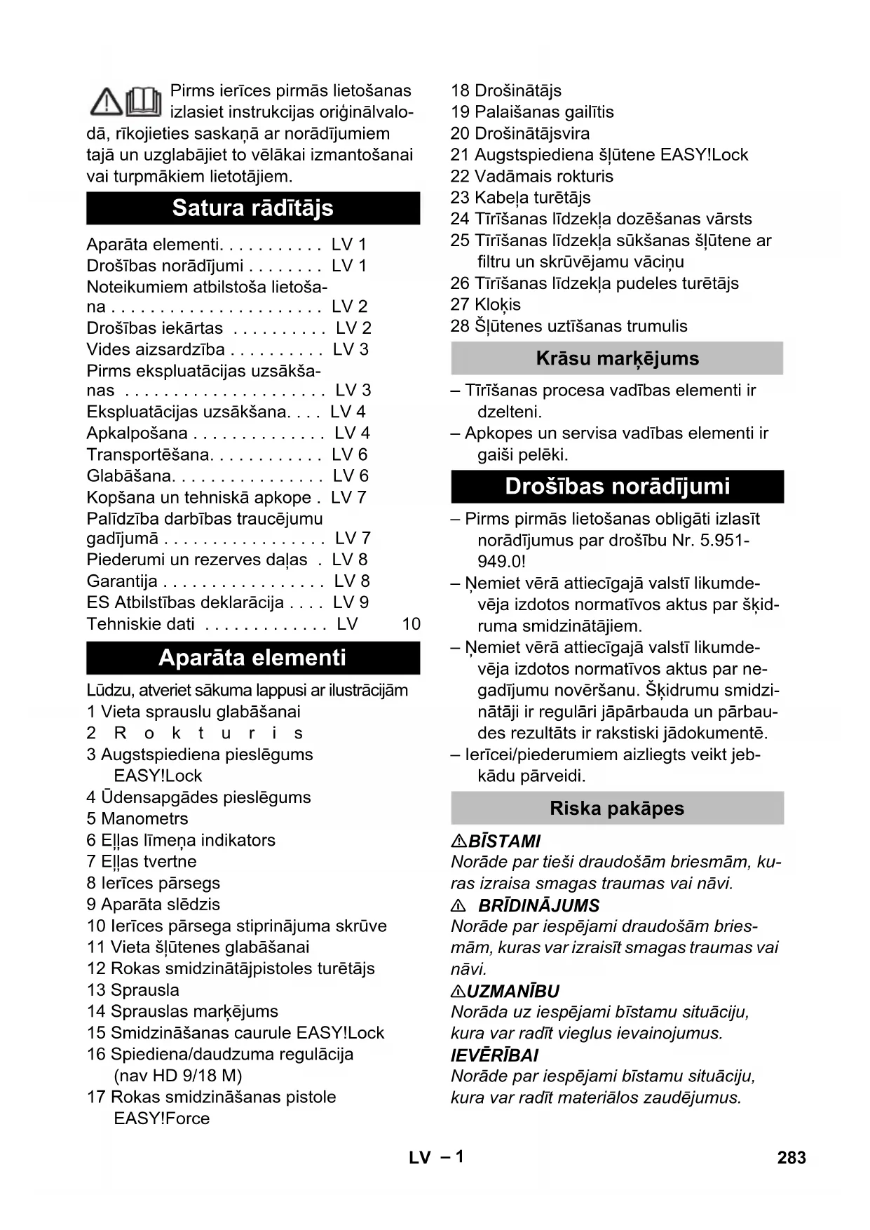 dB (A) 91 88 Käitusained Õlikogus l 0,5 0,75 Õlisort SAE 90 Hypoid Mõõtmed ja kaalud Pikkus mm 554 Laius mm 509 Kõrgus mm 1000 Kaal ilma tarvikuteta (MX) kg 48,6 42,1 (49) 47 (55) 48 (50) 282 ET– 1 Pirms ierīces pirmās lietošanas izlasiet instrukcijas oriģinālvalo- dā, rīkojieties saskaņā ar norādījumiem tajā un uzglabājiet to vēlākai izmantošanai vai turpmākiem lietotājiem. Lūdzu, atveriet sākuma lappusi ar ilustrācijām 1 Vieta sprauslu glabāšanai 2Rokturis 3 Augstspiediena pieslēgums EASY!Lock 4 Ūdensapgādes pieslēgums 5 Manometrs 6 Eļļas līmeņa indikators 7 Eļļas tvertne 8 Ierīces pārsegs 9 Aparāta slēdzis 10 Ierīces pārsega stiprinājuma skrūve 11 Vieta šļūtenes glabāšanai 12 Rokas smidzinātājpistoles turētājs 13 Sprausla 14 Sprauslas marķējums 15 Smidzināšanas caurule EASY!Lock 16 Spiediena/daudzuma regulācija (nav HD 9/18 M) 17 Rokas smidzināšanas pistole EASY!Force 18 Drošinātājs 19 Palaišanas gailītis 20 Drošinātājsvira 21 Augstspiediena šļūtene EASY!Lock 22 Vadāmais rokturis 23 Kabeļa turētājs 24 Tīrīšanas līdzekļa dozēšanas vārsts 25 Tīrīšanas līdzekļa sūkšanas šļūtene ar filtru un skrūvējamu vāciņu 26 Tīrīšanas līdzekļa pudeles turētājs 27 Kloķis 28 Šļūtenes uztīšanas trumulis – Tīrīšanas procesa vadības elementi ir dzelteni. – Apkopes un servisa vadības elementi ir gaiši pelēki. – Pirms pirmās lietošanas obligāti izlasīt norādījumus par drošību Nr. 5.951- 949.0! – Ņemiet vērā attiecīgajā valstī likumde- vēja izdotos normatīvos aktus par šķid- ruma smidzinātājiem. – Ņemiet vērā attiecīgajā valstī likumde- vēja izdotos normatīvos aktus par ne- gadījumu novēršanu. Šķidrumu smidzi- nātāji ir regulāri jāpārbauda un pārbau- des rezultāts ir rakstiski jādokumentē. – Ierīcei/piederumiem aizliegts veikt jeb- kādu pārveidi. BĪSTAMI Norāde par tieši draudošām briesmām, ku- ras izraisa smagas traumas vai nāvi.