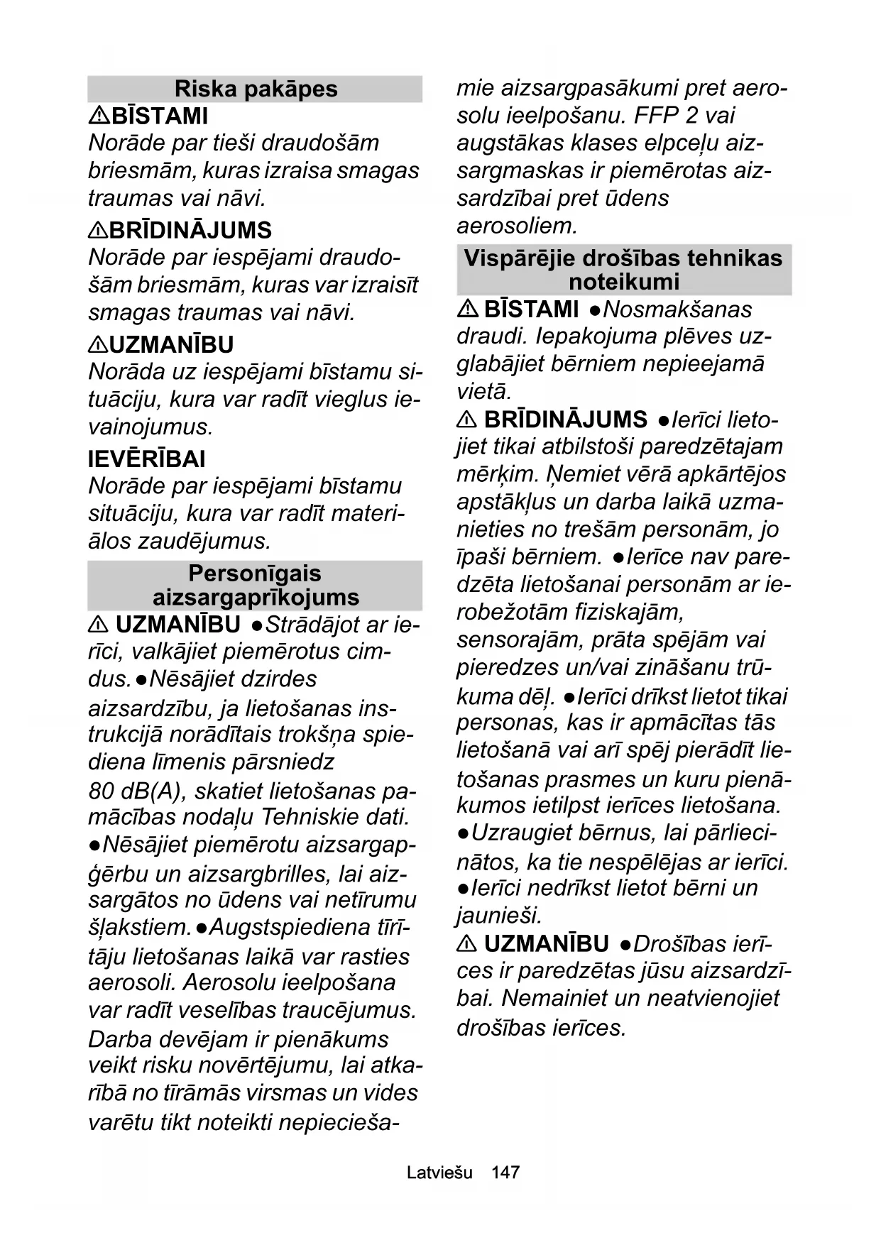 Norāde par iespējami bīstamu situāciju, kura var radīt materi- ālos zaudējumus. Personīgais aizsargaprīkojums 몇 UZMANĪBU ●Strādājot ar ie- rīci, valkājiet piemērotus cim- dus. ●Nēsājiet dzirdes aizsardzību, ja lietošanas ins- trukcijā norādītais trokšņa spie- diena lī menis pārsniedz 80 dB(A), skatiet lietošanas pa- mācības nodaļu Tehniskie dati. ●Nēsājiet piemērotu aizsargap- ģērbu un aizsargbrilles, lai aiz- sargātos no ūdens vai netīrumu šļakstiem. ●Augstspiediena tīrī- tāju lietošanas laikā var rasties aerosoli. Aerosolu ieelpošana var radīt veselības traucējumus. Darba devējam ir pienākums veikt risku novērtējumu, lai atka- rībā no tīrāmās virsmas un vides varētu tikt noteikti nepiecieša- mie aizsargpasākumi pret aero- solu ieelpošanu. FFP 2 vai augstākas klases elpceļu aiz- sargmaskas ir piemērotas aiz- sardzībai pret ūdens aerosoliem. Vispārējie drošības tehnikas noteikumi BĪSTAMI ●Nosmakšanas draudi. Iepakojuma plēves uz- glabājiet bērniem nepieejamā vietā. 몇 BRĪDINĀJUMS ●Ierīci lieto- jiet tikai atbilstoši paredzētajam mērķim. Ņemiet vērā apkārtējos apstākļus un darba laikā uzma- nieties no trešām personām, jo īpaši bērniem. ●Ierīce nav pare- dzēta lietošanai personām ar ie- robežotām fiziskajām, sensorajām, prāta spējām vai pieredzes un/vai zin āšanu trū- kuma dēļ. ●Ierīci drīkst lietot tikai personas, kas ir apmācītas tās lietošanā vai arī spēj pierādīt lie- tošanas prasmes un kuru pienā- kumos ietilpst ierīces lietošana. ●Uzraugiet bērnus, lai pārlieci- nātos, ka tie nespēlējas ar ierīci. ●Ierīci nedrīkst lietot bērni un jaunieši. 몇 UZMANĪBU ●Drošības ierī- ces ir paredzētas jūsu aizsardzī- bai. Nemainiet un neatvienojiet drošības ierīces.148 Latviešu Strāvas triecienu bīstamība BĪSTAMI ●I klases aizsardzī- bas ierīces pievienojiet tikai pa- reizi sazemētiem strāvas avotiem. ●Datu plāksnītē norādī- tajai sprieguma vērtībai jāsakrīt ar strāvas avota spriegumu. ●Ie- vērojiet rozetes minimālo slēgu- mu, skatiet lietošanas pamācības nodaļu Tehniskie da- ti. ●Ierīci lietojiet tikai ar noplū- des strāvas aizsargslēdzi (maksimāli 30 mA). ●Nekad ne- pieskarieties kontaktdakšai un kontaktligzdai ar mitrām rokām. ●Strāvas tīkla spraudnim un pa- garinājuma vada savienojumam jābūt ūdensdrošam un tas ne- drīkst atrasties ū denī. Savieno- jums nedrīkst atrasties uz zemes. Izmantojiet kabeļu spo- les, kas nodrošina kabeļu atra- šanos vismaz 60 mm virs zemes. ●Visām darba zonas strāvu vadošajām daļām jābūt aizsargātām pret ūdens strūklu. 몇 BRĪDINĀJUMS ●Ierīci pie- vienojiet tikai strāvas pieslēgu- mam, ko saskaņā ar IEC 60364- 1 ir nodrošinājis profesionāls elektriķis. ●Pirms katras eks- pluatācijas pārbaudiet, vai nav bojāts tīkla pieslēguma kabelis un pieslēguma spraudnis. Neuz- sāciet ekspluatāciju, ja ir bojāts iekārtas tīkla pieslēguma kabe- lis. Bojātu tīkla pieslēguma ka- beli nekavējoties lieciet nomainīt autorizētam klientu servisam/ profesionālam elektriķim. ●Ne- sabojājiet tīkla pieslēguma un pagarinājuma kabeli, tam pār- braucot, saspiežot, pārraujot, vai, radot līdzīga veica bojāju- mus. Sargiet tīkla pieslēguma kabeli no karstuma, eļļas un asām malām. ●Izmantojiet tikai ražotāja noteikto tīkla pieslēgu- ma vadu, tas attiecas arī uz va- du maiņu. Pasūt. Nr. un tipu skatiet Lietošanas pamācībā. ●Nepiemēroti elektrības pagari- nājuma vadi var būt bīstami. Āra apstākļos izmantojiet tikai tam piemērotus un atbilstoši marķē- tus elektrības pagarinājuma va- dus ar pietiekamu vadu šķērsgriezumu. ●Strāvas pieslē- guma vai pagarināšanas vada savienojumus nomainiet tikai pret savienojumiem ar identisku hermētiskumu un mehānisko stiprību. 몇 UZMANĪBU ●Ilgāku eksplua- tācijas pārtraukumu laikā un pēc izmantošanas izslēdziet iekār- tas galveno slēdzi/iekārtas slē- dzi un atvienojiet tīkla spraudni. IEVĒRĪBAI ●Ieslēgšanas pro- cess rada īslaicīgus sprieguma kritumus. ●Neizdevīgu tīkla no- sacījumu gadījumā var rasties citu ierīču darbības traucējumi. ●Pie tīkla pretestības, kas ir ze- māka par 0,15 omiem traucēju- miem nevajadzētu rasties.Latviešu 149 Ūdens pieslēgums 몇 BRĪDINĀJUMS ●Jūs nedrīk- stat uzsākt ierīces ekspluatāciju, ja ir bojāta augstspiediena šļūte- ne. Nekavējoties nomainiet bo- jāto augstspiediena šļūteni. Jūs drīkstat izmantot tikai ražotāja ieteiktas šļūtenes un savienoju- mus. Pasūt. Nr. skatiet Lietoša- nas pamācībā. ●Visu pieslēguma šļūteņu skrūvsavie- nojumiem jābūt hermētiskiem. IEVĒRĪBAI ●Ievērojiet sava ūdensapgādes uzņēmuma no- teikumus. Ekspluatācija BĪSTAMI ●Izmantojot iekār- tu apdraudējuma zonās (piem., degvielas uzpildes stacijās), ie- vērojiet attiecīgos drošības no- teikumus. ●Aizliegts veikt ekspluatāciju sprādzienbīsta- mās zonās. ●Neveiciet šķīdinā- tāju, šķīdinātājus saturošu šķidrumu vai neatšķaidītu skāb- ju sūkšanu. Tas attiecas arī uz, piem., benzīnu, krāsas šķīdinā- tāju vai mazutu. Izsmidzinātā migla ir ugunsnedroša, sprā- dzienbīstama un indīga. ●Bojā- tas transportlīdzekļa riepas/ ventiļi ir bīstami dzīvībai. Trans- portlīdzekļa riepas/riepu vārstus var bojāt ar augstspiediena strūklu, izraisot to pārsprāgša- nu. Pirmās pazīmes ir riepas krāsas maiņa. Tīriet transportlī- dzekļa riepas/riepu vārstus ar strūklu vismaz 30 cm attālumā. 몇 BRĪDINĀJUMS ●Neizman- tojiet ierīci, ja tās tuvumā atro- das personas bez atbilstoša aizsargapģērba. ●Izmantojot īs- as smidzināšanas caurules, Jū- su roka var nonākt saskarē ar augstspiediena strūklu. Nekad neizmantojiet punktveida strūk- las sprauslu vai rotējošo spraus- lu a