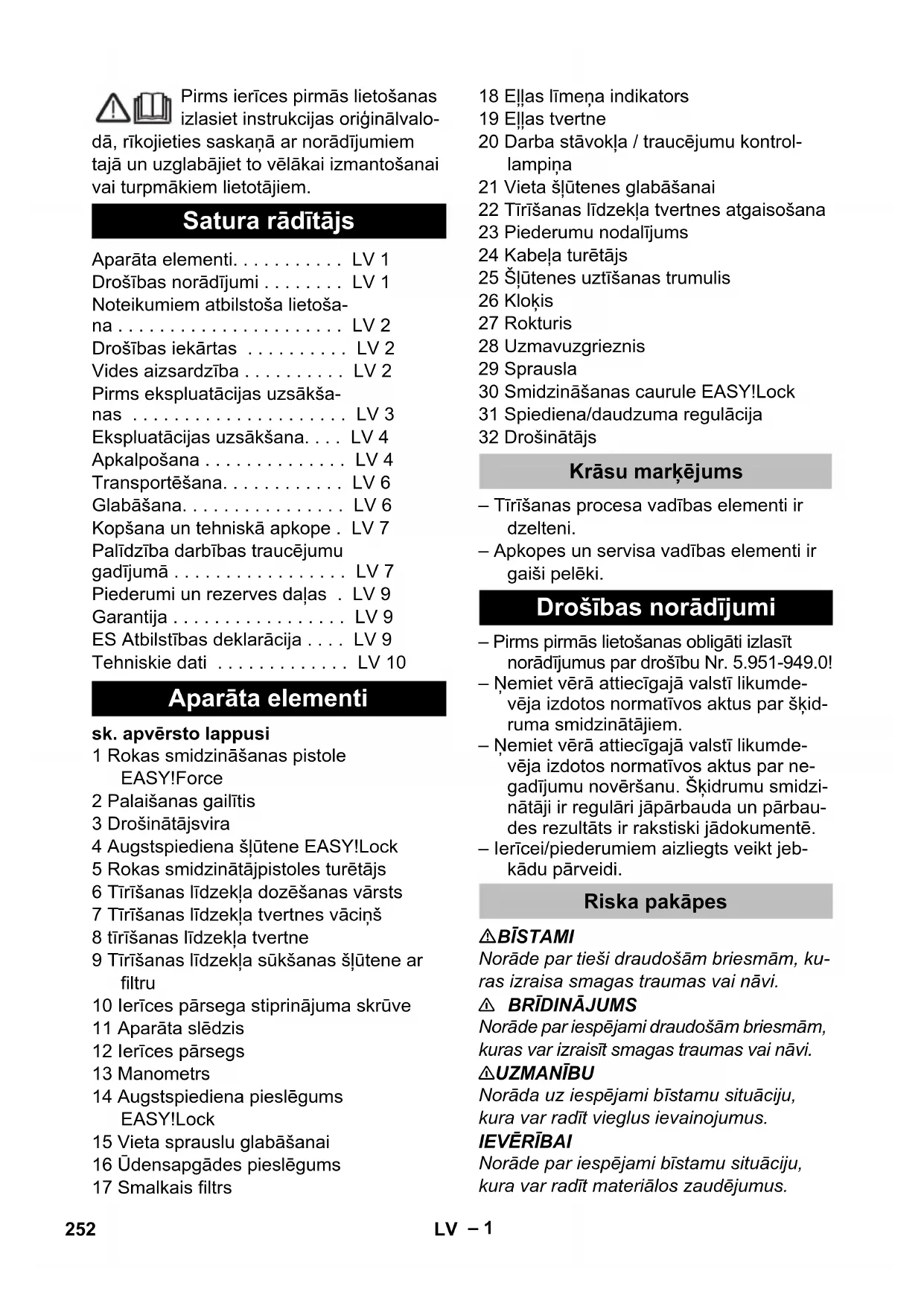 - 1.286-902.0: 75,5 kg; 1.286-903.0: 75,7 kg; 1.286-913.0: 69,1 kg; 1.286-927: 82,5 kg ** 1.286-914.0: 77,5 kg; 1.286-928.0: 86 kg 251ET– 1 Pirms ierīces pirmās lietošanas izlasiet instrukcijas oriģinālvalo- dā, rīkojieties saskaņā ar norādījumiem tajā un uzglabājiet to vēlākai izmantošanai vai turpmākiem lietotājiem. sk. apvērsto lappusi 1 Rokas smidzināšanas pistole EASY!Force 2 Palaišanas gailītis 3 Drošinātājsvira 4 Augstspiediena šļūtene EASY!Lock 5 Rokas smidzinātājpistoles turētājs 6 Tīrīšanas līdzekļa dozēšanas vārsts 7 Tīrīšanas līdzekļa tvertnes vāciņš 8 tīrīšanas līdzekļa tvertne 9 Tīrīšanas līdzekļa sūkšanas šļūtene ar filtru 10 Ierīces pārsega stiprinājuma skrūve 11 Aparāta slēdzis 12 Ierīces pārsegs 13 Manometrs 14 Augstspiediena pieslēgums EASY!Lock 15 Vieta sprauslu glabāšanai 16 Ūdensapgādes pieslēgums 17 Smalkais filtrs 18 Eļļas līmeņa indikators 19 Eļļas tvertne 20 Darba stāvokļa / traucējumu kontrol- lampiņa 21 Vieta šļūtenes glabāšanai 22 Tīrīšanas līdzekļa tvertnes atgaisošana 23 Piederumu nodalījums 24 Kabeļa turētājs 25 Šļūtenes uztīšanas trumulis 26 Kloķis 27 Rokturis 28 Uzmavuzgrieznis 29 Sprausla 30 Smidzināšanas caurule EASY!Lock 31 Spiediena/daudzuma regulācija 32 Drošinātājs – Tīrīšanas procesa vadības elementi ir dzelteni. – Apkopes un servisa vadības elementi ir gaiši pelēki. – Pirms pirmās lietošanas obligāti izlasīt norādījumus par drošību Nr. 5.951-949.0! – Ņemiet vērā attiecīgajā valstī likumde- vēja izdotos normatīvos aktus par šķid- ruma smidzinātājiem. – Ņemiet vērā attiecīgajā valstī likumde- vēja izdotos normatīvos aktus par ne- gadījumu novēršanu. Šķidrumu smidzi- nātāji ir regulāri jāpārbauda un pārbau- des rezultāts ir rakstiski jādokumentē. – Ierīcei/piederumiem aizliegts veikt jeb- kādu pārveidi. BĪSTAMI Norāde par tieši draudošām briesmām, ku- ras izraisa smagas traumas vai nāvi.