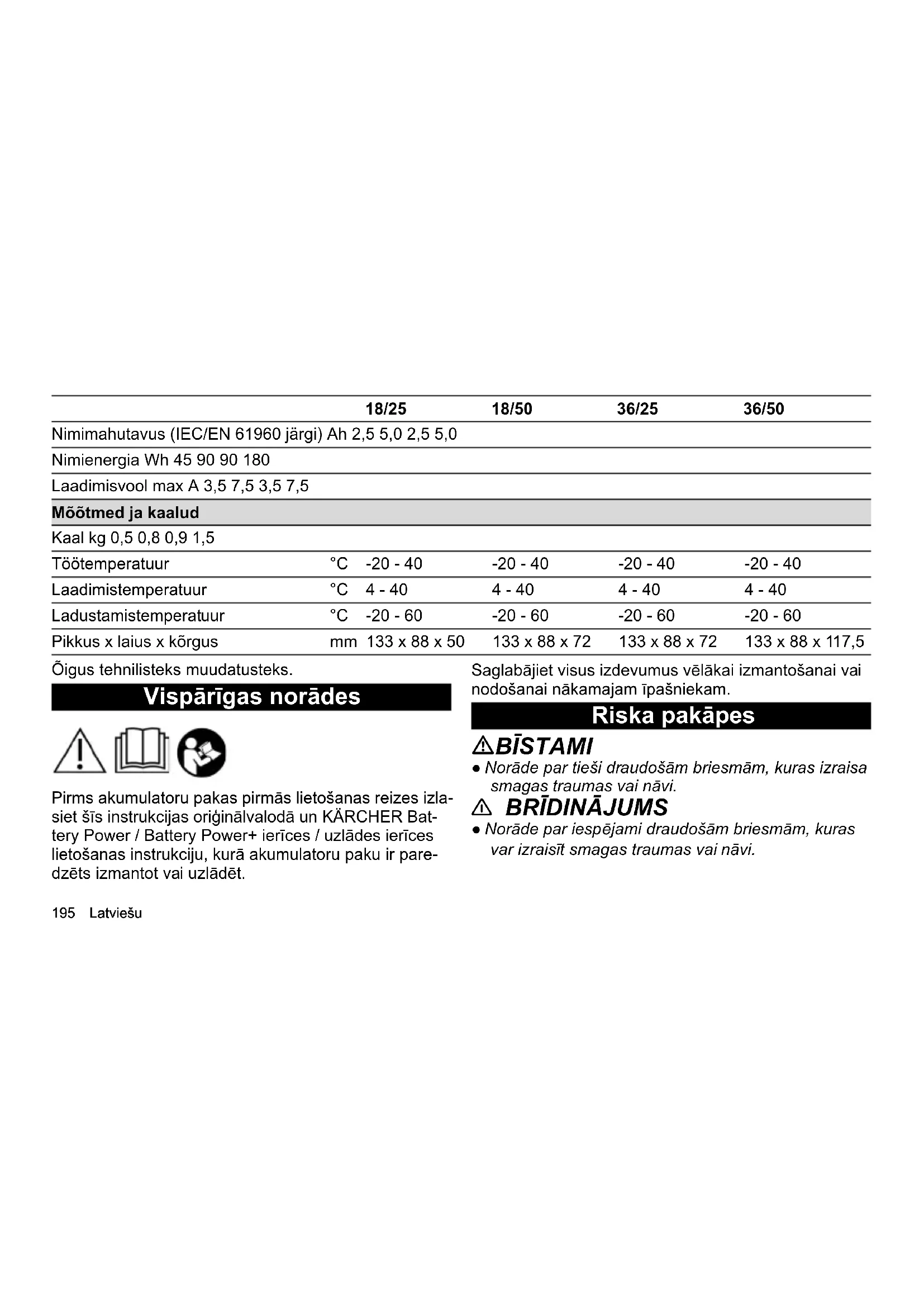 täis. Tehnilised andmed 18/25 18/50 36/25 36/50 Elektriühendus Akupaki nimipinge V 18 18 36 36 Aku platvorm Battery Power Battery Power Battery Power Battery Power Ühildub aku platvormiga Battery Power + Battery Power + Battery Power + Battery Power + Akupaki tüüp Li-ION Li-ION Li-ION Li-ION195 Latviešu Õigus tehnilisteks muudatusteks. Vispārīgas norādes Pirms akumulatoru pakas pirmās lietošanas reizes izla- siet šīs instrukcijas oriģinālvalodā un KÄRCHER Bat- tery Power / Battery Power+ ierīces / uzlādes ierīces lietošanas instrukciju, kurā akumulatoru paku ir pare- dzēts izmantot vai uzlādēt. Saglabājiet visus izdevumus vēlākai izmantošanai vai nodošanai nākamajam īpašniekam. Riska pakāpes BĪSTAMI ● Norāde par tieši draudošām briesmām, kuras izraisa smagas traumas vai nāvi.