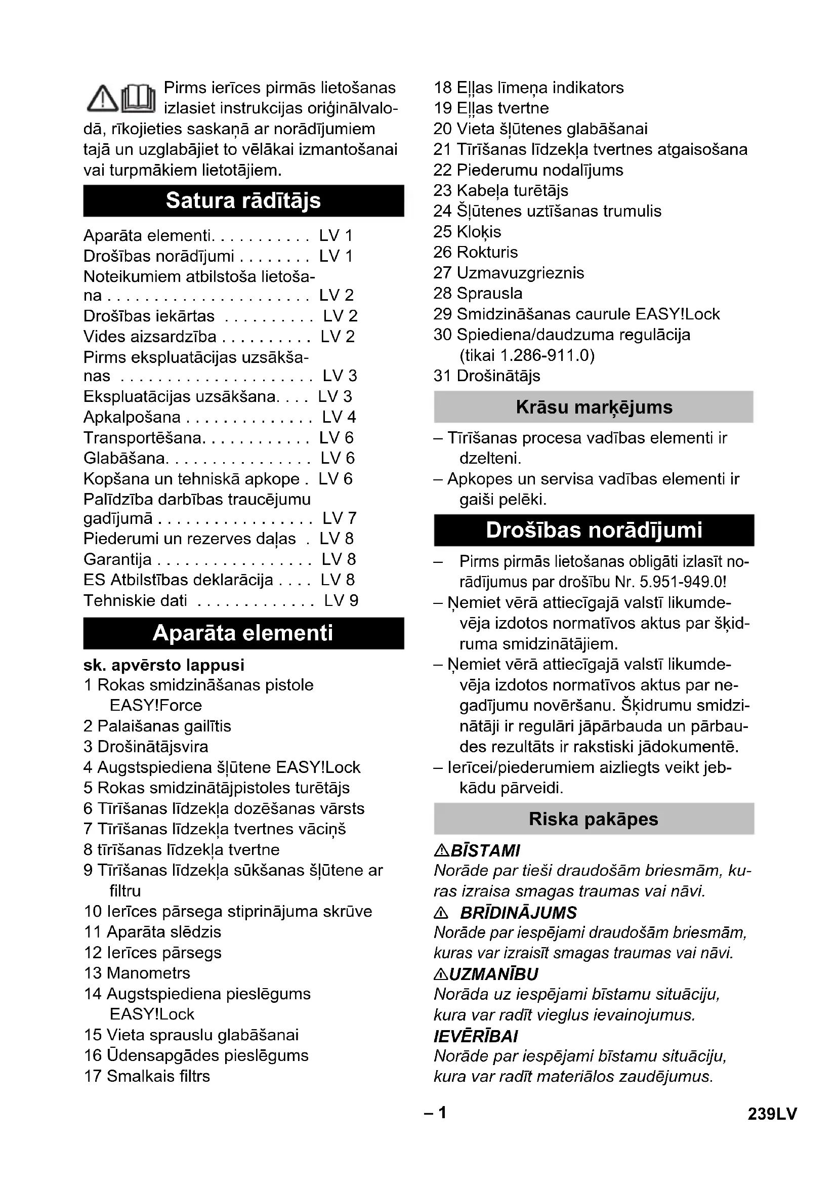 Norāde par iespējami bīstamu situāciju, kura var radīt materiālos zaudējumus. Satura rādītājs Aparāta elementi. . . . . . . . . . . LV 1 Drošības norādījumi . . . . . . . . LV 1 Noteikumiem atbilstoša lietoša- na . . . . . . . . . . . . . . . . . . . . . . LV 2 Drošības iekārtas . . . . . . . . . . LV 2 Vides aizsardzība . . . . . . . . . . LV 2 Pirms ekspluatācijas uzsākša- nas . . . . . . . . . . . . . . . . . . . . . LV 3 Ekspluatācijas uzsākšana. . . . LV 3 Apkalpošana . . . . . . . . . . . . . . LV 4 Transportēšana. . . . . . . . . . . . LV 6 Glabāšana. . . . . . . . . . . . . . . . LV 6 Kopšana un tehniskā apkope . LV 6 Palīdzība darbības traucējumu gadījumā . . . . . . . . . . . . . . . . . LV 7 Piederumi un rezerves daļas . LV 8 Garantija . . . . . . . . . . . . . . . . . LV 8 ES Atbilstības deklarācija . . . . LV 8 Tehniskie dati . . . . . . . . . . . . . LV 9 Aparāta elementi Krāsu marķējums Drošības norādījumi Riska pakāpes 239LV– 2 Nepareizi lietojot, augstspiedie- na strūkla var būt bīstama. Strūk- lu nedrīkst vērst uz cilvēkiem, dzīvniekiem, zem sprieguma esošām elektriskām iekār- tām un uz pašu aparātu. Saskaņā ar spēkā esošajiem no- teikumiem aparātu nedrīkst izman- tot bez dzeramā ūdens sistēmas dalītāja. Jāizmanto piemērots fir- mas KÄRCHER sistēmas dalītājs vai kā al- ternatīva - sistēmas dalītājs atbilstoši EN 12729 tipam BA. Ūdens, kurš ir plūdis cauri sistēmas dalītājam, vairs nav uzskatāms par dzeramo ūdeni. 몇 UZMANĪBU Sistēmas atdalītāju vienmēr pieslēdziet ūdensapgādes sistēmai, nevis ierīcei. Izmantojiet šo augstspiediena tīrīšanas aparātu tikai – tīrīšanai ar zemspiediena strūklu un tīrī- šanas līdzekli (piemēram, iekārtu, transportlīdzekļu, būvju, instrumentu tī- rīšanai), – tīrīšanai ar augstspiediena strūklu bez tīrīšanas līdzekļa (piemēram, fasāžu, terašu, dārza piederumu tīrīšanai). Stingri pielipušu netīrumu noņemšanai mēs kā speciālu piederumu iesakām izmantot netīrumu griezni. Ūdens kvalitātes prasības:
