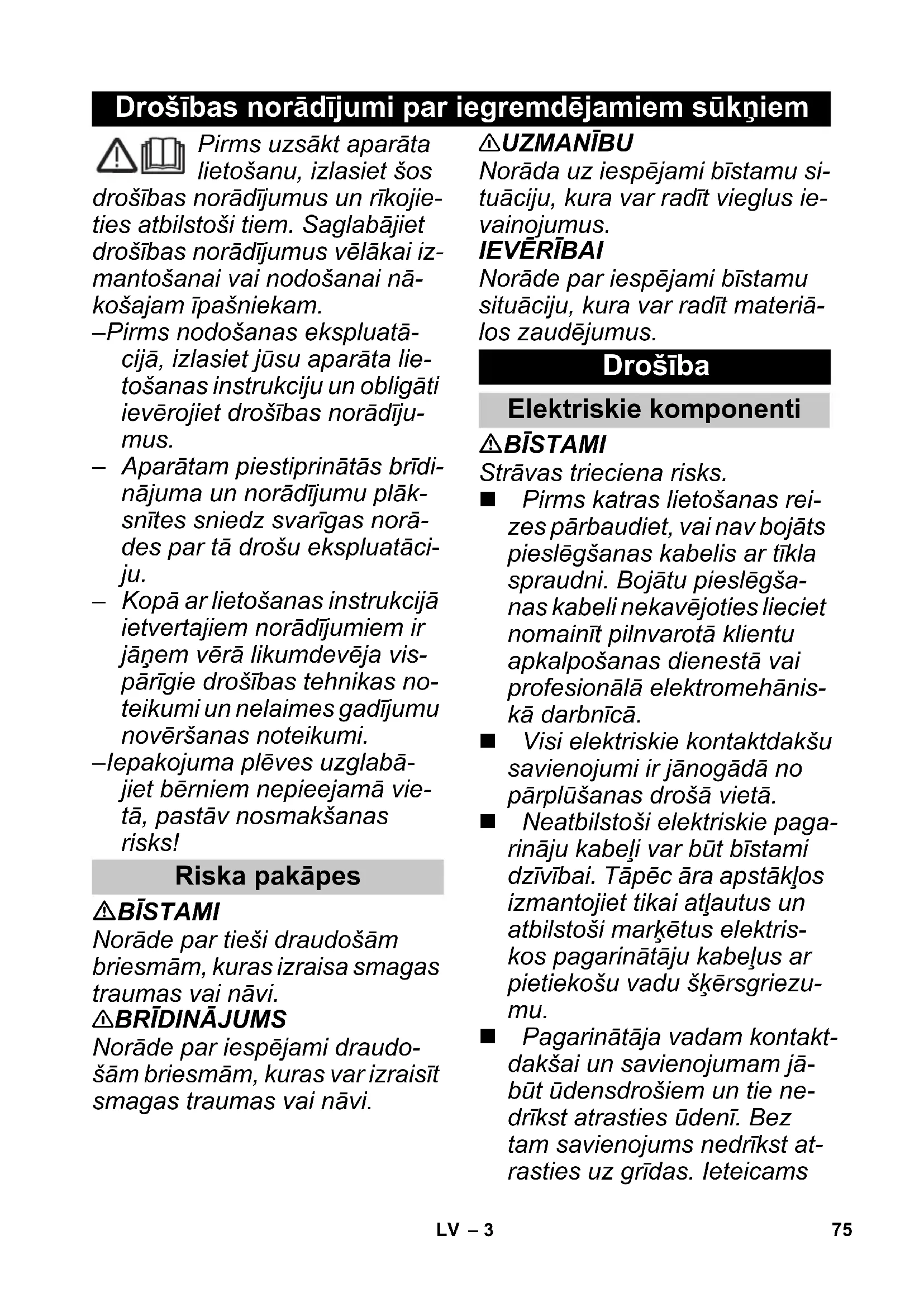 Šis aparāts nav paredzēts, lai to lietotu personas ar ierobe- žotām fiziskām, sensoriskām un garīgām sp ējām vai perso- nas, kurām nav pieredzes un/ vai zināšanu, ja vien viņas uz- rauga par drošību atbildīgā persona vai tā dod instrukci- jas par to, kā jālieto aparāts. Bērni aparātu drīkst lietot tikai tad, ja tie ir sasnieguši 8 gadu vecumu un ja tos uzrauga par viņu drošību atbildīga perso- na vai tā dod instrukcijas par to, kā jālieto aparāts un kuras apzinās no ierīces izrietošās bīstamības sekas. Bērni nedrīkst spēlēties ar ie- rīci. Uzraugiet bērnus, lai pārlieci- nātos, ka tie nespēlējas ar ie- rīci. Droša lietošana 76 LV– 5 Bērni bez pieaugušo uzrau- dzības nedrīkst veikt ierīces tīrīšanu un lietotāja apkopi. Pirms jebkuru apkopes darbu veikšanas ierīci izslēdziet un atvienojiet to no strāvas pa- deves. 몇 UZMANĪBU Pirms jebkuriem darbiem ar ierīci, nodrošiniet stabilu no- vietojumu, lai novērstu nega- dījumus un bojājumus, ko rada ierīces apgāšanās. Lai novērstu ievainojumu gū- šanas risku ierīces pārvieto- šanas laikā, ņemiet vērā ierī- ces svaru (skatiet tehniskos datus). Lai novērstu negadījumu un ievainojumu gūšanas risku, izvēloties ierīces uzglabāša- nas vietu, ņemiet vērā ierīces svaru (skatiet tehniskos da- tus). BĪSTAMI Sprādzienbīstamība Nesūknējiet kodīgus, viegli uzliesmojošus vai eksplozī- vus šķidrumus (piem., petro- leja, benzīns, skābes vai nit- rošķīdinātāji). Nelietojiet aparātu ugunsbīs- tamā un sprādzienbīstamā vi- dē. 몇 UZMANĪBU Ūdens, kas ticis sūknēts ar šo ierīci, nav izmantojams kā dzeramais ūdens!