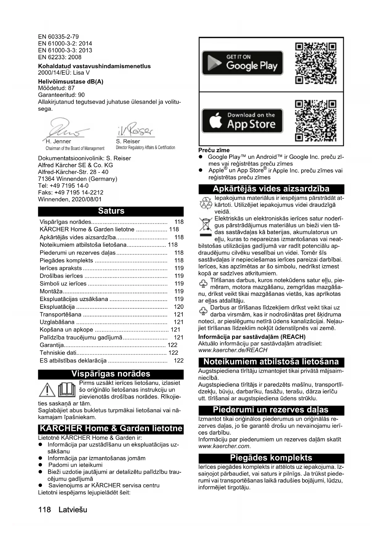 dB(A) 90118 Latviešu EN 60335-2-79 EN 61000-3-2: 2014 EN 61000-3-3: 2013 EN 62233: 2008 Kohaldatud vastavushindamismenetlus 2000/14/EÜ: Lisa V Helivõimsustase dB(A) Mõõdetud: 87 Garanteeritud: 90 Allakirjutanud tegutsevad juhatuse ülesandel ja volitu- sega. Dokumentatsioonivolinik: S. Reiser Alfred Kärcher SE & Co. KG Alfred-Kärcher-Str. 28 - 40 71364 Winnenden (Germany) Tel: +49 7195 14-0 Faks: +49 7195 14-2212 Winnenden, 2020/08/01 Saturs Vispārīgas norādes Pirms uzsākt ierīces lietošanu, izlasiet šo oriģinālo lietošanas instrukciju un pievienotās drošības norādes. Rīkojie- ties saskaņā ar tām. Saglabājiet abus bukletus turpmākai lietošanai vai nā- kamajam īpašniekam. KÄRCHER Home & Garden lietotne Lietotnē KÄRCHER Home & Garden ir: Informācija par uzstādīšanu un ekspluatācijas uz- sākšanu Informācija par izmantošanas jomām Padomi un ieteikumi Bieži uzdotie jautājumi ar detalizētu palīdzību trau- cējumu gadījumā Savienojums ar KÄRCHER servisa centru Lietotni iespējams lejupielādēt šeit: Preču zīme Google Play™ un Android™ ir Google Inc. preču zī- mes vai reģistrētas preču zīmes Apple