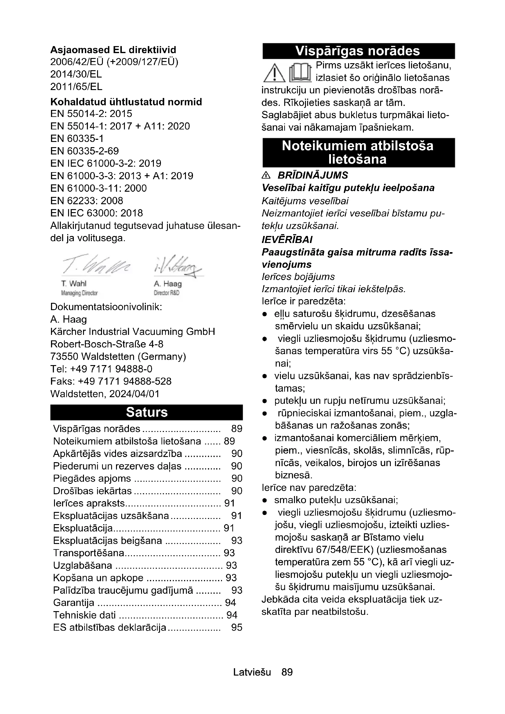 dB(A)222Lietuviškai 95 Paturētas tiesības uz tehniskajām izmai- ņām. ES atbilstības deklarācija Ar šo mēs paziņojam, ka turpmāk tekstā minētās iekārtas projekts un konstrukcija, kā arī mūsu izgatavotais modelis atbilst ES direktīvu drošības un veselības pamatpra- sībām. Veicot ar mums nesaskaņotas iz- maiņas iekārtas uzbūvē, šī deklarācija zaudē savu spēku. Produkts: Sausās sūkšanas putekļsūcējs Produkts: Mitrās un sausās sūkšanas pu- tekļsūcējs Tips: 9.986-xxx Tips: 9.989-xxx Attiecīgās ES direktīvas 2006/42/EK (+2009/127/EK) 2014/30/ES 2011/65/ES Piemērotie saskaņotie standarti EN 55014-2: 2015 EN 55014-1: 2017 + A11: 2020 EN 60335-1 EN 60335-2-69