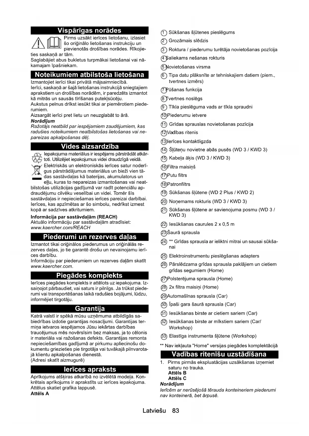 Joonis T Abi rikete korral Riketel on tihti lihtsad põhjused, mille saate ise järgneva ülevaate abil kõrvaldada. Kahtluse korral või siin nime- tamata rikete puhul pöörduge palun volitatud klienditee- ninduse poole. Imivõimsus väheneb Tarvikud, imivoolik või imitorud on ummistunud. Eemaldage ummistus sobiliku abivahendiga. Filterkott on täis. Vahetage filterkott välja. Vahtfilter / padrunfilter on määrdunud. Puhastage vahtfiltrit / padrunfiltrit (vt peatükki Vaht- filtri / padrunfiltri puhastamine). Vahtfilter / padrunfilter on kahjustatud. Vahetage vahtfilter / padrunfilter välja. Tehnilised andmed Märkus Tehnilised andmed leiate tüübisildilt.Latviešu 83 Vispārīgas norādes Pirms uzsākt ierīces lietošanu, izlasiet šo oriģinālo lietošanas instrukciju un pievienotās drošības norādes. Rīkojie- ties saskaņā ar tām. Saglabājiet abus bukletus turpmākai lietošanai vai nā- kamajam īpašniekam. Noteikumiem atbilstoša lietošana Izmantojiet ierīci tikai privātā mājsaimniecībā. Ierīci, saskaņā ar šajā lietošanas instrukcijā sniegtajiem aprakstiem un drošības norādēm, ir paredzēts izmantot kā mitrās un sausās tīrīšanas putekļsūcēju. Aukstus pelnus drīkst iesūkt tikai ar piemērotiem piede- rumiem. Aizsargāt ierīci pret lietu un neuzglabāt to ārā. Norādījum Ražotājs neatbild par iespējamiem zaudējumiem, kas radušies noteikumiem neatbilstošas lietošanas vai ne- pareizas apkalpošanas dēļ. Vides aizsardzība Iepakojuma materiālus ir iespējams pārstrādāt atkār- toti. Utilizējiet iepakojumus videi draudzīgā veidā. Elektriskās un elektroniskās ierīces satur noderī- gus pārstrādājumus materiālus un bieži vien tā- das sastāvdaļas kā baterijas, akumulatorus un eļļu, kuras to nepareizas izmantošanas vai neat- bilstošas utilizācijas gadījumā var radīt potenciālu ap- draudējumu cilvēku veselībai un videi. Tomēr šīs sastāvdaļas ir nepieciešamas ierīces pareizai darbībai. Ierīces, kas apzīmētas ar šo simbolu, nedrīkst izmest kopā ar sadzīves atkritumiem. Informācija par sastā vdaļām (REACH) Aktuālo informāciju par sastāvdaļām atradīsiet: www.kaercher.com/REACH Piederumi un rezerves daļas Izmantot tikai oriģinālos piederumus un oriģinālās re- zerves daļas, jo tie garantē drošu un nevainojamu ierī- ces darbību. Informāciju par piederumiem un rezerves daļām skatīt www.kaercher.com. Piegādes komplekts Ierīces piegādes komplekts ir attēlots uz iepakojuma. Iz- saiņojot pārbaudiet, vai saturs ir pilnīgs. Ja trūkst piede- rumi vai transportēšanas laikā radušies bojājumi, lūdzu, informējiet tirgotāju. Garantija Katrā valstī ir spēkā mūsu uzņēmuma atbildīgās sa- biedrības izdotie garantijas nosacījumi. Garantijas ter- miņa ietvaros iespējamos Jūsu iekārtas darbības traucējumus mēs novērsīsim bez maksas, ja to cēlonis ir materiāla vai ražošanas defekts. Garantijas remonta nepieciešamības gadījumā ar pirkumu apliecinošu do- kumentu griezieties pie tirgotāja vai tuvākajā pilnvarota- jā klientu apkalpošanas dienestā. (Adresi skatīt aizmugurē) Ierīces apraksts Aprīkojums atšķiras atkarībā no izvēlētā modeļa. Kon- krētais aprīkojums ir aprakstīts uz ierīces iepakojuma. Attēlus skatiet grafika lappusē. Attēls A 1 Sūkšanas šļūtenes pieslēgums 2 Grozāmais slēdzis 3 Roktura / piederumu turētāja novietošanas pozīcija 4 Saliekams nešanas rokturis 5 Novietošanas virsma 6 Tipa datu plāksnīte ar tehniskajiem datiem (piem., tvertnes izmērs) 7 Pūšanas funkcija 8 Tvertnes noslēgs 9 Tīkla pieslēguma vads ar tīkla spraudni 10 Piederumu ietvere 11 Grīdas sprauslas novietošanas pozīcija 12 Vadības ritenis 13 Ierīces kontaktligzda 14 Šļūteņu novietne abās pusēs (WD 3 / KWD 3) 15 Kabeļa āķis (WD 3 / KWD 3) 16 Filtra maisiņš 17 Putu filtrs 18 Patronfiltrs 19 Sūkšanas šļūtene (WD 2 Plus / KWD 2) 20 Noņemams rokturis (WD 3 / KWD 3) 21 Sūkšanas šļūtene ar savienojuma posmu (WD 3 / KWD 3) 22 Iesūkšanas caurules 2 x 0,5 m 23 Šaurā sprausla 24 ** Grīdas sprausla ar ieliktni mitrai un sausai sūkša- nai 25 Elektroinstrumentu pieslēgšanas adapters 26 Pārslēdzama grīdas sprausla paklājiem un cietiem grīdas segumiem (Home) 27 Polsterējuma sprausla (Home) 28 2x filtra maisiņi (Home) 29 Automašīnas sprausla (Car) 30 Īpaši gara šaurā sprausla (Car) 31 Iesūkšanas birste ar cietiem sariem (Car) 32 Iesūkšanas birste ar mīkstiem sariem (Car/ Workshop) 33 Elastīga instrumenta šļūtene (Workshop) ** Nav iekļauta "Home" versijas piegādes komplektācijā Vadības ritenīšu uzstādīšana