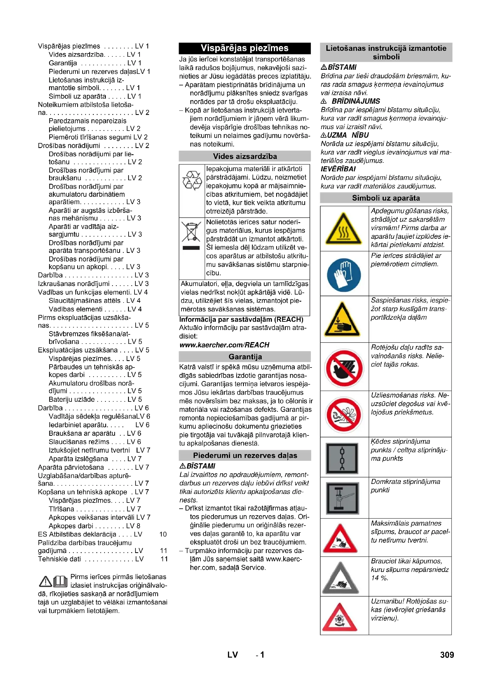 Norāde par iespējami bīstamu situāciju, kura var radīt materiālos zaudējumus. Vispārējas piezīmes . . . . . . . . LV 1 Vides aizsardzība. . . . . . LV 1 Garantija . . . . . . . . . . . . LV 1 Piederumi un rezerves daļasLV 1 Lietošanas instrukcijā iz- mantotie simboli. . . . . . . LV 1 Simboli uz aparāta . . . . . LV 1 Noteikumiem atbilstoša lietoša- na. . . . . . . . . . . . . . . . . . . . . . . LV 2 Paredzamais nepareizais pielietojums . . . . . . . . . . LV 2 Piemēroti tīrīšanas segumi LV 2 Drošības norādījumi . . . . . . . . LV 2 Drošības norādījumi par lie- tošanu . . . . . . . . . . . . . . LV 2 Drošības norādījumi par braukšanu . . . . . . . . . . . LV 2 Drošības norādījumi par akumulatoru darbinātiem aparātiem. . . . . . . . . . . . LV 3 Aparāti ar augstās izbērša- nas mehānismu . . . . . . . LV 3 Aparāti ar vadītāja aiz- sargjumtu . . . . . . . . . . . . LV 3 Drošības norādījumi par aparāta transportēšanu . LV 3 Drošības norādījumi par kopšanu un apkopi. . . . . LV 3 Darbība . . . . . . . . . . . . . . . . . . LV 3 Izkraušanas norādījumi . . . . . . LV 3 Vadības un funkcijas elementi. LV 4 Slaucītājmašīnas attēls . LV 4 Vadības elementi . . . . . . LV 4 Pirms ekspluatācijas uzsākša- nas. . . . . . . . . . . . . . . . . . . . . . LV 5 Stāvbremzes fiksēšana/at- brīvošana . . . . . . . . . . . . LV 5 Ekspluatācijas uzsākšana . . . . LV 5 Vispārējas piezīmes. . . . LV 5 Pārbaudes un tehniskās ap- kopes darbi . . . . . . . . . . LV 5 Akumulatoru drošības norā- dījumi . . . . . . . . . . . . . . . LV 5 Bateriju uzlāde . . . . . . . . LV 5 Darbība . . . . . . . . . . . . . . . . . . LV 6 Vadītāja sēdekļa regulēšanaLV 6 Iedarbiniet aparātu. . . . . LV 6 Braukšana ar aparātu . . LV 6 Slaucīšanas režīms . . . . LV 6 Iztukšojiet netīrumu tvertni LV 7 Aparāta izslēgšana . . . . LV 7 Aparāta pārvietošana . . . . . . . LV 7 Uzglabāšana/darbības apturē- šana. . . . . . . . . . . . . . . . . . . . . LV 7 Kopšana un tehniskā apkope . LV 7 Vispārējas piezīmes. . . . LV 7 Tīrīšana . . . . . . . . . . . . . LV 7 Apkopes v eikšanas intervāli LV 7 Apkopes darbi . . . . . . . . LV 8 ES Atbilstības deklarācija . . . . LV 10 Palīdzība darbības traucējumu gadījumā . . . . . . . . . . . . . . . . . LV 11 Tehniskie dati . . . . . . . . . . . . . LV 11 Vispārējas piezīmes Vides aizsardzība Iepakojuma materiāli ir atkārtoti pārstrādājami. Lūdzu, neizmetiet iepakojumu kopā ar mājsaimnie- cības atkritumiem, bet nogādājiet to vietā, kur tiek veikta atkritumu otrreizējā pārstrāde. Nolietotās ierīces satur noderī- gus materiālus, kurus iespējams pārstrādāt un izmantot atkārtoti. Šī iemesla dēļ lūdzam utilizēt ve- cos aparātus ar atbilstošu atkritu- mu savākšanas sistēmu starpnie- cību. Akumulatori, eļļa, degviela un tamlīdzīgas vielas nedrīkst nokļūt apkārtējā vidē. Lū- dzu, utilizējiet šīs vielas, izmantojot pie- mērotas savākšanas sistēmas. Garantija Piederumi un rezerves daļas Lietošanas instrukcijā izmantotie simboli Simboli uz aparāta Apdegumu gūšanas risks, strādājot uz sakarsētām virsmām! Pirms darba ar aparātu ļaujiet izplūdes ie- kārtai pietiekami atdzist. Pie ierīces strādājiet ar piemērotiem cimdiem. Saspiešanas risks, iespie- žot starp kustīgām trans- portlīdzekļa daļām Rotējošu daļu radīts sa- vainošanās risks. Nelie- ciet tajās rokas. Uzliesmošanas risks. Ne- uzsūciet degošus vai kvē- lojošus priekšmetus. Ķēdes stiprinājuma punkts / celtņa stiprināju- ma punkts Domkrata stiprinājuma punkti Maksimālais pamatnes slīpums, braucot ar pacel- tu netīrumu tvertni. Brauciet tikai kāpumos, kuru slīpums nepārsniedz 14 %. Uzmanību! Rotējošas su- kas (ievēro jiet griešanās virzienu). 309LV- 2 Slaucītājmašīna ir paredzēta komerciālai grīdas virsmu tīrīšanai šādās nozarēs: stāvvietas ražošanas uzņēmumi loģistikas uzņēmumi viesnīcas mazumtirdzniecība noliktavas ietves – Šī slaucītājmašīna ir domāta netīru iekštelpu un ārtelpu platību slaucīšanai. – Pirms lietošanas ir jāpārbauda aparāta un tā darba aprīkojuma pienācīgais stā- voklis un ekspluatācijas drošība. Ja to stāvoklis nav apmierinošs, tad ierīci iz- mantot nav atļauts. – Izmantojiet šo slaucītājmašīnu tikai at- bilstoši šajā instrukcijā ietvertajiem no- rādījumiem. – Aparātu nedrīkst nekādā veidā pārvei- dot. – Aparāts paredzēts tikai lietošanas ins- trukcijā norādītajiem segumiem. – Aparātu ekspluatēt atļauts tikai uz tā- dām virsmām, kuras tīrīšanu ir atļāvis uzņēmējs vai tā pilnvarota persona. – Vispārēji attiecas: Viegli uzliesmojošas vielas turēt nostāk no aparāta (sprā- dziena/ugunsgrēka bīstamība). Nekad neuzsūciet/neieslauciet sprā- dzienbīstamus šķidrumus, degošas gā- zes, kā arī neatšķaidītas skābes un šķī- dinātājus! Pie tādiem attiecas benzīns, krāsas atšķaidītāji vai mazuts, kuri, sa- jaucoties ar iesūcamo gaisu, var veidot sprādzienbīstamus izgarojumus vai sa- jaukumus, bez tam arī acetons, neat- šķaidītas skābes un šķīdinātāji, tā kā tie iedarbojas uz apparātā pielietotajiem materiāliem. Nekad neuzslaukiet/neuzsūciet reaktī- vus metāla putekļus (piem., alumīnijs, magnijs, cinks), jo savienojumā ar stipri sārmainiem vai skābiem tīrīšanas lī- dzekļiem tie veido eksplozīvas gāzes. Neuzsūciet/nesaslauciet degošus vai kvēlojošus priekšmetus. Šis aparāts nav piemērots veselībai bīstamu vielu saslaucīšanai. Uzturēšanās bīstamā zonā ir aizliegta. Ierīces izmantošana sprādzienbīsta- mās telpās ir aizliegta. Nav pieļaujams ņemt līdz pavadošās personas. Priekšmetu stumšana/vilkšana vai transportēšana ar šo aparātu nav atļau- ta. –Asfalts – Rūpnieciskās ražošanas telpu grīda – Klona vir