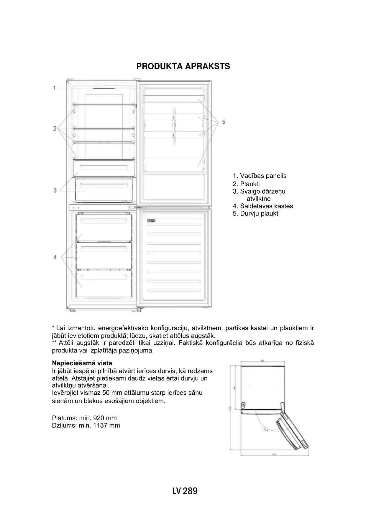 - Lai izmantotu energoefektīvāko konfigurāciju, atvilktnēm, pārtikas kastei un plauktiem ir jābūt ievietotiem produktā; lūdzu, skatiet attēlus augstāk. ** Attēli augstāk ir paredzēti tikai uzziņai. Faktiskā konfigurācija būs atkarīga no fiziskā produkta vai izplatītāja paziņojuma. Nepieciešamā vieta Ir jābūt iespējai pilnībā atvērt ierīces durvis, kā redzams attēlā. Atstājiet pietiekami daudz vietas ērtai durvju un atvilktņu atvēršanai. Ievērojiet vismaz 50 mm attālumu starp ierīces sānu sienām un blakus esošajiem objektiem. Platums: min. 920 mm Dziļums: min. 1137 mmLV 290 LIETOŠANA A. Ieslēgšanas/izslēgšanas taustiņš — tiek izmantots, lai ieslēgtu/izslēgtu ierīci B. Wi-Fi taustiņš — tiek izmantots, lai ieslēgtu/izslēgtu Wi-Fi C. Mode taustiņš — tiek izmantots, lai izvēlētos vajadzīgo funkciju D. Taustiņš TEMP — tiek izmantots, lai izvēlētos ledusskapja un saldētavas temperatūru a. Ledusskapja/saldētavas zonas ikona — rāda, kurš ierīces nodalījums ir izvēlēts b. Super Freeze ikona — rāda, vai ir aktivizēta funkcija Super Freeze c. Saldētavas temperatūras līmeņi — rāda saldētavas nodalījumam atlasīto temperatūru d. Super Cool ikona — rāda, vai funkcija Super Cool ir aktivizēta e. Ledusskapja temperatūras līmeņi — rāda atlasīto temperatūru f. Pielāgotās temperatūras ikona — rāda, vai temperatūra ir atlasīta lietotnē g. Eko režīma ikona — rāda, vai ir aktivizēts eco režīms h. Funkcijas Holiday ikona — rāda, vai ir aktivizēta funkcija Holiday
