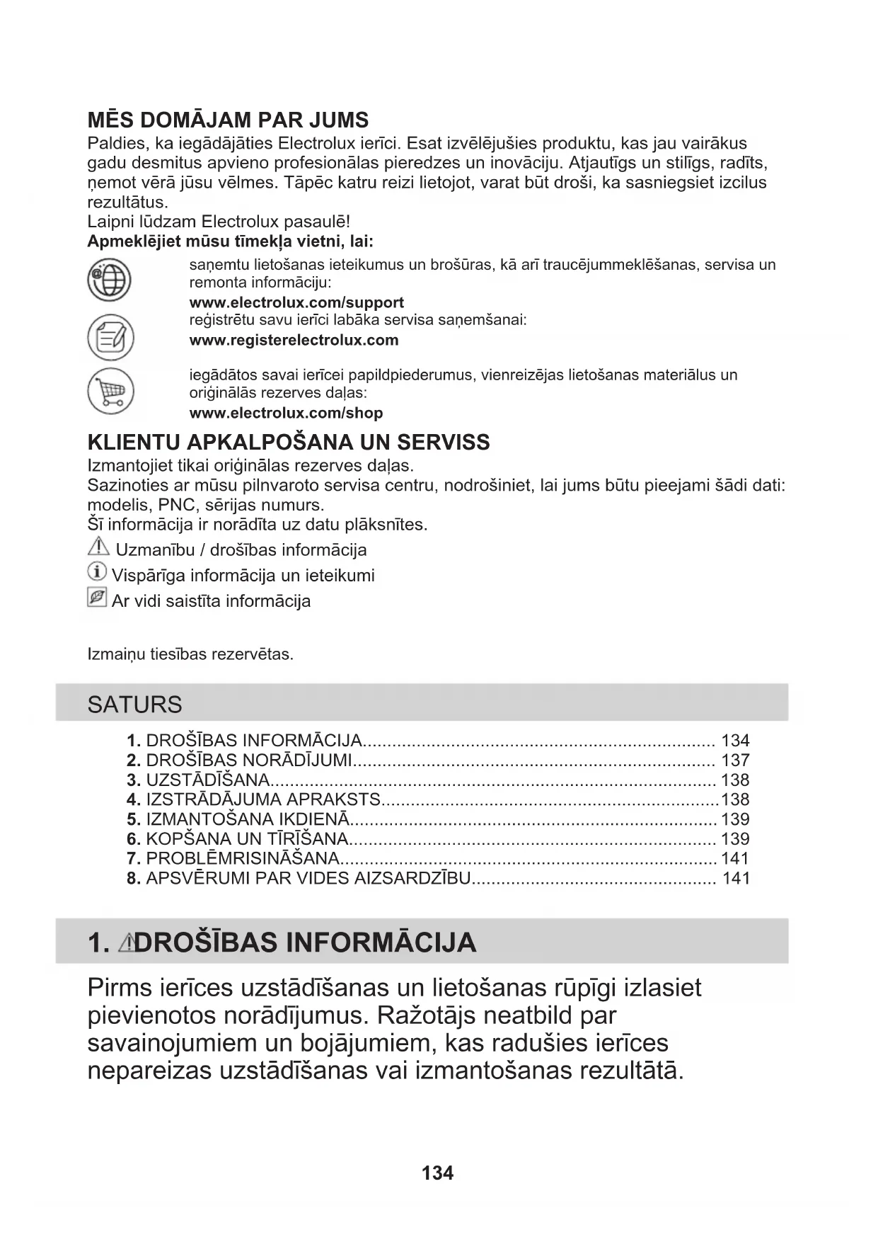Paldies, ka iegādājāties Electrolux ierīci. Esat izvēlējušies produktu, kas jau vairākusgadu desmitus apvieno profesionālas pieredzes un inovāciju. Atjautīgs un stilīgs, radīts,ņemot vērā jūsu vēlmes. Tāpēc katru reizi lietojot, varat būt droši, ka sasniegsiet izcilusrezultātus.Laipni lūdzam Electrolux pasaulē!Apmeklējiet mūsu tīmekļa vietni, lai:saņemtu lietošanas ieteikumus un brošūras, kā arī traucējummeklēšanas, servisa unremonta informāciju:www.electrolux.com/supportreģistrētu savu ierīci labāka servisa saņemšanai:www.registerelectrolux.comiegādātos savai ierīcei papildpiederumus, vienreizējas lietošanas materiālus unoriģinālās rezerves daļas:www.electrolux.com/shop