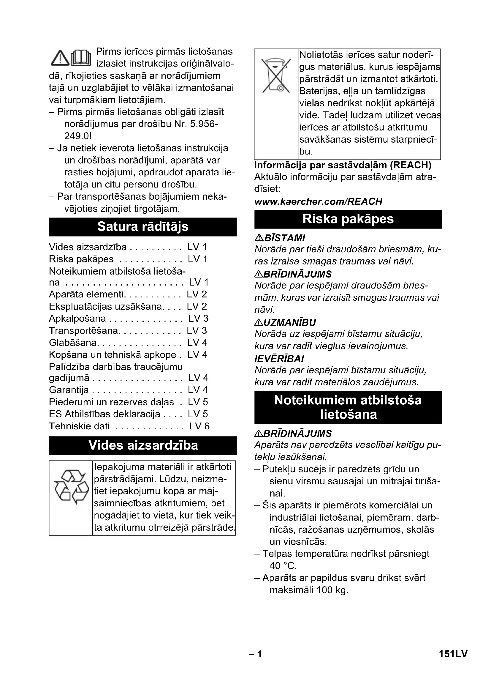 Aparāts nav paredzēts veselībai kaitīgu pu- tekļu ies ūkšanai. – Putekļu sūcējs ir paredzēts grīdu un sienu virsmu sausajai un mitrajai tīrīša- nai. – Šis aparāts ir piemērots komerciālai un industriālai lietošanai, piemēram, darb- nīcās, ražošanas uzņēmumos, skolās un viesnīcās. – Telpas temperatūra nedrīkst pārsniegt 40 °C. – Aparāts ar papildus svaru drīkst svērt maksimāli 100 kg. Satura rādītājs Vides aizsardzība . . . . . . . . . . LV 1 Riska pakāpes . . . . . . . . . . . . LV 1 Noteikumiem atbilstoša lietoša- na . . . . . . . . . . . . . . . . . . . . . . LV 1 Aparāta elementi. . . . . . . . . . . LV 2 Ekspluatācijas uzsākšana. . . . LV 2 Apkalpošana . . . . . . . . . . . . . . LV 3 Transportēšana. . . . . . . . . . . . LV 3 Glabāšana. . . . . . . . . . . . . . . . LV 4 Kopšana un tehniskā apkope . LV 4 Palīdzība darbības traucējumu gadījumā . . . . . . . . . . . . . . . . . LV 4 Garantija . . . . . . . . . . . . . . . . . LV 4 Piederumi un rezerves daļas . LV 5 ES Atbilstības deklarācija . . . . LV 5 Tehniskie dati . . . . . . . . . . . . . LV 6 Vides aizsardzība Iepakojuma materiāli ir atkārtoti pārstrādājami. Lūdzu, neizme- tiet iepakojumu kopā ar māj- saimniecības atkritumiem, bet nogādājiet to vietā, kur tiek veik- ta atkritumu otrreizējā pārstrāde. Nolietotās ierīces satur noderī- gus materiālus, kurus iespējams pārstrādāt un izmantot atkārtoti. Baterijas, eļļa un tamlīdzīgas vielas nedrīkst nokļūt apkārtējā vidē. Tādēļ lūdzam utilizēt vecās ierīces ar atbilstošu atkritumu savākšanas sistēmu starpniecī- bu. Riska pakāpes Noteikumiem atbilstoša lietošana 151LV– 2 1 Zvaigznes formas skrūve 2 Patronfiltrs 3 Mehāniskā pārplūdes aizsardzības sis- tēma 4 Sūkšanas galviņa 5 Sūkšanas šļūtene 6 Vadāmais rokturis 7 Kabeļa āķis 8 Sūkšanas galviņas fiksators 9 Netīrumu tvertne 10 Sūkšanas uzgalis 11 Sagāžami ratiņi 12 Tvertnes rokturis 13 Vadrullītis 14 Sprausla grīdas tīrīšanai 15 Sūkšanas caurule 16 Rokturis aparāta pārnēsāšanai 17 Līkums 18 2. sūkšanas turbīnas slēdzis 19 1. sūkšanas turbīnas slēdzis 20 3. sūkšanas turbīnas slēdzis 21 Grīdas sprauslas glabāšanas nodalī- jums 22 Noteces šļūtene 23 Sūkšanas cauruļu turētājs 24 Turētājs uzgalim savienojumu tīrīšanai 25 Tīkla kabelis 26 Datu plāksnīte