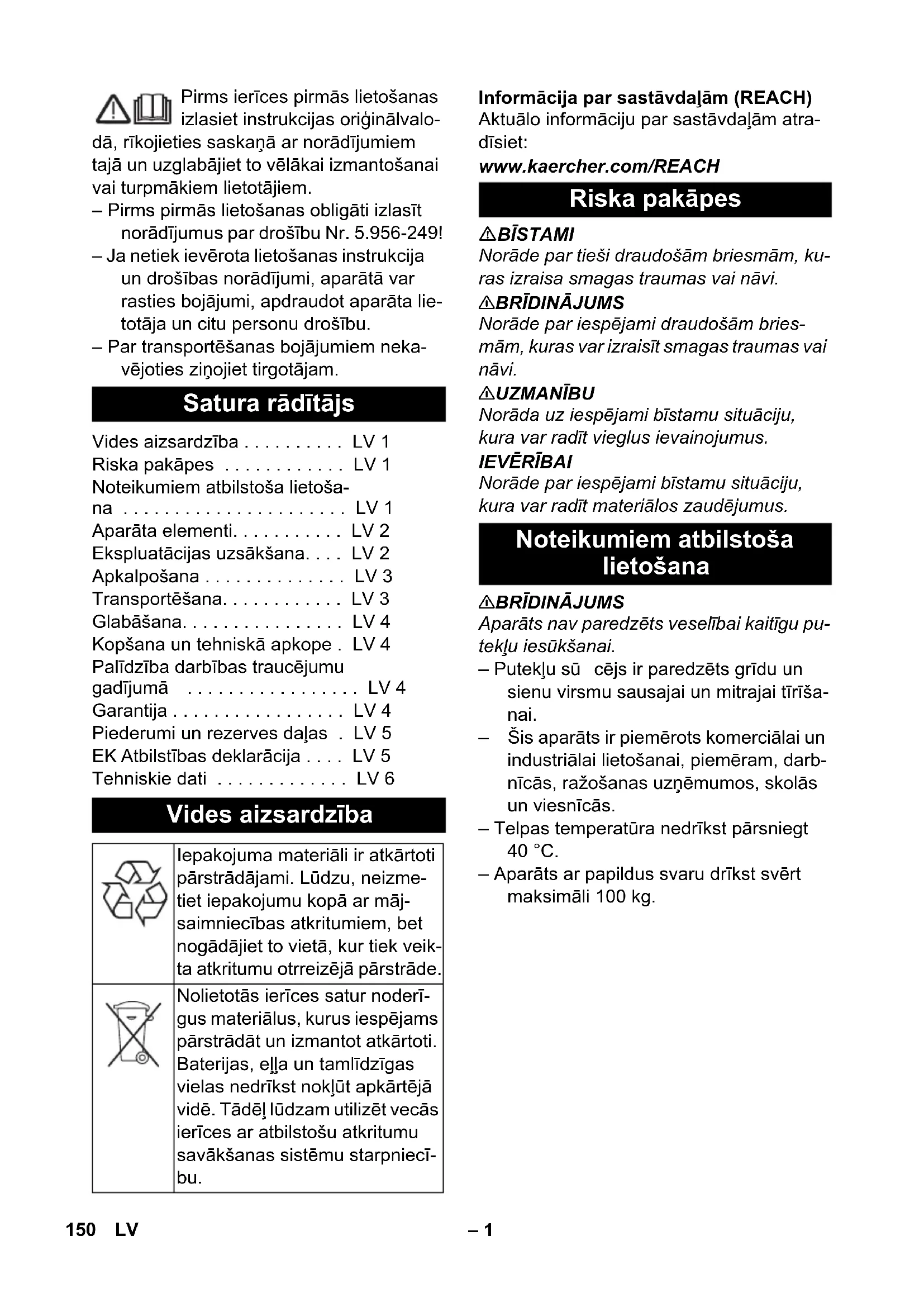 Aparāts nav paredzēts veselībai kaitīgu pu- tekļu iesūkšanai. – Putekļu sū cējs ir paredzēts grīdu un sienu virsmu sausajai un mitrajai tīrīša- nai. – Šis aparāts ir piemērots komerciālai un industriālai lietošanai, piemēram, darb- nīcās, ražošanas uzņēmumos, skolās un viesnīcās. – Telpas temperatūra nedrīkst pārsniegt 40 °C. – Aparāts ar papildus svaru drīkst svērt maksimāli 100 kg. Satura rādītājs Vides aizsardzība . . . . . . . . . . LV 1 Riska pakāpes . . . . . . . . . . . . LV 1 Noteikumiem atbilstoša lietoša- na . . . . . . . . . . . . . . . . . . . . . . LV 1 Aparāta elementi. . . . . . . . . . . LV 2 Ekspluatācijas uzsākšana. . . . LV 2 Apkalpošana . . . . . . . . . . . . . . LV 3 Transportēšana. . . . . . . . . . . . LV 3 Glabāšana. . . . . . . . . . . . . . . . LV 4 Kopšana un tehniskā apkope . LV 4 Palīdzība darbības traucējumu gadījumā . . . . . . . . . . . . . . . . . LV 4 Garantija . . . . . . . . . . . . . . . . . LV 4 Piederumi un rezerves daļas . LV 5 EK Atbilstības deklarācija . . . . LV 5 Tehniskie dati . . . . . . . . . . . . . LV 6 Vides aizsardzība Iepakojuma materiāli ir atkārtoti pārstrādājami. Lūdzu, neizme- tiet iepakojumu kopā ar māj- saimniecības atkritumiem, bet nogādājiet to vietā, kur tiek veik- ta atkritumu otrreizējā pārstrāde. Nolietotās ierīces satur noderī- gus materiālus, kurus iespējams pārstrādāt un izmantot atkārtoti. Baterijas, eļļa un tamlīdzīgas vielas nedrīkst nokļūt apkārtējā vidē. Tādēļ lūdzam utilizēt vecās ierīces ar atbilstošu atkritumu savākšanas sistēmu starpniecī- bu. Riska pakāpes Noteikumiem atbilstoša lietošana 150 LV– 2 1 Zvaigznes formas skrūve 2 Patronfiltrs 3 Mehāniskā pārplūdes aizsardzības sis- tēma 4Sūkšanas galviņa 5Sūkšanas šļūtene 6 Vadāmais rokturis 7 Kabeļa āķis 8Sūkšanas galviņas fiksators 9 Netīrumu tvertne 10 Sūkšanas uzgalis 11 Vadrullītis 12 Ritošā daļa 13 Ritošās daļas rokturis 14 Sprausla grīdas tīrīšanai 15 Sūkšanas caurule 16 Rokturis aparāta pārnēsāšanai 17 Līkums 18 2. sūkšanas turbīnas slēdzis 19 1. sūkšanas turbīnas slēdzis 20 3. sūkšanas turbīnas sl ēdzis 21 Grīdas sprauslas glabāšanas nodalī- jums 22 Noteces šļūtene 23 Sūkšanas cauruļu turētājs 24 Turētājs uzgalim savienojumu tīrīšanai 25 Tīkla kabelis 26 Datu plāksnīte