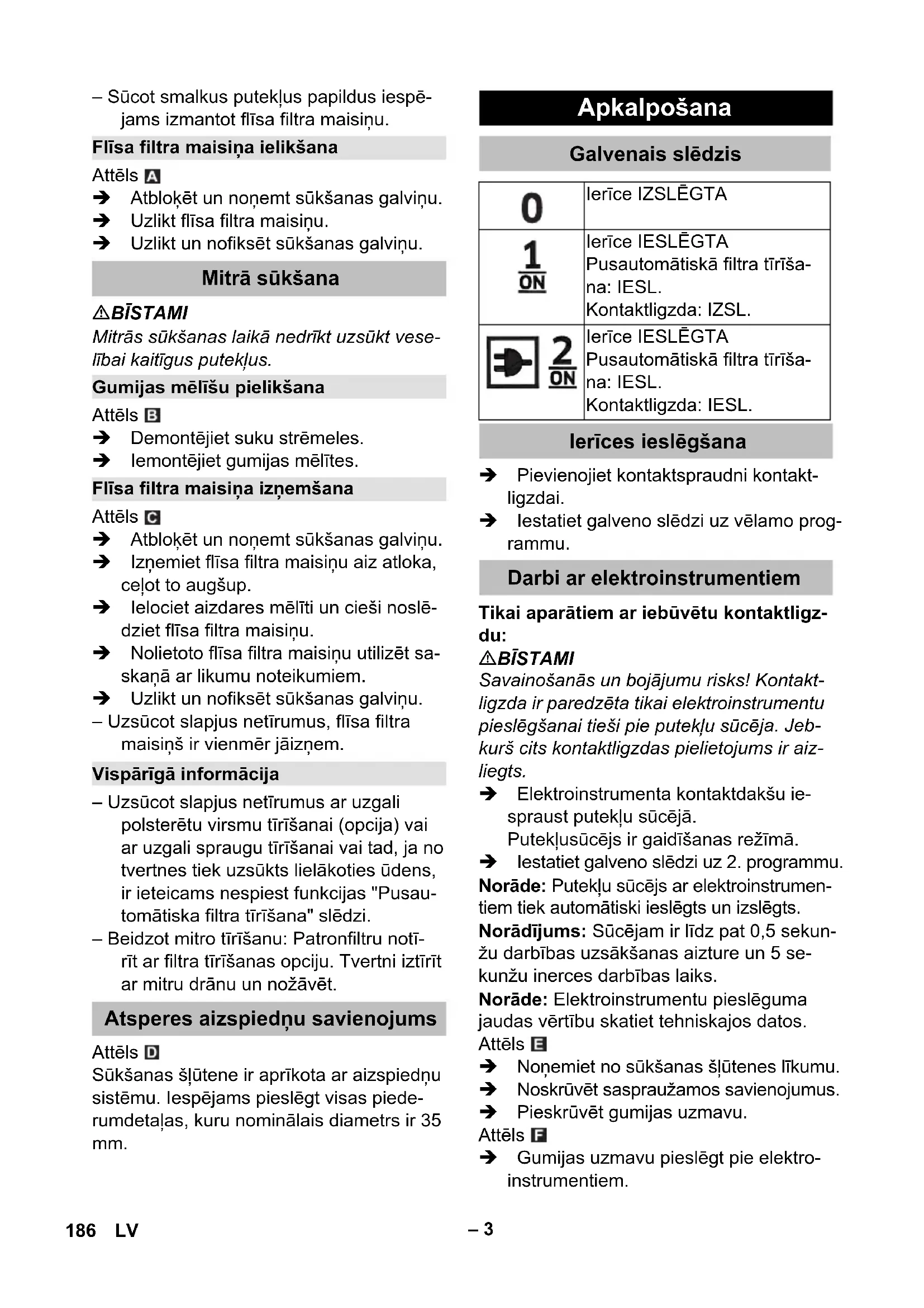 Norāde par iespējami bīstamu situāciju, kura var radīt materiālos zaudējumus. – Putekļu sūcējs ir paredzēts grīdu un sienu virsmu sausajai un mitrajai tīrīša- nai. – Aparāts ir piemērots sausu, nedegošu, veselībai kaitīgu putekļu nosūkšanai no mašīnām un iekārtām; putekļu klase L saskaņā ar EN 60 335–2–69. Ierobežo- jums: Nav atļauts uzsūkt kancerogēnas vielas. – Šis aparāts ir piemērots profesionālai lietošanai, piemēram, viesnīcās, sko- lās, slimnīcās, fabrikās, veikalos, biro- jos un iznomāšanas uzņēmumos. Satura rādītājs Vides aizsardzība . . . . . . . . . . LV 1 Riska pakāpes . . . . . . . . . . . . LV 1 Noteikumiem atbilstoša lietoša- na . . . . . . . . . . . . . . . . . . . . . . LV 1 Aparāta elementi. . . . . . . . . . . LV 2 Simboli uz aparāta . . . . . . . . . LV 2 Drošības norādījumi . . . . . . . . LV 2 Ekspluatācijas uzsākšana. . . . LV 2 Apkalpošana . . . . . . . . . . . . . . LV 3 Transportēšana. . . . . . . . . . . . LV 4 Glabāšana. . . . . . . . . . . . . . . . LV 4 Kopšana un tehniskā apkope . LV 4 Palīdzība darbības traucējumu gadījumā . . . . . . . . . . . . . . . . . LV 5 Garantija . . . . . . . . . . . . . . . . . LV 6 Piederumi un rezerves daļas . LV 6 ES Atbilstības deklarācija . . . . LV 6 Tehniskie dati . . . . . . . . . . . . . LV 7 Vides aizsardzība Iepakojuma materiāli ir atkārtoti pārstrādājami. Lūdzu, neizme- tiet iepakojumu kopā ar māj- saimniecības atkritumiem, bet nogādājiet to vietā, kur tiek veik- ta atkritumu otrreizējā pārstrāde. Nolietotās ierīces satur noderī- gus materiālus, kurus iespējams pārstrādāt un izmantot atkārtoti. Baterijas, eļļa un tamlīdzīgas vielas nedrīkst nokļūt apkārtējā vidē. Tādēļ lūdzam utilizēt vecās ierīces ar atbilstošu atkritumu savākšanas sistēmu starpniecī- bu. Riska pakāpes Noteikumiem atbilstoša lietošana 184 LVloading-circle-1– 3 – Sūcot smalkus putekļus papildus iespē- jams izmantot flīsa filtra maisiņu. Attēls Atbloķēt un noņemt sūkšanas galviņu. Uzlikt flīsa filtra maisiņu. Uzlikt un nofiksēt sūkšanas galviņu. BĪSTAMI Mitrās sūkšanas laikā nedrīkt uzsūkt vese- lībai kaitīgus putekļus. Attēls Demontējiet suku strēmeles. Iemontējiet gumijas mēlītes. Attēls Atbloķēt un noņemt sūkšanas galviņu. Izņemiet flīsa filtra maisiņu aiz atloka, ceļot to augšup. Ielociet aizdares mēlīti un cieši noslē- dziet flīsa filtra maisiņu. Nolietoto flīsa filtra maisiņu utilizēt sa- skaņā ar likumu noteikumiem. Uzlikt un nofiksēt sūkšanas galviņu. – Uzsūcot slapjus netīrumus, flīsa filtra maisiņš ir vienmēr jāizņem. – Uzsūcot slapjus netīrumus ar uzgali polsterētu virsmu tīrīšanai (opcija) vai ar uzgali spraugu tīrīšanai vai tad, ja no tvertnes tiek uzsūkts lielākoties ūdens, ir ieteicams nespiest funkcijas "Pusau- tomātiska filtra tīrīšana" slēdzi. – Beidzot mitro tīrīšanu: Patronfiltru notī- rīt ar filtra tīrīšanas opciju. Tvertni iztīrīt ar mitru drānu un nožāvēt. Attēls Sūkšanas šļūtene ir aprīkota ar aizspiedņu sistēmu. Iespējams pieslēgt visas piede- rumdetaļas, kuru nominālais diametrs ir 35 mm. Pievienojiet kontaktspraudni kontakt- ligzdai. Iestatiet galveno slēdzi uz vēlamo prog- rammu. Tikai aparātiem ar iebūvētu kontaktligz- du: BĪSTAMI Savainošanās un bojājumu risks! Kontakt- ligzda ir paredzēta tikai elektroinstrumentu pieslēgšanai tieši pie putekļu sūcē ja. Jeb- kurš cits kontaktligzdas pielietojums ir aiz- liegts. Elektroinstrumenta kontaktdakšu ie- spraust putekļu sūcējā. Putekļusūcējs ir gaidīšanas režīmā. Iestatiet galveno slēdzi uz 2. programmu. Norāde: Putekļu sūcējs ar elektroinstrumen- tiem tiek automātiski ieslēgts un izslēgts. Norādījums: Sūcējam ir līdz pat 0,5 sekun- žu darbības uzsākšanas aizture un 5 se- kunžu inerces darbības laiks. Norāde: Elektroinstrumentu pieslēguma jaudas vērtību skatiet tehniskajos datos. Attēls Noņemiet no sūkšanas šļūtenes līkumu. Noskrūvēt saspraužamos savienojumus. Pieskrūvēt gumijas uzmavu. Attēls Gumijas uzmavu pieslēgt pie elektro- instrumentiem. Flīsa filtra maisiņa ielikšana Mitrā sūkšana Gumijas mēlīšu pielikšana Flīsa filtra maisiņa izņemšana Vispārīgā informācija Atsperes aizspiedņu savienojums Apkalpošana Galvenais slēdzis Ierīce IZSLĒGTA Ierīce IESLĒGTA Pusautomātiskā filtra tīrīša- na: IESL. Kontaktligzda: IZSL. Ierīce IESLĒGTA Pusautomātiskā filtra tīrīša- na: IESL. Kontaktligzda: IESL. Ierīces ieslēgšana Darbi ar elektroinstrumentiem 186 LV– 4 Norādījums: Filtra tīrīšanas opcijas izman- tošana ik pēc 5-10 minūtēm, paildzina pat- ronfiltra darbūžu. Norāde: Pusautomātiskās filtra tīrīšanas ieslēgšana iespējama tikai tad, ja ir ieslēgts aparāts. 5x nospiediet pusautomātiskās filtra tīrī- šanas taustiņu. Patronfiltrs tādējādi tiek iztīrīts ar gais plūsmas starpniecību (pulsējoša skaņa). "Power" tīrīšana (filtra īpaši liela piesār- ņojuma gadījumā): Noslēdziet sūkša- nas cauruli vai līkumu ar roku un vien- laikus 5x nospiediet pusautomātiskās filtra tīrīšanas pogu. 몇 UZMANĪBU Ievērojiet notekūdeņu attīrīšanas vietējos noteikumus. – Sūkšanas kanāls ir aprīkots ar pludiņu. – Ja tvertnē ir sasniegts maksimāli pie- ļaujamais netīrā ūdens līmenis, sūkša- nas strāva tiek atvienota. Izslēdziet aparāta galveno slēdzi. 5x nospiediet pusautomātiskās filtra tīrī- šanas slēdzi. Izslēdziet aparāta galveno slēdzi. Izņemt tīkla kontaktdakšu. Iztukšojiet tvertni. Aparātu no ārpuses un no iekšpuses iz- tīriet, to nosūcot un notīrot ar mitru lupa- tiņu. Attēls Sūkšanas caurules, sūkšanas šļūteni un elektrības vadu uzglabājiet atbilstoši attēlam. Novietojiet aparātu sausā telpā un no- drošiniet to pret n