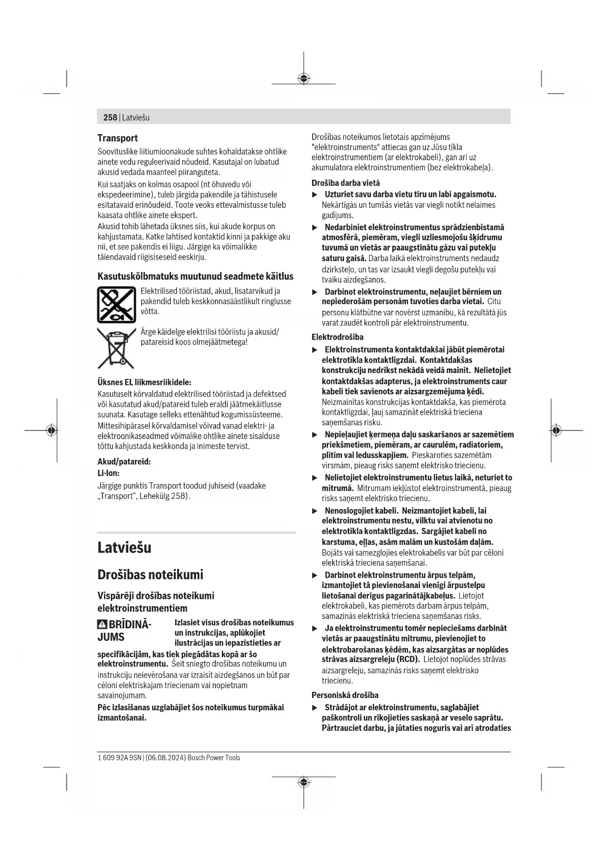 Individuaalselt seatavate pöördemomentide tähistamiseks võite märgistusrõnga (17) teist värvi märgistusrõnga vastu välja vahetada. – Suruge märgistusrõngast (17) kitsa kruvikeerajapea, spaatli või muu sarnasega. Sisse-/väljalülitamine Kruvikeerajatel on pöördemomendist sõltuv väljalülitussidur, mis on etteantud vahemikus seatav. See rakendub seatud pöördemomendi saavutamisel. – Elektrilise tööriista sisselülitamiseks vajutage sisse-/ väljalülitit(10) kuni piirikuni. – Elektriline tööriist lülitub automaatselt välja, kui seatud pöördemoment on saavutatud. u Sisse-/väljalüliti(10) enneaegsel vabastamisel ei saavutata eelseatud pöördemomenti. u Kontrollige keermesühendusel regulaarselt pingutusmomenti ja seadistage vajaduse korral väljalülitussidur uuesti. Töövalgusti sisselülitamine Töövalgusti (13) võimaldab ebasobivates valgustusoludes valgustada kruvimiskohta. Töövalgusti (13) lülitate sisse sisse-/väljalülitit (10) kergelt vajutades. Kui vajutate sisse-/ väljalülitit tugevamini, lülitub seade sisse ja töövalgusti põleb edasi. u Ärge vaadake otse töövalgustisse, see võib teid pimestada. Tööjuhised u Asetage elektriline tööriist mutrile/kruvile ainult väljalülitatult. Pöörlevad vahetatavad tööriistad võivad maha libiseda. Keermesühenduste näidik (roheline/punane LED) Eelseatud pöördemomendi saavutamisel rakendub väljalülitussidur. LED-näidik (7) põleb roheliselt. Kui eelseatud pöördemomenti ei saavutatud, süttib LED- näidik (7) punaselt ja kõlab helisignaal. Keermesühendamit tuleb korrata. Kordamiskaitse Kui keermesühendamisel rakendus väljalülitussidur, lülitub mootor välja. Taassisselülitamine on võimalik alles 0,7 sekundilise pausi järel. Nii väldite juba valmis keermesühenduse juhuslikku järelpingutamist. Hooldus ja korrashoid Hooldus ja puhastus u Võtke aku enne kõiki töid elektrilise tööriista juures (ny hooldus, tööriistavahetus jms) elektrilisest tööriistast välja. Sisse-/väljalüliti juhusliku rakendamise korral on vigastumisoht. u Seadme laitmatu ja ohutu töö tagamiseks hoidke seade ja selle ventilatsiooniavad puhtad. Elektrilise tööriista määrimine Määrdeaine: Spetsiaalne reduktorimääre (225 ml) Tootenumber 3 605 430 009 Määre Molykote Motoriõli SAE 10 / SAE 20 – Pärast esimese 150 töötunni möödumist puhastage reduktorit nõrgatoimelise lahustiga. Järgige lahusti tootja kasutus- ja jäätmekäitlusjuhiseid. Seejärel määrige reduktorit Boschi spetsiaalse reduktorimäärdega. Korrake puhastamist 300-töötunnise intervalliga alates esimesest puhastamisest. – Õlitage väljalülitussiduri liikuvaid osi 100000 keermesühenduse järel mõne tilga mootoriõliga SAE 10 / SAE 20. Määrige liuguvaid ja veerevaid osi määrdega Molykote. Kontrollige sealjuures siduril ka kulumise puudumist, veendumaks, et korratavus ja täpsus on säilinud. Seejärel tuleb siduri pöördemoment uuesti seada. u Hooldus- ja remonditööd laske teha ainult kvalifitseeritud spetsialistidel. Sellega tagate elektrilise tööriista ohutuse säilimise. Boschi volitatud klienditeeninduses tehakse neid töid kiiresti ja usaldusväärselt. u Määrdeained ja puhastusvahendid suunake keskkonda säästval viisil jäätmekäitlusse. Järgige seadustega sätestatud eeskirju. u Kontrollige vähemalt iga 100000 kruvikeeramise järel kogu elektrilist tööriista kahjustuste ja kulumise suhtes ning kontrollige kõiki funktsioone. Seadistage seejärel siduri pöördemoment uuesti. Klienditeenindus ja kasutusalane nõustamine Müügiesindajad annavad vastused toote paranduse ja hooldusega ning varuosadega seotud küsimustele. Teavet detailjooniste ja varuosade kohta leiate: www.bosch‑pt.com Vastuse tooteid ja tarvikuid puudutavatele küsimustele saate Boschi rakendusnõustajatelt. Palume päringutele ja varuosatellimustele märkida tingimata 10-kohaline tootekood, mille leiate toote tüübisildilt. Eesti Vabariik Teeninduskeskus Tel.: (+372) 6549 575 Faks: (+372) 6549 576 E-posti: service-pt@lv.bosch.com Muud teenindusaadressid leiate: www.bosch-pt.com/serviceaddresses Bosch Power Tools 1 609 92A 9SN | (06.08.2024)258 | Latviešu Transport Soovituslike liitiumioonakude suhtes kohaldatakse ohtlike ainete vedu reguleerivaid nõudeid. Kasutajal on lubatud akusid vedada maanteel piiranguteta. Kui saatjaks on kolmas osapool (nt õhuvedu või ekspedeerimine), tuleb järgida pakendile ja tähistusele esitatavaid erinõudeid. Toote veoks ettevalmistusse tuleb kaasata ohtlike ainete ekspert. Akusid tohib lähetada üksnes siis, kui akude korpus on kahjustamata. Katke lahtised kontaktid kinni ja pakkige aku nii, et see pakendis ei liigu. Järgige ka võimalikke täiendavaid riigisiseseid eeskirju. Kasutuskõlbmatuks muutunud seadmete käitlus Elektrilised tööriistad, akud, lisatarvikud ja pakendid tuleb keskkonnasäästlikult ringlusse võtta. Ärge käidelge elektrilisi tööriistu ja akusid/ patareisid koos olmejäätmetega! Üksnes ELliikmesriikidele: Kasutuselt kõrvaldatud elektrilised tööriistad ja defektsed või kasutatud akud/patareid tuleb eraldi jäätmekäitlusse suunata. Kasutage selleks ettenähtud kogumissüsteeme. Mittesihipärasel kõrvaldamisel võivad vanad elektri- ja elektroonikaseadmed võimalike ohtlike ainete sisalduse tõttu kahjustada keskkonda ja inimeste tervist. Akud/patareid: Li-Ion: Järgige punktis Transport toodud juhiseid (vaadake „Transport“, Lehekülg258). Latviešu Drošības noteikumi Vispārēji drošības noteikumi elektroinstrumentiem BRĪDINĀ- JUMS Izlasiet visus drošības noteikumus un instrukcijas, aplūkojiet ilustrācijas un iepazīstieties ar specifikācijām, kas tiek piegādātas kopā ar šo elektroinstrumentu. Šeit sniegto drošības noteikumu un instrukciju neievērošana var izraisīt aizdegšanos un būt par cēloni elektriskajam triecienam vai nopietnam savainojumam. Pēc izlasīšanas uzglabājiet šos noteikumus turpmākai izma