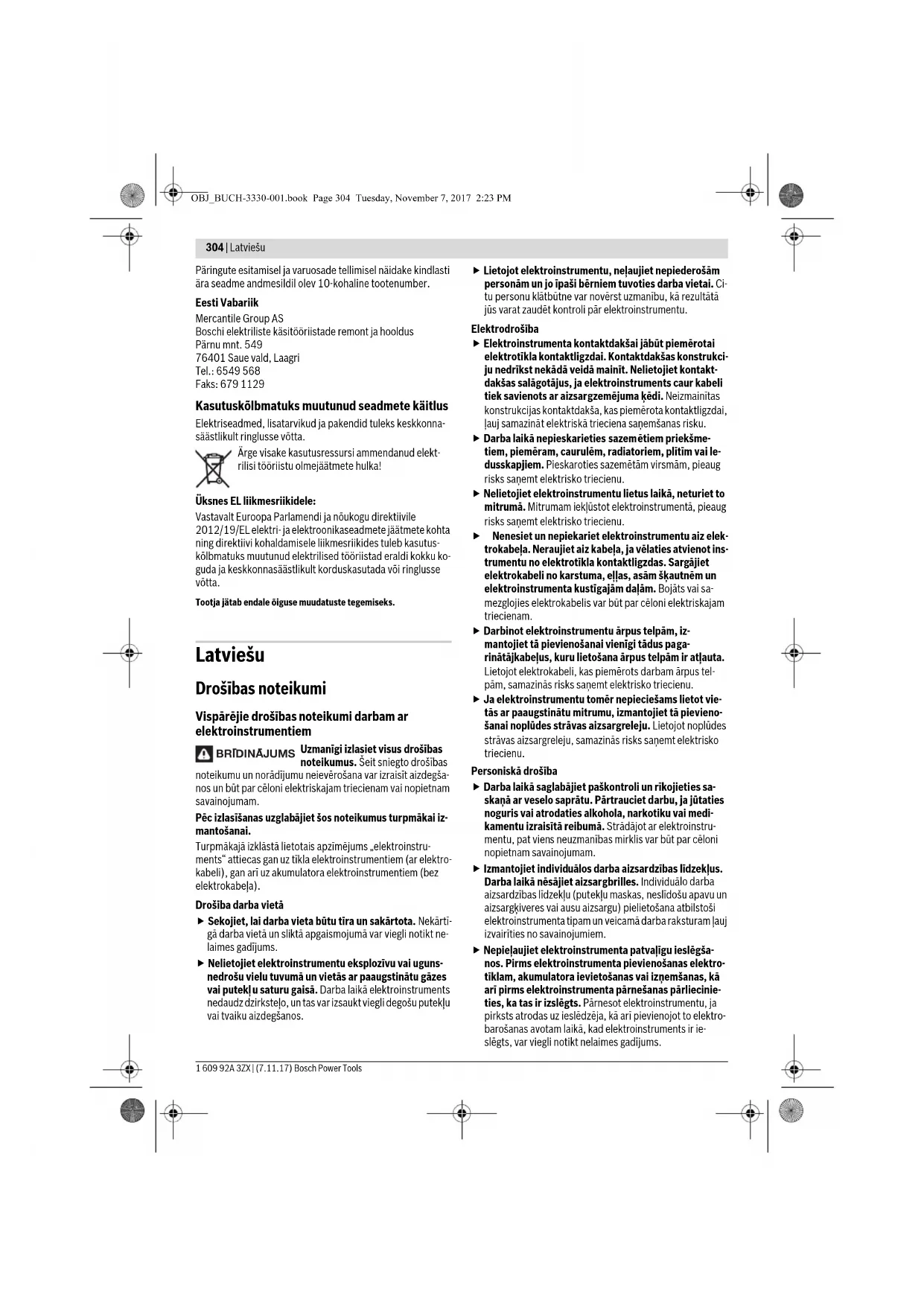 OBJ_BUCH-3330-001.book Page 314 Tuesday, November 7, 2017 2:23 PMLietuviškai | 315 Bosch Power Tools 1 609 92A 3ZX | (7.11.17) Par sienu statisko noslodzi Padziļinājumu un gropju ierīkošanu ēku nesošajās sienās reg- lamentē standarta DIN 1053 pirmā daļa, kā arī attiecīgie citu valstu nacionālie standarti un noteikumi. Šie standarti un noteikumi obligāti jāievēro. Pirms darbu sāk- šanas noteikti konsultējieties ar arhitektu, atbildīgo speciālis- tu būvstatikas jomā vai pašvaldības speciālistu, kas atbild par celtnes vai celtniecības objekta drošību. Apkalpošana un apkope Apkalpošana un tīrīšana Pirms elektroinstrumenta apkopes vai apkalpošanas izvelciet tā elektrokabeļa kontaktdakšu no barojošā elektrotīkla kontaktligzdas. Lai nodrošinātu ilgstošu un nevainojamu elektroin- strumenta darbību, uzturiet tīru tā korpusu un ventilā- cijas atveres. Strādājot ekstremālos apstākļos vienmēr izmantojiet putekļu uzsūkšanas ierīci, ja vien tas ir iespējams. Pēc iespējas biežāk izpūtiet elektroinstrumenta ventilāci- jas atveres ar saspiestu gaisu un pievienojiet to elek- trotīklam caur noplūdes strāvas aizsargreleju (PRCD). Izmantojot elektroinstrumentu metāla apstrādei, tā korpu- sa iekšpusē var uzkrāties strāvu vadoši putekļi. Tas var nelabvēlīgi ietekmēt elektroinstrumenta aizsargizolācijas sistēmu. Ja nepieciešams nomainīt elektrotīkla kabeli, tas jā veic firmas Bosch elektroinstrumentu servisa centrā vai Bosch pilnvarotā elektroinstrumentu remonta darbnīcā, jo tā tiks saglabāts va- jadzīgais darba drošības līmenis. Rūpīgi uzglabājiet un uzmanīgi lietojiet elektroinstrumenta piederumus. Klientu konsultāciju dienests un konsultācijas par lietošanu Klientu konsultāciju dienesta darbinieki atbildēs uz Jūsu jau- tājumiem par izstrādājuma remontu un apkalpošanu, kā arī par rezerves daļu iegādi. Izklājuma zīmējumus un informāciju par rezerves daļām var atrast arī interneta vietnē: www.bosch-pt.com Bosch klientu konsultāciju grupa centīsies Jums palīdzēt vis- labākajā veidā, sniedzot atbildes uz jautājumiem par mūsu iz- strādājumiem un to piederumiem. Pieprasot konsultācijas un pasūtot rezerves daļas, noteikti paziņojiet 10 zīmju izstrādājuma numuru, kas norādīts uz iz- strādājuma marķējuma plāksnītes. Latvijas Republika Robert Bosch SIA Bosch elektroinstrumentu servisa centrs Mūkusalas iel ā 97 LV-1004 Rīga Tālr.: 67146262 Telefakss: 67146263 E-pasts: service-pt@lv.bosch.com Atbrīvošanās no nolietotajiem izstrādājumiem Nolietotie elektroinstrumenti, to piederumi un iesaiņojuma materiāli jānogādā otrreizējai pārstrādei apkārtējai videi ne- kaitīgā veidā. Neizmetiet elektroinstrumentu sadzīves atkritumu tvertnē! Tikai ES valstīm Saskaņā ar Eiropas Savienības direktīvu 2012/19/ES par no- lietotajām elektriskajām un elektroniskajām ierīcēm un šīs di- rektīvas atspoguļojumiem nacionālajā likumdošanā, lietoša- nai nederīgie elektroinstrumenti jāsavāc atsevišķi un jānogādā otrreizējai pārstrādei apkārtējai videi nekaitīgā vei-
