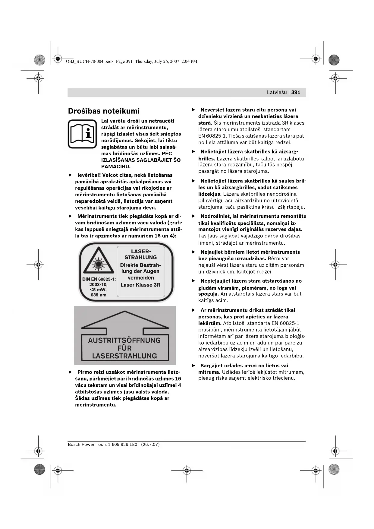 PAMĀCĪBU. f Ievērībai! Veicot citas, nekā lietošanas pamācībā aprakstītās apkalpošanas vai regulēšanas operācijas vai rīkojoties ar mērinstrumentu lietošanas pamācībā neparedzētā veidā, lietotājs var saņemt veselībai kaitīgu starojuma devu. f Mērinstruments tiek piegādāts kopā ar di- vām brīdinošām uzlīmēm vācu valodā (grafi- kas lappusē sniegtajā mērinstrumenta attē- lā tās ir apzīmētas ar numuriem 16 un 4): f Pirmo reizi uzsākot mērinstrumenta lieto- šanu, pārlīmējiet pāri brīdinošās uzlīmes 16 vācu tekstam un visai brīdinošajai uzlīmei 4 atbilstošas uzlīmes jūsu valsts valodā. Šādas uzlīmes tiek piegādātas kopā ar mērinstrumentu. f Nevērsiet lāzera staru citu personu vai dzīvnieku virzienā un neskatieties lāzera starā. Šis mērinstruments izstrādā 3R klases lāzera starojumu atbilstoši standartam EN 60825-1. Tieša skatīšanās lāzera starā pat no liela attāluma var būt kaitīga redzei. f Nelietojiet lāzera skatbrilles kā aizsarg- brilles. Lāzera skatbrilles kalpo, lai uzlabotu lāzera stara redzamību, taču tās nespēj pasargāt no lāzera starojuma. f Nelietojiet lāzera skatbrilles kā saules bril- les un kā aizsargbrilles, vadot satiksmes līdzekļus. Lāzera skatbrilles nenodrošina pilnvērtīgu acu aizsardzību no ultravioletā starojuma, taču pasliktina krāsu izšķirtspēju. f Nodrošiniet, lai mērinstrumentu remontētu tikai kvalificēts speciālists, nomaiņai iz- mantojot vienīgi oriģinālās rezerves daļas. Tas ļaus saglabāt vajadzīgo darba drošības līmeni, strādājot ar mērinstrumentu. f Neļaujiet bērniem lietot mērinstrumentu bez pieaugušo uzraudzības. Bērni var nejauši vērst lāzera staru uz citām personām un dzīvniekiem, kaitējot redzei. f Nepieļaujiet lāzera stara atstarošanos no gludām virsmām, piemēram, no loga vai spoguļa. Arī atstarotais lāzera stars var būt kaitīgs acīm. f Ar mērinstrumentu drīkst strādāt tikai personas, kas prot apieties ar lāzera iekārtām. Atbilstoši standarta EN 60825-1 prasībām, mērinstrumenta lietotājam jābūt informētam arī par lāzera starojuma bioloģis- ko iedarbību uz acīm un ādu un par pareizu aizsardzības līdzekļu izvēli un lietošanu, novēršot lāzera starojuma kaitīgo iedarbību. f Sargājiet uzlādes ierīci no lietus vai mitruma. Uzlādes ierīcē iekļūstot mitrumam, pieaug risks saņemt elektrisko triecienu. DIN EN 60825-1:2003-10, <5 mW, 635 nm LASER- STRAHLUNG Direkte Bestrah- lung der Augen vermeiden Laser Klasse 3R AUSTRITTSÖFFNUNG FÜR LASERSTRAHLUNG OBJ_BUCH-78-004.book Page 391 Thursday, July 26, 2007 2:04 PM392 | Latviešu 1 609 929 L80 | (26.7.07) Bosch Power Tools f Nelietojiet uzlādes ierīci citu firmu ražoto akumulatoru uzlādei. Uzlādes ierīce ir paredzēta vienīgi mērinstrumentā ievietoto Bosch akumulatoru bateriju uzlādei. Mēģinā- jums uzlādēt citās firmās ražotus akumulato- rus var izraisīt aizdegšanos vai sprādzienu. f Uzturiet uzlādes ierīci tīru. Ja uzlādes ierīce ir netīra, pieaug risks saņemt elektrisko triecienu. f Ik reizi pirms lietošanas pārbaudiet uzlādes ierīci, tās elektrokabeli un kontaktspraudni. Nelietojiet uzlādes ierīci, ja tā ir bojāta. Neatveriet uzlādes ierīci saviem spēkiem, bet nodrošiniet, lai tās remontu veiktu kvalificēts speciālists, nomaiņai izmantojot oriģinālās rezerves daļas. Ja ir bojāta uzlādes ierīce, tās elektrokabelis un kontaktspraudnis, pieaug risks saņemt elek- trisko triecienu. f Uzlādes ierīcei darbojoties, nenovietojiet to uz ugunsnedroša paliktņa (piemēram, uz papīra, tekstilmateriāliem u.t.t.); nedarbi- niet uzlādes ierīci ugunsnedrošos apstāk- ļos. Uzlādes ierīces darbības laikā no tās iz- dalās siltums, palielinot aizdegšanās iespēju. f Nepareizi lietojot akumulatoru, no tā var izplūst šķidrais elektrolīts. Nepieļaujiet elektrolīta nonākšanu saskarē ar ādu. Ja tas tomēr ir nejauši noticis, noskalojiet elektro- lītu ar ūdeni. Ja elektrolīts nonāk acīs, nekavējoties griezieties pie ārsta. No aku- mulatora izplūdušais elektrolīts var izsaukt ādas iekaisumu vai pat apdegumu. Funkciju apraksts Atveriet atlokāmo lapu ar mērinstrumenta attēlu un turiet to atvērtu visu laiku, kamēr tiek lasīta lietošanas pamācība. Pielietojums Mērinstruments ir paredzēts precīzu horizontālu un vertikālu taisnu līniju iezīmēšanai un pārbau- dei, kā arī augstuma un punktu projekciju no- teikšanai, strādājot gan telpās, gan arī ārpus tām. Attēlotās sastāvdaļas Attēloto sastāvdaļu numerācija sakrīt ar numuriem mērinstrumenta attēlā, kas sniegts grafiskajā lappusē. 1 Līmeņrādis 2 Tālvadības signālu uztvērēja lēca 3 Ligzda uzlādes ierīces pievienošanai 4 Brīdinošā uzlīme „Lāzera stara izvadlūka“ 5 Lāzera stara izvadlūka 6 Marķējums Y asij 7 Marķējums X asij 8 Vertikālais stars 9 Kustīgais lāzera stars 10 Marķējošās ierobes X asij 11 Marķējošās ierobes Y asij 12 Bateriju nodalījuma vāciņa fiksators 13 Bateriju nodalījuma vāciņš 14 Gumijas balsts 15 Akumulatoru baterija 16 Brīdinošā uzlīme 17 Vītne stiprināšanai uz statīva 5/8" (horizontālā un vertikālā) 18 Sērijas numurs 19 Taustiņš pārejai taisnes režīmā un taisnes garuma izvēlei 20 Virzientaustiņš „Augšup“ 21 Virzientaustiņš „Pa kreisi“ 22 Taustiņš pārejai rotācijas režīmā un rotācijas ātruma izvēlei 23 Virzientaustiņš „Lejup“ 24 Virzientaustiņš „Pa labi“ 25 Izlīdzināšanas rokas režīma indikators „man“ 26 Automātiskās pašizlīdzināšanās režīma indikators „auto“ 27 Akumulatoru baterijas uzlādes pakāpes indikators 28 Taustiņš „man/auto“ automātiskās pašizlī- dzināšanas izslēgšanai 29 Ieslēdzēja taustiņš 30 Celtniecības lāzera mērlīste* 31 Lāzera skatbrilles 32 Turētājs stiprināšanai pie sienas/ierīce izlī