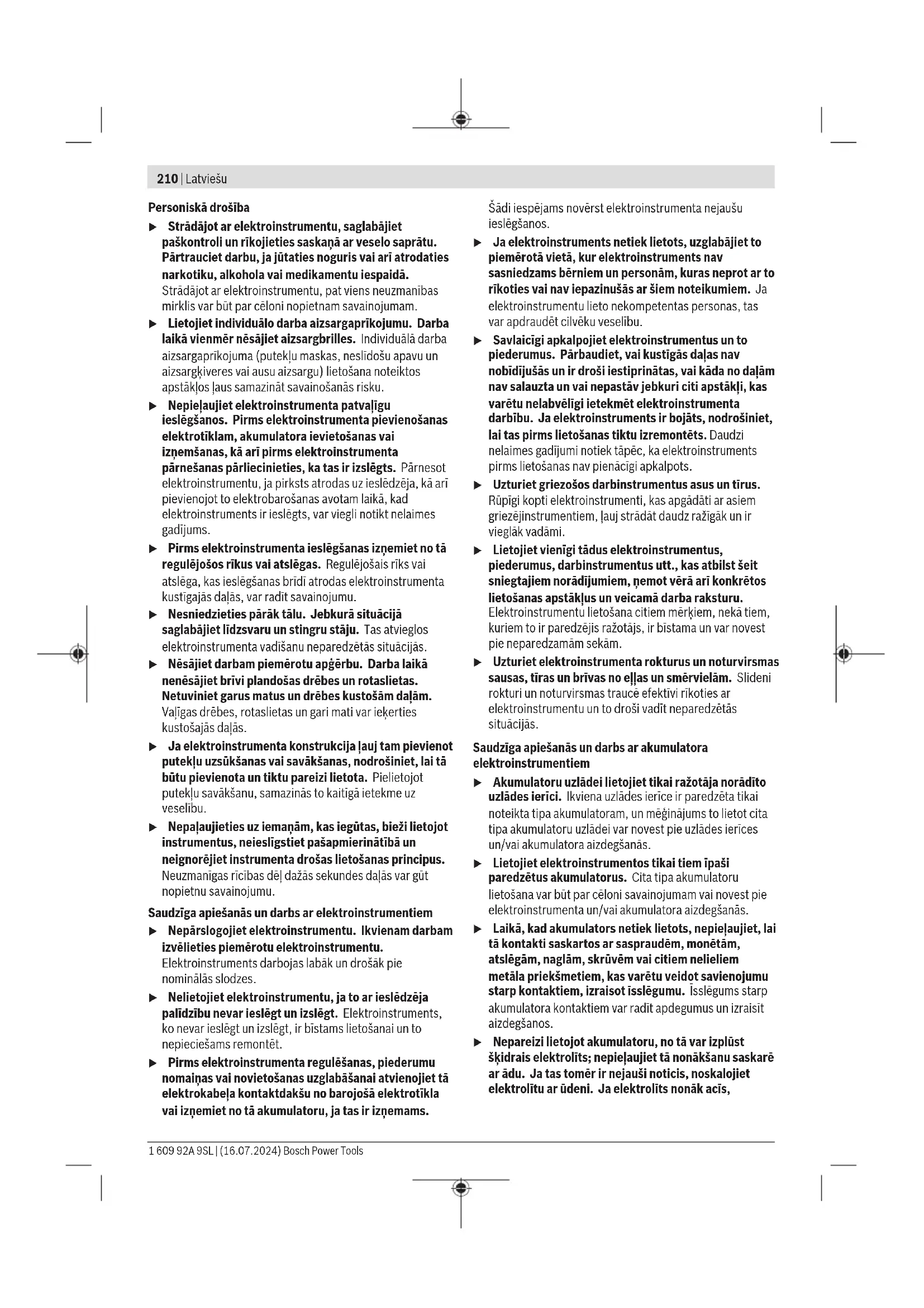 Šajā pamācībā norādītais vibrācijas līmenis un instrumenta radītā trokšņa vērtība ir izmērīta atbilstoši standartā noteiktajai procedūrai un var tikt izmantota elektroinstrumentu savstarpējai salīdzināšanai. To var izmantot arī vibrācijas un trokšņa radītās papildu slodzes iepriekšējai novērtēšanai. Šeit norādītais svārstību līmenis un instrumenta radītā trokšņa vērtība ir attiecināma uz elektroinstrumenta galvenajiem pielietojuma veidiem. Ja elektroinstruments tiek lietots netipiskiem mērķiem, kopā ar netipiskiem darbinstrumentiem vai nav vajadzīgajā veidā apkalpots, tā svārstību līmenis un radītā trokšņa vērtība var atšķirties no šeit norādītajām vērtībām. Tas var ievērojami palielināt svārstību un trokšņa radīto papildu slodzi kopējam darba laika posmam. Lai precīzi izvērtētu svārstību un trokšņa radīto papildu slodzi zināmam darba laika posmam, jāņem vērā arī laiks, kad elektroinstruments ir izslēgts vai arī darbojas, taču faktiski netiek izmantots paredzētā darba veikšanai. Tas var ievērojami samazināt svārstību un trokšņa radīto papildu slodzi kopējam darba laika posmam. Veiciet papildu pasākumus, lai pasargātu strādājošo personu no vibrācijas kaitīgās iedarbības, piemēram, savlaicīgi veiciet elektroinstrumenta un darbinstrumentu apkalpošanu, uzturiet rokas siltas un pareizi plānojiet darbu. Norādījumi par precizitāti Apgriezienu samazināšana (jo īpaši zemāk nekā 50%) var izraisīt maksimālā griezes momenta samazināšanos. Palielināts apgriezienu skaits ar aktīvu Power Boost funkciju var ietekmēt instrumenta precizitāti un tā izslēgšanos. Ir iespējama pārlieku liela sajūga aizture. Iekārtas veiktspējas pārbaudes parasti tiek veiktas pie 600min-1 saskaņā ar VDI2647. Bosch Power Tools 1 609 92A 9SL | (16.07.2024)214 | Latviešu Apgriezienu skaita vai griezes momenta izmaiņas var ietekmēt precizitāti. Iekārtas veiktspēja ir jāpārbauda ar tajā brīdī esošajiem iestatījumiem. Akumulators Bosch pārdod akumulatora elektriskos darbinstrumentus arī bez akumulatora. Tas, vai Jūsu elektriskā darbinstrumenta piegādes komplektācijā ir iekļauts akumulators, ir norādīts uz iesaiņojuma. Akumulatora uzlāde u Izmantojiet vienīgi tehniskajos datos norādītās uzlādes ierīces. Vienīgi šī uzlādes ierīce ir piemērota jūsu elektroinstrumentā izmantojamā litija-jonu akumulatora uzlādei. Norāde: atbilstoši starptautiskajiem kravu pārvadāšanas noteikumiem litija jonu akumulatori tiek piegādāti daļēji uzlādētā stāvoklī. Lai nodrošinātu pilnu akumulatora jaudu, pirms pirmās lietošanas reizes pilnībā uzlādējiet akumulatoru. Akumulatora ielikšana Ievietojiet uzlādēto akumulatoru akumulatora stiprinājumā, līdz tas tiek nofiksēts. Akumulatora izņemšana Lai izņemtu akumulatoru, nospiediet akumulatora atbrīvošanas taustiņus un izvelciet akumulatoru. Nedarbojieties ar spēku. Akumulatora uzlādes pakāpes indikators (dzeltena LED diode) Akumulatora uzlādes pakāpes indikators Nozīme Indikators mirgo + skan akustisks signāls Uzlādējiet akumulatoru: vēl var ieskrūvēt 6–8skrūves. Deg pastāvīgi + akustisks signāls Vairs nevar ieskrūvēt pat vienu skrūvi vai arī elektroinstruments ir pārslogots: elektroinstrumentu vairs nevar ieslēgt. – Izņemiet akumulatoru un tā vietā ievietojiet citu, pilnīgi uzlādētu akumulatoru. Indikators mirgo Elektroinstruments ir pārkarsis un vairs nespēj darboties: – Pirms elektroinstrumenta atkārtotas iedarbināšanas nogaidiet, līdz izdziest mirgojošais LED indikators. Ieliekot akumulatoru(9) un nospiežot ieslēgšanas/ izslēgšanas slēdzi(5), akumulatora uzlādes pakāpes indikators rāda akumulatora uzlādes pakāpi 5sekundes. Akumulatora uzlādes pakāpes indikators Uzlādes pakāpe Zaļš 60–100% Dzeltens 30–60% Sarkans 0–30% Pareiza apiešanās ar akumulatoru Sargājiet akumulatoru no mitruma un ūdens. Uzglabājiet akumulatoru pie temperatūras no −20°C līdz 50°C. Neatstājiet akumulatoru karstumā, piemēram, vasaras laikā neatstājiet to automašīnā. Ja manāmi samazinās instrumenta darbības laiks starp akumulatora uzlādēm, tas norāda, ka akumulators ir nolietojies un to nepieciešams nomainīt. Ievērojiet norādījumus par atbrīvošanos no nolietotajiem izstrādājumiem. Montāža u Pirms jebkādu darbu veikšanas pie elektroinstrumenta (piem. apkope, instrumentu maiņa utt.) izņemiet akumulatoru no elektroinstrumenta. Ja nejauši nospiež ieslēdzēju/ izslēdzēju, pastāv savainojumu risks. Darba un uzglabāšanas apstākļi Elektroinstruments ir paredzēts izmantošanai vienīgi slēgtās darba telpās. Lai elektroinstruments nevainojami darbotos, apkārtējā gaisa temperatūrai jābūt robežās no 0 °C līdz +45 °C pie relatīvā gaisa mitruma no 20 līdz 95 % bez aprasošanas. Ierīce piekarināšanai (attēls A) Izmantojot lokveida turētāju (11), elektroinstrumentu var uzkarināt uz kādas turētājierīces. – Novietojiet lokveida turētāju (11) uz elektroinstrumenta un ļaujiet tam fiksēties ierobēs (12). u Regulāri pārbaudiet instrumenta lokveida turētāju un turētājierīces āķus vai iekares. Elektroinstrumenta konfigurēšana Ar programmatūras BOSCH EXACT Configurator versijas 5.2 palīdzību var konfigurēt vairākus elektroinstrumenta iestatījumus (piemēram, iestatīt griešanās ātrumu, ieskrūvēšanas griezes momentu, aizsardzību pret atkārtotu ieslēgšanos). Šim nolūkam elektroinstruments jāsavieno ar personāldatoru, izmantojot USB interfeisu. Izmantojiet USB kabeli: USB2.0tipsA/Micro-USB2.0tipsB – Dubulti ekranēts – Maks. garums 1m Konfigurējot ar USB saskarni, ārpus industriālās vides var rasties radio traucējumi. u Ievērojiet visus programmatūras lietošanas pamācībā sniegtos drošības noteikumus un norādījumus. 1 609 92A 9SL | (16.07.2024) Bosc