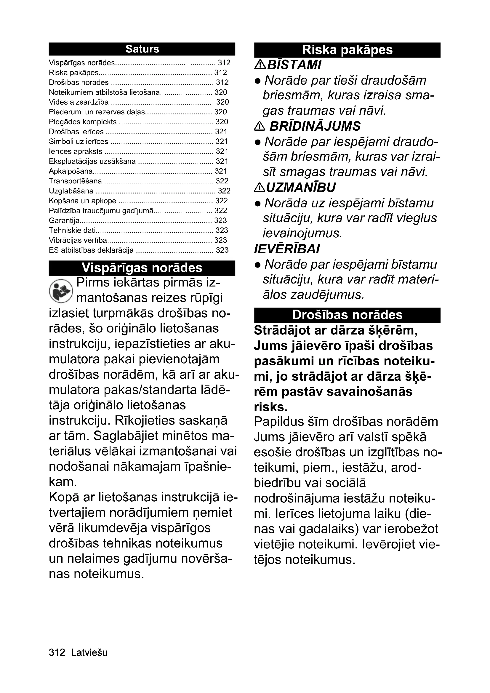 1,5 Mõõtmed ja kaalud Lõike pikkus mm 600 Kaal (akupakita) kg 3,45 Chairman of the Board of ManagementDirector Regulatory Affairs & Certification H. Jenner S. Reiser312 Latviešu Saturs Vispārīgas norādes Pirms iekārtas pirmās iz- mantošanas reizes rūpīgi izlasiet turpmākās drošības no- rādes, šo oriģinālo lietošanas instrukciju, iepazīstieties ar aku- mulatora pakai pievienotajām drošības norādēm, kā arī ar aku- mulatora pakas/standarta lādē- tāja oriģinālo lietošanas instrukciju. Rīkojieties saskaņā ar tām. Saglabājiet minētos ma- teriālus vēlākai izmantošanai vai nodošanai nākamajam īpašnie- kam. Kopā ar lietošanas instrukcijā ie- tvertajiem norādījumiem ņemiet vērā likumdevēja vispārīgos drošības tehnikas noteikumus un nelaimes gadījumu novērša- nas noteikumus. Riska pakāpes BĪSTAMI ● Norāde par tieši draudošām briesmām, kuras izraisa sma- gas traumas vai nāvi.
