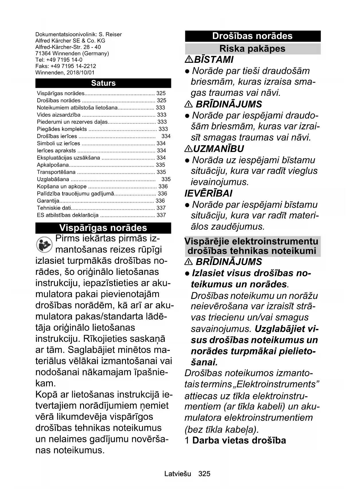 Kaal (akupakita) kg 4,3 Chairman of the Board of ManagementDirector Regulatory Affairs & Certification H. Jenner S. ReiserLatviešu 325 Dokumentatsioonivolinik: S. Reiser Alfred Kärcher SE & Co. KG Alfred-Kärcher-Str. 28 - 40 71364 Winnenden (Germany) Tel: +49 7195 14-0 Faks: +49 7195 14-2212 Winnenden, 2018/10/01 Saturs Vispārīgas norādes Pirms iekārtas pirmās iz- mantošanas reizes rūpīgi izlasiet turpmākās drošības no- rādes, šo oriģinālo lietošanas instrukciju, iepazīstieties ar aku- mulatora pakai pievienotajām drošības norādēm, kā arī ar aku- mulatora pakas/standarta lādē- tāja oriģinālo lietošanas instrukciju. Rīkojieties saskaņā ar tām. Saglabājiet minētos ma- teriālus vēlākai izmantošanai vai nodošanai nākamajam īpašnie- kam. Kopā ar lietošanas instrukcijā ie- tvertajiem norādījumiem ņemiet vērā likumdevēja vispārīgos drošības tehnikas noteikumus un nelaimes gadījumu novērša- nas noteikumus. Drošības norādes Riska pakāpes BĪSTAMI ● Norāde par tieši draudošām briesmām, kuras izraisa sma- gas traumas vai nāvi.