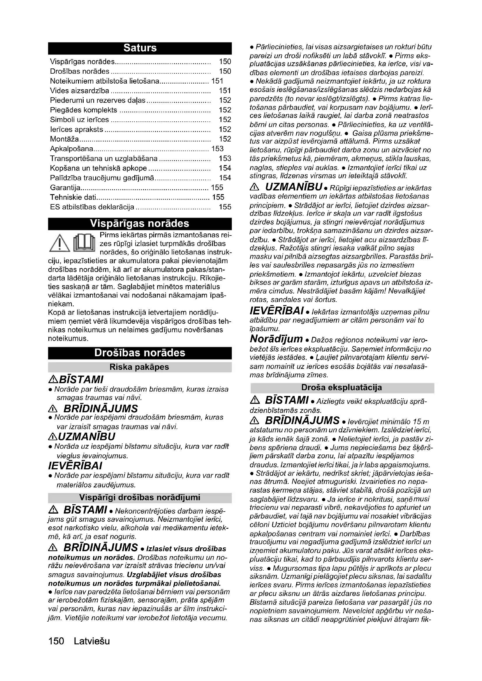 - ● Norāde par iespējami bīstamu situāciju, kura var radīt materiālos zaudējumus. Vispārīgi drošības norādījumi BĪSTAMI ● Nekoncentrējoties darbam iespē- jams gūt smagus savainojumus. Neizmantojiet ierīci, esot narkotisko vielu, alkohola vai medikamentu ietek- mē, kā arī, ja esat noguris. 몇 BRĪDINĀJUMS ● Izlasiet visus drošības noteikumus un norādes. Drošības noteikumu un no- rāžu neievērošana var izraisīt strāvas triecienu un/vai smagus savainojumus. Uzglabājiet visus drošības noteikumus un norādes turpmākai pielietošanai. ● Ierīce nav paredzēta lietošanai bērniem vai personām ar ierobežotām fiziskajām, sensorajām, prāta spējām vai personām, kuras nav iepazinušās ar šīm instrukci- jām. Vietējie noteikumi var ierobežot lietotāja vecumu. ● Pārliecinieties, lai visas aizsargietaises un rokturi būtu pareizi un droši nofiksēti un labā stāvoklī. ● Pirms eks- pluatācijas uzsākšanas pārliecinieties, ka ierīce, visi va- dības elementi un drošības ietaises darbojas pareizi. ● Nekādā gadījumā neizmantojiet iekārtu, ja uz roktura esošais ieslēgšanas/izslēgšanas slēdzis nedarbojas kā paredzēts (to nevar ieslēgt/izslēgts). ● Pirms katras lie- tošanas pārbaudiet, vai korpusam nav bojājumu. ● Ierī- ces lietošanas laikā raugiet, lai darba zonā neatrastos bērni un citas personas. ● Pārliecinieties, ka uz ventilā- cijas atverēm nav nogulšņu. ● Gaisa plūsma priekšme- tus var aizpū st ievērojamā attālumā. Pirms uzsākat lietošanu, rūpīgi pārbaudiet darba zonu un aizvāciet no tās priekšmetus kā, piemēram, akmeņus, stikla lauskas, naglas, stieples vai auklas. ● Izmantojiet ierīci tikai uz stingras, līdzenas virsmas un ieteiktajā stāvoklī. 몇 UZMANĪBU ● Rūpīgi iepazīstieties ar iekārtas vadības elementiem un iekārtas atbilstošas lietošanas principiem. ● Strādājot ar ierīci, lietojiet dzirdes aizsar- dzības līdzekļus. Ierīce ir skaļa un var radīt ilgstošus dzirdes bojājumus, ja stingri neievērojat norādījumus par iedarbību, trokšņa samazināšanu un dzirdes aizsar- dzību. ● Strādājot ar ierīci, lietojiet acu aizsardzības lī- dzekļus. Ražotājs stingri iesaka valkāt pilno sejas masku vai pilnībā aizsegtas aizsargbrilles. Parastās bril- les vai saulesbrilles nepasargās jūs no izmestiem priekšmetiem. ● Izmantojot iekārtu, uzvelciet biezas bikses ar garām starām, iztur īgus apavs un atbilstoša iz- mēra cimdus. Nestrādājiet basām kājām! Nevalkājiet rotas, sandales vai šortus. IEVĒRĪBAI ● Iekārtas izmantotājs uzņemas pilnu atbildību par negadījumiem ar citām personām vai to īpašumu. Norādījum ● Dažos reģionos noteikumi var iero- bežot šīs ierīces ekspluatāciju. Saņemiet informāciju no vietējās iestādes. ● Ļaujiet pilnvarotajam klientu servi- sam nomainīt uz ierīces esošās bojātās vai nesalasā- mas brīdinājuma zīmes. Droša ekspluatācija BĪSTAMI ● Aizliegts veikt ekspluatāciju sprā- dzienbīstamās zonās. 몇 BRĪDINĀJUMS ● Ievērojiet minimālo 15 m atstatumu no personām un dzīvniekiem. Izslēdziet ierīci, ja kāds ienāk šajā zonā. ● Nelietojiet ierīci, ja pastāv zi- bens spēriena draudi. ● Jums nepieciešams bez šķērš- ļiem pārskatīt darba zonu, lai atpazītu iespējamos draudus. Izmantojiet ierīci tikai, ja ir labs apgaismojums. ● Strādājot ar iekārtu, nedrīkst skriet; jāpārvietojas ieša- nas ātrumā. Neejiet atmuguriski. Izvairieties no nepa- rastas ķermeņa stājas, stāviet stabilā, drošā pozīcijā un saglabājiet līdzsvaru. ● Ja ierīce ir nokritusi, saņē musi triecienu vai neparasti vibrē, nekavējoties to apturiet un pārbaudiet, vai tajā nav bojājumu vai nosakiet vibrācijas cēloni Uzticiet bojājumu novēršanu pilnvarotam klientu apkalpošanas centram vai nomainiet ierīci. ● Darbības traucējumu vai negadījuma gadījumā izslēdziet ierīci un izņemiet akumulatoru paku. Jūs varat atsākt ierīces eks- pluatāciju tikai, kad to pārbaudījis pilnvarots klientu ser- viss. ● Mugursomas tipa lapu pūtējs ir aprīkots ar plecu siksnām. Uzmanīgi pielāgojiet plecu siksnas, lai sadalītu ierīces svaru. Pirms ierīces izmantošanas iepazīstieties ar plecu siksnu un ātrās aizdares lietošanas principu. Bīstamā situācijā pareiza lietošana var pasargāt j ūs no nopietniem savainojumiem. Nevelciet apģērbu vir neša- nas siksnas un citādi neapgrūtiniet piekļuvi ātrajam fik- Vispārīgas norādes p. 150