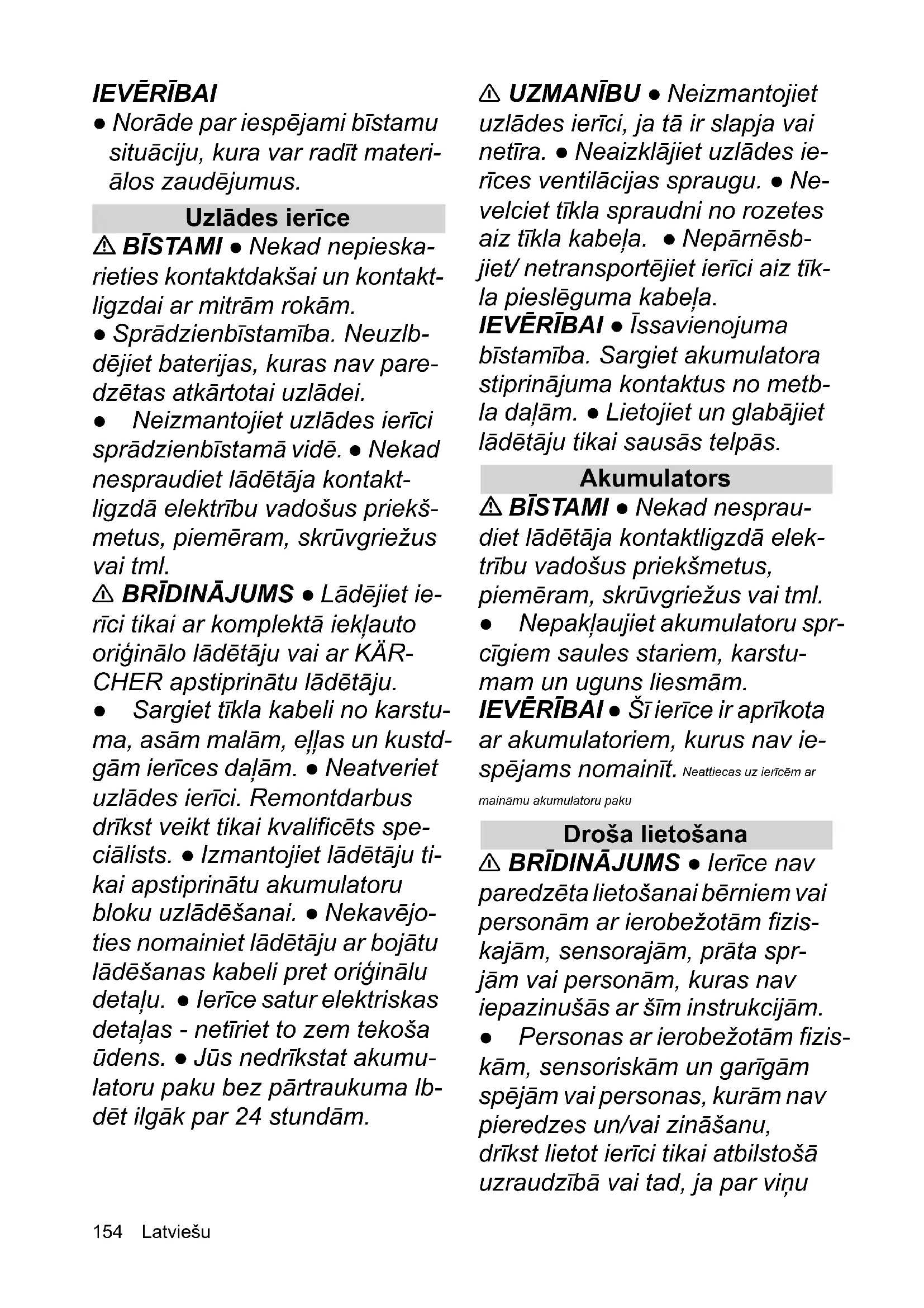 ● Norāde par iespējami bīstamu situāciju, kura var radīt materi- ālos zaudējumus. Uzlādes ierīce BĪSTAMI ● Nekad nepieska- rieties kontaktdakšai un kontakt- ligzdai ar mitrām rokām. ● Sprādzienbīstamība. Neuzlb- dējiet baterijas, kuras nav pare- dzētas atkārtotai uzlādei. ● Neizmantojiet uzlādes ierīci sprādzienbīstamā vidē. ● Nekad nespraudiet lādētāja kontakt- ligzdā elektrību vadošus priekš- metus, piemēram, skrūvgriežus vai tml. 몇 BRĪDINĀJUMS ● Lādējiet ie- rīci tikai ar komplektā iekļauto oriģinālo lādētāju vai ar KÄR- CHER apstiprinātu lādētāju. ● Sargiet tīkla kabeli no karstu- ma, asām malām, eļļas un kustd- gām ierīces daļām. ● Neatveriet uzlādes ierīci. Remontdarbus drīkst veikt tikai kvalificēts spe- ciālists. ● Izmantojiet lādētāju ti- kai apstiprinātu akumulatoru bloku uzlādēšanai. ● Nekavējo- ties nomainiet lādētāju ar bojātu lādēšanas kabeli pret oriģinālu detaļu. ● Ierīce satur elektriskas detaļas - netīriet to zem tekoša ūdens. ● Jūs nedrīkstat akumu- latoru paku bez pārtraukuma lb- dēt ilgāk par 24 stundām. 몇 UZMANĪBU ● Neizmantojiet uzlādes ierīci, ja tā ir slapja vai netīra. ● Neaizklājiet uzlādes ie- rīces ventilācijas spraugu. ● Ne- velciet tīkla spraudni no rozetes aiz tīkla kabeļa. ● Nepārnēsb- jiet/ netransportējiet ierīci aiz tīk- la pieslēguma kabeļa. IEVĒRĪBAI ● Īssavienojuma bīstamība. Sargiet akumulatora stiprinājuma kontaktus no metb- la daļām. ● Lietojiet un glabājiet lādētāju tikai sausās telpās. Akumulators BĪSTAMI ● Nekad nesprau- diet lādētāja kontaktligzdā elek- trību vadošus priekšmetus, piemēram, skrūvgriežus vai tml. ● Nepakļaujiet akumulatoru spr- cīgiem saules stariem, karstu- mam un uguns liesmām. IEVĒRĪBAI ● Šī ierīce ir aprīkota ar akumulatoriem, kurus nav ie- spējams nomainīt. Neattiecas uz ierīcēm ar maināmu akumulatoru paku Droša lietošana 몇 BRĪDINĀJUMS ● Ierīce nav paredzēta lietošanai bērniem vai personām ar ierobežotām fizis- kajām, sensorajām, prāta spr- jām vai personām, kuras nav iepazinušās ar šīm instrukcijām. ● Personas ar ierobežotām fizis- kām, sensoriskām un garīgām spējām vai personas, kurām nav pieredzes un/vai zināšanu, drīkst lietot ierīci tikai atbilstošā uzraudzībā vai tad, ja par viņu/DWYLHģX drošību atbildīgā persona dod norādes par ierīces drošu lieto- šanu un lietotājs ir izpratis iespr- jamās briesmas. ● Ar ierīci nedrīkst spēlēties bērni. ● Uz- raugiet bērnus, lai pārliecinātos, ka tie nespēlējas ar ierīci. ● Ierīci lietojiet tikai atbilstoši paredzēta- jam mērķim. Ņemiet vērā apkār- tējos apstākļus un darba laikā uzmanieties no trešām perso- nām, jo īpaši bērniem. ● Ap- draudējuma zonās (piem., degvielas uzpildes stacijās) ie- vērojiet attiecīgos drošības no- teikumus. Nekad neizmantojiet ierīci sprādzienbīstamās telpās. ● Neapsmidziniet priekšmetus, kas satur veselībai bīstamas vie- las (piem., azbestu). ● Savaino- šanās risks. Nevērsiet smidzināšanas strūklu acīs. 몇 UZMANĪBU ● Neizmantojiet ierīci, ja tā pirms tam ir nokritusi, ir redzami bojāta vai nav hermr- tiska. ● Lietojiet un uzglabājiet ierīci tikai atbilstoši aprakstam vai attēlam. ● Neatstājiet ierīci ekspluatācijas laikā bez uzrau- dzības. ● Lai nodrošinātu stabi- lu pozīciju, novietojiet ierīci uz stingras, līdzenas pamatnes. ● Nelaimes gadījumi vai bojā ju- mi, ko var radīt ierīces apgāša- nās. Pirms darbu veikšanas vienmēr nodrošiniet ierīces sta- bilitāti. IEVĒRĪBAI ● Neiepildiet tīrīša- nas līdzekļus vai citus papildinb- jums. ● Ierīces bojājumi. Neiepildiet ūdens tvertnē šķīdi- nātājus, šķīdinātājus saturošus šķidrumus vai neatšķaidītas skb- bes (piem., tīrīšanas līdzekļus, benzīnu, krāsas atšķaidītājus un acetonu). ● Ierīces bojājumi sausa gaitas dēļ. Ieslēdziet ierīci tikai, ja ūdens tvertnē ir ūdens. ● Nelietojiet ierīci, ja apkārtējās vides temperatūra ir zemāka par 0 °C. Noteikumiem atbilstoša lietošana Zemspiediena tīrītāju izmantojiet tikai privātā mājsaim- niecībā. Zemspiediena tīrītājs ir paredzēts mašīnu, transportlü- dzekļu, darbarīku, fasāžu, terašu, dārza ierīču, mājdzīv- nieku utt. mazgāšanai ar zemspiediena ūdens strūklu bez tīrīšanas līdzekļu pievienošanas. Apkārtējās vides aizsardzība Iepakošanas materiālus ir iespējams pārstrādāt atkārtoti. Likvidējiet iepakojumus videi nekaitīgā veidā. Elektriskās un elektroniskās ierīces satur noderü- gus pārstrādājumus materiālus un bieži vien tT- das sastāvdaļas kā baterijas, akumulatorus un eļļu, kuras nepareizas izmantošanas vai likvidс- šanas gadījumā var radīt potenciālu apdraudējumu cil- vēku veselībai un videi. Tomēr šīs sastāvdaļas ir nepieciešamas ierīces pareizai darbībai. Ierīces, kas apzīmētas ar šo simbolu, nedrīkst izmest kopā ar sadzü- ves atkritumiem. Tīrīšanas darbus, kuros notekūdens satur eļļu, pie- mēram, motora mazgāšanu, zemgrīdas mazgāša- nu, drīkst veikt tikai mazgāšanas vietās, kas aprīkotas ar eļļas atdalītāju. Darbus ar tīrīšanas līdzekļiem drīkst veikt tikai uz darba virsmām, kas ir nodrošinātas pret šķidruma noteci, ar pieslēgumu netīrā ūdens kanalizācijai. Neļau- jiet tīrīšanas līdzeklim nokļūt ūdenstilpnēs vai zemē. Dažās valstīs nav atļauta ūdens ņemšana no atklT- tām ūdenstilpnēm. Informācija par sastāvdaļām (REACH) Aktuālo informāciju par sastāvdaļām skatiet: www.kaer- cher.de/REACH Piederumi un rezerves daļas Izmantot tikai oriģinālos piederumus un oriģinālās re- zerves daļas, jo tie garantē drošu un nevainojamu ierü-