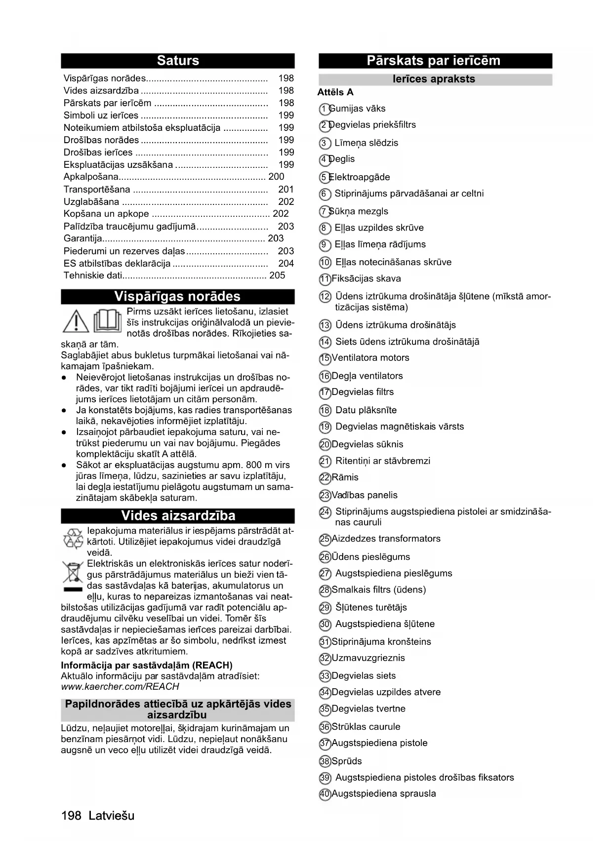 • 1,5198 Latviešu Saturs Vispārīgas norādes Pirms uzsākt ierīces lietošanu, izlasiet šīs instrukcijas oriģinālvalodā un pievie- notās drošības norādes. Rīkojieties sa- skaņā ar tām. Saglabājiet abus bukletus turpmākai lietošanai vai nā- kamajam īpašniekam. ● Neievērojot lietošanas instrukcijas un drošības no- rādes, var tikt radīti bojājumi ierīcei un apdraudē- jums ierīces lietotājam un citām personām. ● Ja konstatēts bojājums, kas radies transportēšanas laikā, nekavējoties informējiet izplatītāju. ● Izsaiņojot pārbaudiet iepakojuma saturu, vai ne- trūkst piederumu un vai nav bojājumu. Piegādes komplektāciju skatīt A att ēlā. ● Sākot ar ekspluatācijas augstumu apm. 800 m virs jūras līmeņa, lūdzu, sazinieties ar savu izplatītāju, lai degļa iestatījumu pielāgotu augstumam un sama- zinātajam skābekļa saturam. Vides aizsardzība Iepakojuma materiālus ir iespējams pārstrādāt at- kārtoti. Utilizējiet iepakojumus videi draudzīgā veidā. Elektriskās un elektroniskās ierīces satur noderī- gus pārstrādājumus materiālus un bieži vien tā- das sastāvdaļas kā baterijas, akumulatorus un eļļu, kuras to nepareizas izmantošanas vai neat- bilstošas utilizācijas gadījumā var radīt potenciālu ap- draudējumu cilvēku veselībai un videi. Tomēr šīs sastāvdaļas ir nepieciešamas ierīces pareizai darbībai. Ierīces, kas apzīmētas ar šo simbolu, nedrīkst izmest kopā ar sadzīves atkritumiem. Informācija par sast āvdaļām (REACH) Aktuālo informāciju par sastāvdaļām atradīsiet: www.kaercher.com/REACH Papildnorādes attiecībā uz apkārtējās vides aizsardzību Lūdzu, neļaujiet motoreļļai, šķidrajam kurināmajam un benzīnam piesārņot vidi. Lūdzu, nepieļaut nonākšanu augsnē un veco eļļu utilizēt videi draudzīgā veidā. Pārskats par ierīcēm Ierīces apraksts Attēls A 1 Gumijas vāks 2 Degvielas priekšfiltrs 3 Līmeņa slēdzis 4 Deglis 5 Elektroapgāde 6 Stiprinājums pārvadāšanai ar celtni 7 Sūkņa mezgls 8 Eļļas uzpildes skrūve 9 Eļļas līmeņa rādījums 10 Eļļas notecināšanas skrūve 11 Fiksācijas skava 12 Ūdens iztrūkuma drošinātāja šļūtene (mīkstā amor- tizācijas sistēma) 13 Ūdens iztrūkuma drošinātājs 14 Siets ūdens iztrūkuma drošinātājā 15 Ventilatora motors 16 Degļa ventilators 17 Degvielas filtrs 18 Datu plāksnīte 19 Degvielas magnētiskais vārsts 20 Degvielas sūknis 21 Ritentiņi ar stāvbremzi 22 Rāmis 23 Vadības panelis 24 Stiprinājums augstspiediena pistolei ar smidzināša- nas cauruli 25 Aizdedzes transformators 26 Ūdens pieslēgums 27 Augstspiediena pieslēgums 28 Smalkais filtrs (ūdens) 29 Šļūtenes turētājs 30 Augstspiediena šļūtene 31 Stiprinājuma kronšteins 32 Uzmavuzgrieznis 33 Degvielas siets 34 Degvielas uzpildes atvere 35 Degvielas tvertne 36 Strūklas caurule 37 Augstspiediena pistole 38 Sprūds 39 Augstspiediena pistoles drošības fiksators 40 Augstspiediena sprausla Vispārīgas norādes p. 198