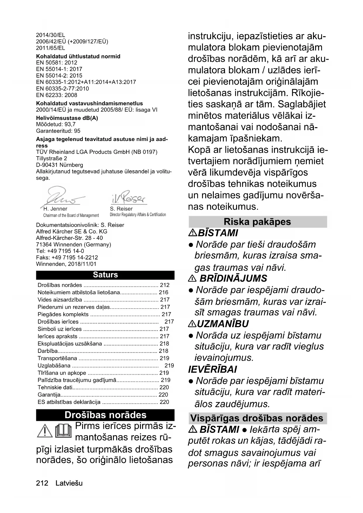 Kaal (akupakita) kg 32,6212 Latviešu 2014/30/EL 2006/42/EÜ (+2009/127/EÜ) 2011/65/EL Kohaldatud ühtlustatud normid EN 50581: 2012 EN 55014-1: 2017 EN 55014-2: 2015 EN 60335-1:2012+A11:2014+A13:2017 EN 60335-2-77:2010 EN 62233: 2008 Kohaldatud vastavushindamismenetlus 2000/14/EÜ ja muudetud 2005/88/ EÜ: lisaga VI Helivõimsustase dB(A) Mõõdetud: 93,7 Garanteeritud: 95 Asjaga tegelenud teavitatud asutuse nimi ja aad- ress TÜV Rheinland LGA Products GmbH (NB 0197) Tillystraße 2 D-90431 Nürnberg Allakirjutanud tegutsevad juhatuse ülesandel ja volitu- sega. Dokumentatsioonivolinik: S. Reiser Alfred Kärcher SE & Co. KG Alfred-Kärcher-Str. 28 - 40 71364 Winnenden (Germany) Tel: +49 7195 14-0 Faks: +49 7195 14-2212 Winnenden, 2018/11/01 Saturs Drošības norādes Pirms ierīces pirmās iz- mantošanas reizes rū- pīgi izlasiet turpmākās drošības norādes, šo oriģinālo lietošanas instrukciju, iepazīstieties ar aku- mulatora blokam pievienotajām drošības norādēm, kā arī ar aku- mulatora blokam / uzlādes ierī- cei pievienotajām oriģinālajām lietošanas instrukcijām. Rīkojie- ties saskaņā ar tām. Saglabājiet minētos materiālus vēlākai iz- mantošanai vai nodošanai nā- kamajam īpašniekam. Kopā ar lietošanas instrukcijā ie- tvertajiem norādījumiem ņemiet vērā likumdevēja vispārīgos drošības tehnikas noteikumus un nelaimes gadījumu novērša- nas noteikumus. Riska pakāpes BĪSTAMI ● Norāde par tieši draudošām briesmām, kuras izraisa sma- gas traumas vai nāvi.