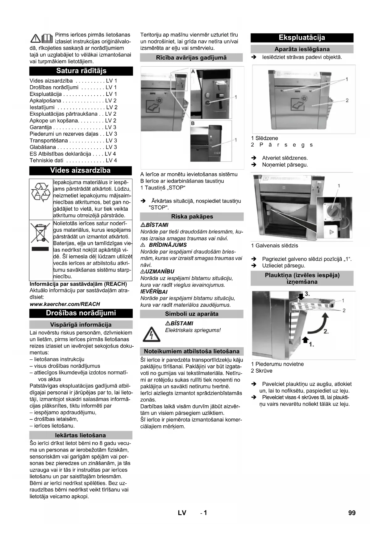 dB(A) 63 Mõõtmed Pikkus mm 1092 Laius mm 531 Kõrgus mm 1094 Kaal kg 70 98 ET- 1 Pirms ierīces pirmās lietošanas izlasiet instrukcijas oriģinālvalo- dā, rīkojieties saskaņā ar norādījumiem tajā un uzglabājiet to vēlākai izmantošanai vai turpmākiem lietotājiem. Informācija par sastāvdaļām (REACH) Aktuālo informāciju par sastāvdaļām atra- dīsiet: www.kaercher.com/REACH Lai novērstu riskus personām, dzīvniekiem un lietām, pirms ierīces pirmās lietošanas reizes izlasiet un ievērojiet sekojošus doku- mentus: – lietošanas instrukciju – visus drošības norādījumus – attiecīgos likumdevēja izdotos normatī- vos aktus Patstāvīgas ekspluatācijas gadījumā atbil- dīgajai personai ir jārūpējas par to, lai lieto- tāji, izmantojot skaidri salasāmas informā- cijas plāksnītes, tiktu informēti par – iespējamo apdraudējumu, – drošības ietaisēm, – ierīces lietošanu. Šo ierīci drīkst lietot bērni no 8 gadu vecu- ma un personas ar ierobežotām fiziskām, sensoriskām vai garīgām spējām vai per- sonas bez pieredzes un zināšanām, ja tās uzrauga vai ir tās ir instruētas par ierīces lietošanu un par saistītajām briesmām. Bērni ar ierīci nedrīkst spēlēties. Bez uz- raudzības bērni nedrīkst veikt tīrīšanu vai lietotāja veicamo apkopi. Teritoriju ap mašīnu vienmēr uzturiet tīru un nodrošiniet, lai grīda nav netīra un/vai izsmērēta ar eļļu vai smērvielu. A Ierīce ar monētu ievietošanas sistēmu B Ierīce ar iedarbināšanas taustiņu 1 Taustiņš „STOP“ Ārkārtas situācijā, nospiediet taustiņu "STOP". BĪSTAMI Norāde par tieši draudošām briesmām, ku- ras izraisa smagas traumas vai nāvi.