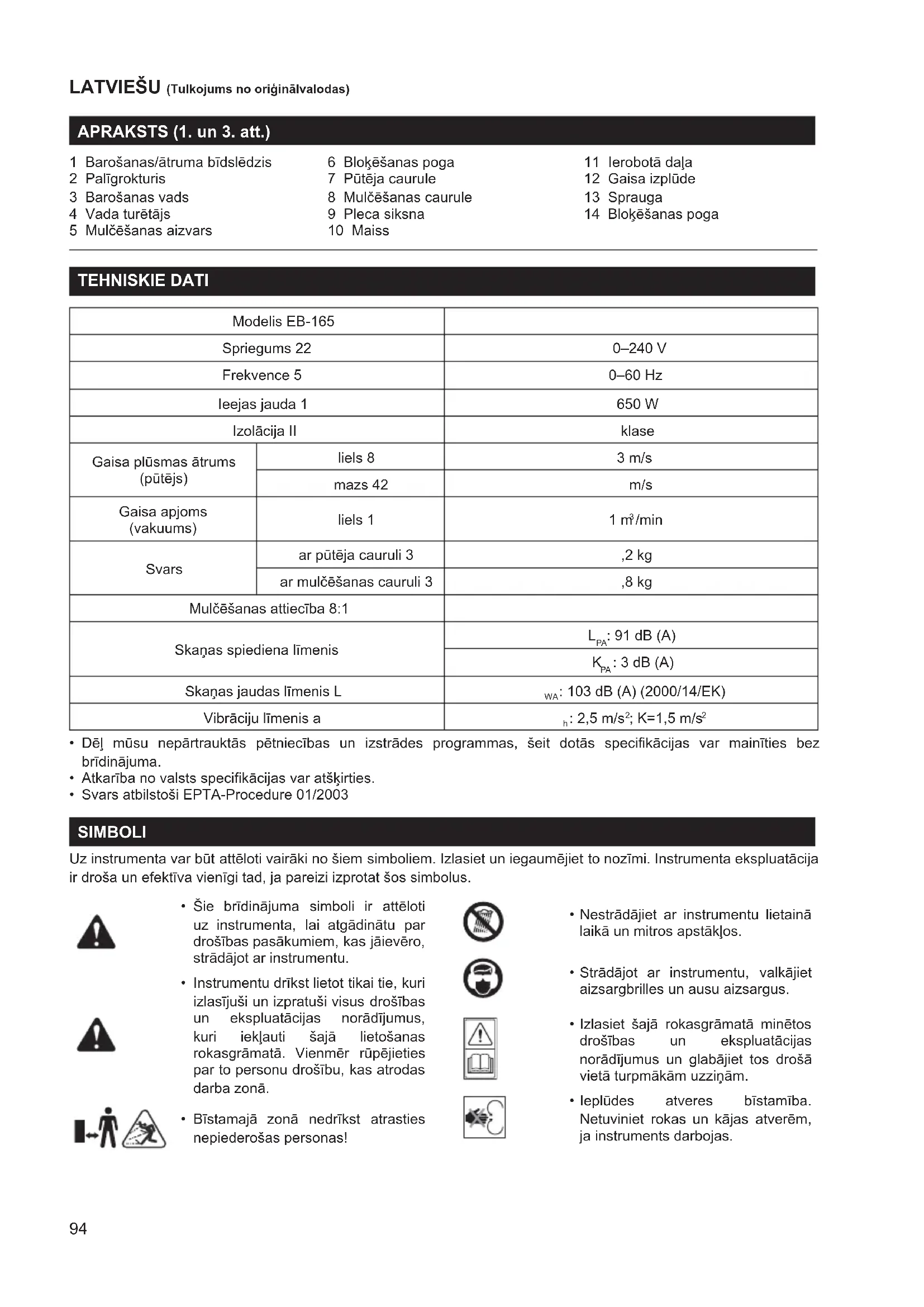 1 Ierobotā daļa 12 Gaisa izplūde 13 Sprauga 14 Bloķēšanas poga TEHNISKIE DATI Modelis EB-165 Spriegums 22 0–240 V Frekvence 5 0–60 Hz Ieejas jauda 1 650 W Izolācija II klase Gaisa plūsmas ātrums (pūtējs) liels 8 3 m/s mazs 42 m/s Gaisa apjoms (vakuums) liels 1 1 m