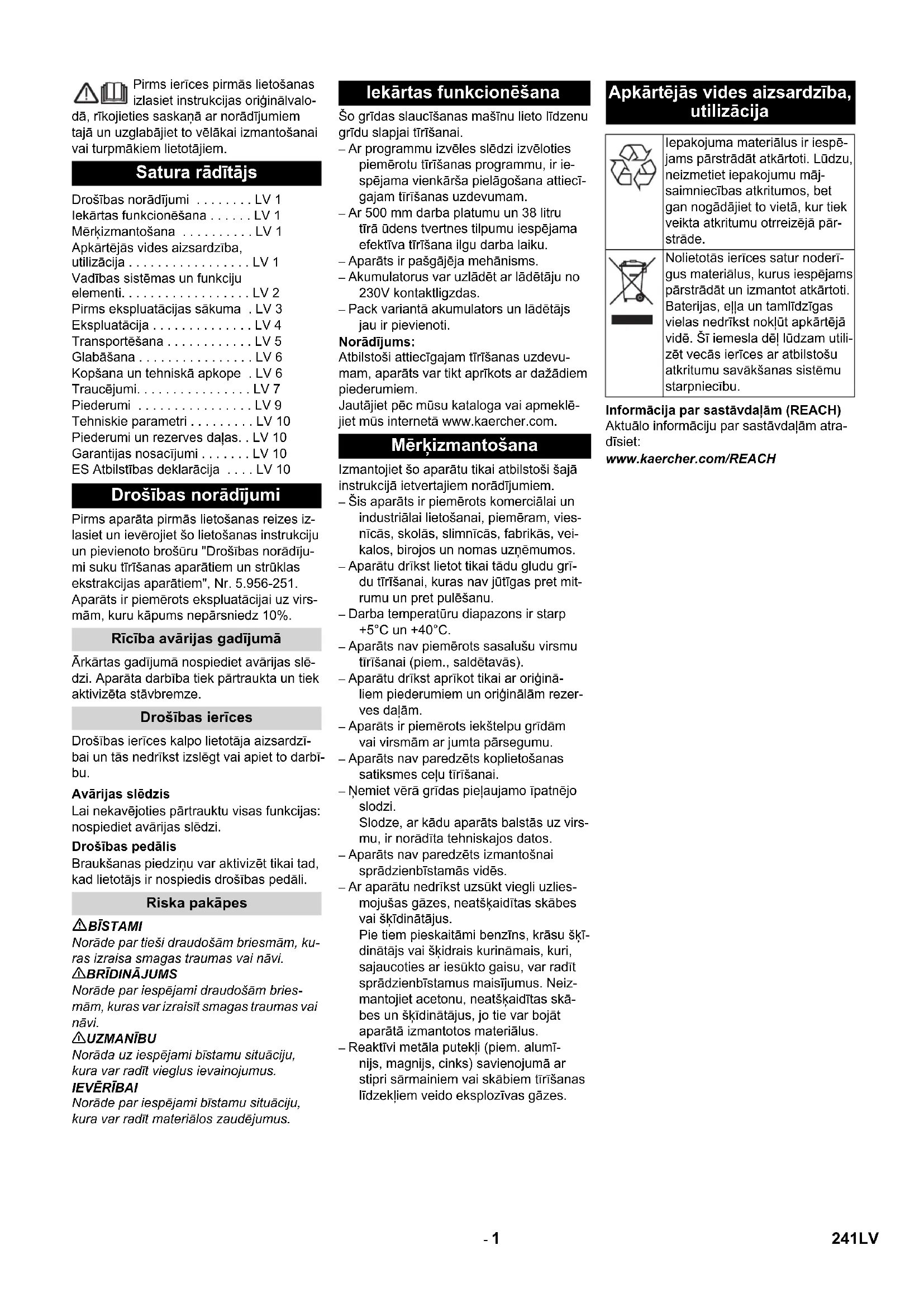 Chairman of the Board of Management Director Regulatory Affairs & Certification 240 ET- 1 Pirms ierīces pirmās lietošanas izlasiet instrukcijas oriģinālvalo- dā, rīkojieties saskaņā ar norādījumiem tajā un uzglabājiet to vēlākai izmantošanai vai turpmākiem lietotājiem. Pirms aparāta pirmās lietošanas reizes iz- lasiet un ievērojiet šo lietošanas instrukciju un pievienoto brošūru "Drošības norādīju- mi suku tīrīšanas aparātiem un strūklas ekstrakcijas aparātiem", Nr. 5.956-251. Aparāts ir piemērots ekspluatācijai uz virs- mām, kuru kāpums nepārsniedz 10%. Ārkārtas gadījumā nospiediet avārijas slē- dzi. Aparāta darbība tiek pārtraukta un tiek aktivizēta stāvbremze. Drošības ierīces kalpo lietotāja aizsardzī- bai un tās nedrīkst izslēgt vai apiet to darbī- bu. Lai nekavējoties pārtrauktu visas funkcijas: nospiediet avārijas slēdzi. Braukšanas piedziņu var aktivizēt tikai tad, kad lietotājs ir nospiedis drošības pedāli. BĪSTAMI Norāde par tieši draudošām briesmām, ku- ras izraisa smagas traumas vai nāvi.