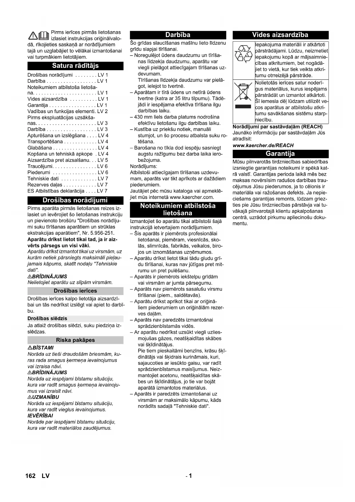 Chairman of the Board of Management Director Regulatory Affairs & Certification 161ET- 1 Pirms ierīces pirmās lietošanas izlasiet instrukcijas oriģinālvalo- dā, rīkojieties saskaņā ar norādījumiem tajā un uzglabājiet to vēlākai izmantošanai vai turpmākiem lietotājiem. Pirms aparāta pirmās lietošanas reizes iz- lasiet un ievērojiet šo lietošanas instrukciju un pievienoto brošūru "Drošības norādīju- mi suku tīrīšanas aparātiem un strūklas ekstrakcijas aparātiem", Nr. 5.956-251. Aparātu drīkst lietot tikai tad, ja ir aiz- vērts pārsegs un visi vāki. Aparātu drīkst izmantot tikai uz virsmām, uz kurām netiek pārsniegts maksimāli pieļau- jamais kāpums, skatīt nodaļu "Tehniskie dati".