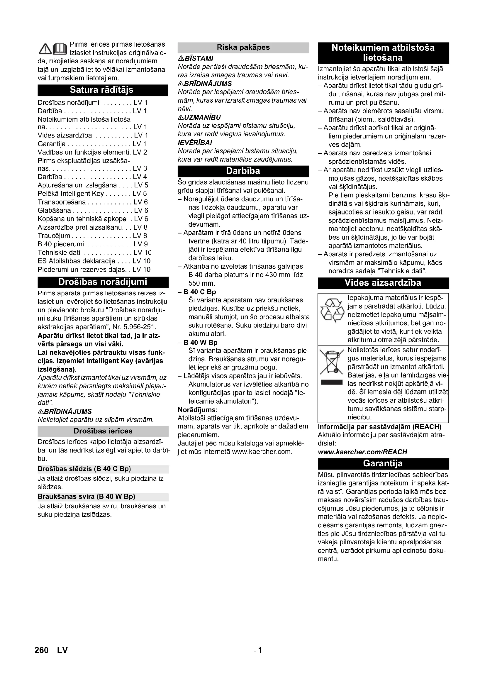 Norāde par iespējami draudošām bries- mām, kuras var izraisīt smagas traumas vai nāvi. 몇 UZMANĪBU Norāda uz iespējami bīstamu situāciju, kura var radīt vieglus ievainojumus. IEVĒ RĪBAI Norāde par iespējami bīstamu situāciju, kura var radīt materiālos zaudējumus. Šo grīdas slaucīšanas mašīnu lieto līdzenu grīdu slapjai tīrīšanai vai pulēšanai. – Noregulējot ūdens daudzumu un tīrīša- nas līdzekļa daudzumu, aparātu var viegli pielāgot attiecīgajam tīrīšanas uz- devumam. – Aparātam ir tīrā ūdens un netīrā ūdens tvertne (katra ar 40 litru tilpumu). Tādē- jādi ir iespējama efektīva tīrīšana ilgu darbības laiku. – Atkarībā no izvēlētās tīrīšanas galviņas B 40 darba platums ir no 430 mm līdz 550 mm. – B 40 C Bp Šī varianta aparātam nav braukšanas piedziņas. Kustība uz priekšu notiek, manuāli stumjot, un šo procesu atbalsta suku rotēšana. Suku piedziņu baro divi akumulatori. – B 40 W Bp Šī varianta aparātam ir braukšanas pie- dziņa. Braukšanas ātrumu var noregu- lēt iepriekš ar grozāmu pogu. – Lādētājs visos aparātos jau ir iebūvēts. Akumulatorus var izvēlēties atkarībā no konfigurācijas (par to lasiet nodaļā "Ie- teicamie akumulatori"). Norādījums: Atbilstoši attiecīgajam tīrīšanas uzdevu- mam, aparāts var tikt aprīkots ar dažādiem piederumiem. Jautājiet pēc mūsu kataloga vai apmeklē- jiet mūs internetā www.kaercher.com. Izmantojiet šo aparātu tikai atbilstoši šajā instrukcijā ietvertajiem norādījumiem. – Aparātu drīkst lietot tikai tādu gludu grī- du tīrīšanai, kuras nav jūtīgas pret mit- rumu un pret pulēšanu. – Aparāts nav piemērots sasalušu virsmu tīrīšanai (piem., saldētavās). – Aparātu drīkst aprīkot tikai ar oriģinā- liem piederumiem un oriģinālām rezer- ves daļām. – Aparāts nav paredzēts izmantošnai sprādzienbīstamās vidēs. – Ar aparātu nedrīkst uzsūkt viegli uzlies- mojušas gāzes, neatšķaidītas skābes vai šķīdinātājus. Pie tiem pieskaitāmi benzīns, krāsu šķī- dinātājs vai šķidrais kurināmais, kuri, sajaucoties ar iesūkto gaisu, var radīt sprādzienbīstamus maisījumus. Neiz- mantojiet acetonu, neatšķaidītas skā- bes un šķīdinātājus, jo tie var bojāt aparātā izmantotos materiālus. – Aparāts ir paredzēts izmantošanai uz virsmām ar maksimālo kāpumu, kāds norādīts sadaļā "Tehniskie dati". Informācija par sastāvdaļām (REACH) Aktuālo informāciju par sastāvdaļām atra- dīsiet: www.kaercher.com/REACH Mūsu pilnvarotās tirdzniecības sabiedrības izsniegtie garantijas noteikumi ir spēkā kat- rā valstī. Garantijas perioda laikā mēs bez maksas novērsīsim radušos darbības trau- cējumus Jūsu piederumos, ja to cēlonis ir materiāla vai ražošanas defekts. Ja nepie- ciešams garantijas remonts, lūdzam griez- ties pie Jūsu tirdzniecības pārstāvja vai tu- vākajā pilnvarotajā klientu apkalpošanas centrā, uzrādot pirkumu apliecinošu doku- mentu. Satura rādītājs Drošības norādījumi . . . . . . . . LV 1 Darbība . . . . . . . . . . . . . . . . . . LV 1 Noteikumiem atbilstoša lietoša- na. . . . . . . . . . . . . . . . . . . . . . . LV 1 Vides aizsardzība . . . . . . . . . . LV 1 Garantija . . . . . . . . . . . . . . . . . LV 1 Vadības un funkcijas elementi. LV 2 Pirms ekspluatācijas uzsākša- nas. . . . . . . . . . . . . . . . . . . . . . LV 3 Darbība . . . . . . . . . . . . . . . . . . LV 4 Apturēšana un izslēgšana . . . . LV 5 Pelēkā Intelligent Key . . . . . . . LV 5 Transportēšana . . . . . . . . . . . . LV 6 Glabāšana . . . . . . . . . . . . . . . . LV 6 Kopšana un tehniskā apkope . LV 6 Aizsardzība pret aizsalšanu. . . LV 8 Traucējumi. . . . . . . . . . . . . . . . LV 8 B 40 piederumi . . . . . . . . . . . . LV 9 Tehniskie dati . . . . . . . . . . . . . LV 10 ES Atbilstības deklarācija . . . . LV 10 Piederumi un rezerves daļas. . LV 10 Drošības norādījumi Drošības ierīces Drošības slēdzis (B 40 C Bp) Braukšanas svira (B 40 W Bp) Riska pakāpes Darbība Noteikumiem atbilstoša lietošana Vides aizsardzība Iepakojuma materiālus ir iespē- jams pārstrādāt atkārtoti. Lūdzu, neizmetiet iepakojumu mājsaim- niecības atkritumos, bet gan no- gādājiet to vietā, kur tiek veikta atkritumu otrreizējā pārstrāde. Nolietotās ierīces satur noderī- gus materiālus, kurus iespējams pārstrādāt un izmantot atkārtoti. Baterijas, eļļa un tamlīdzīgas vie- las nedrīkst nokļūt apkārtējā vi- dē. Šī iemesla dēļ lūdzam utilizēt vecās ierīces ar atbilstošu atkri- tumu savākšanas sistēmu starp- niecību. Garantija 260 LV- 2 1 Sūkšanas stieņa nolaišanas svira 2 Netīrā ūdens tvertnes vāks 3 Homebase turētājsliede 4 Šķiedru filtrs 5 Skalošanas sistēmas netīrā ūdens tver- tne (opcija) 6 Skalošanas sistēmas elastīgais no- slēgs (opcija) 7 Netīrā ūdens tvertnes fiksators 8 Pludiņš 9 Vadāmais rokturis 10 Lielo netīrumu siets 11 Netīrā ūdens tvertne 12 Tīrā ūdens tvertnes iepildīšanas atvē- rums 13 Tīrīšanas līdzekļa sūkšanas šļūtene (ti- kai variantam DOSE) 14 Tīrīšanas līdzekļa pudele (tikai varian- tam DOSE) 15 Tīrā ūdens tvertnes un filtra noslēgs 16 Tīrīšanas līdzekļa pudeles turētājs 17 Tīrā ūdens tvertne 18 Tvertnes noslēgs papildus nostiprināts ar plāksni un skrū-