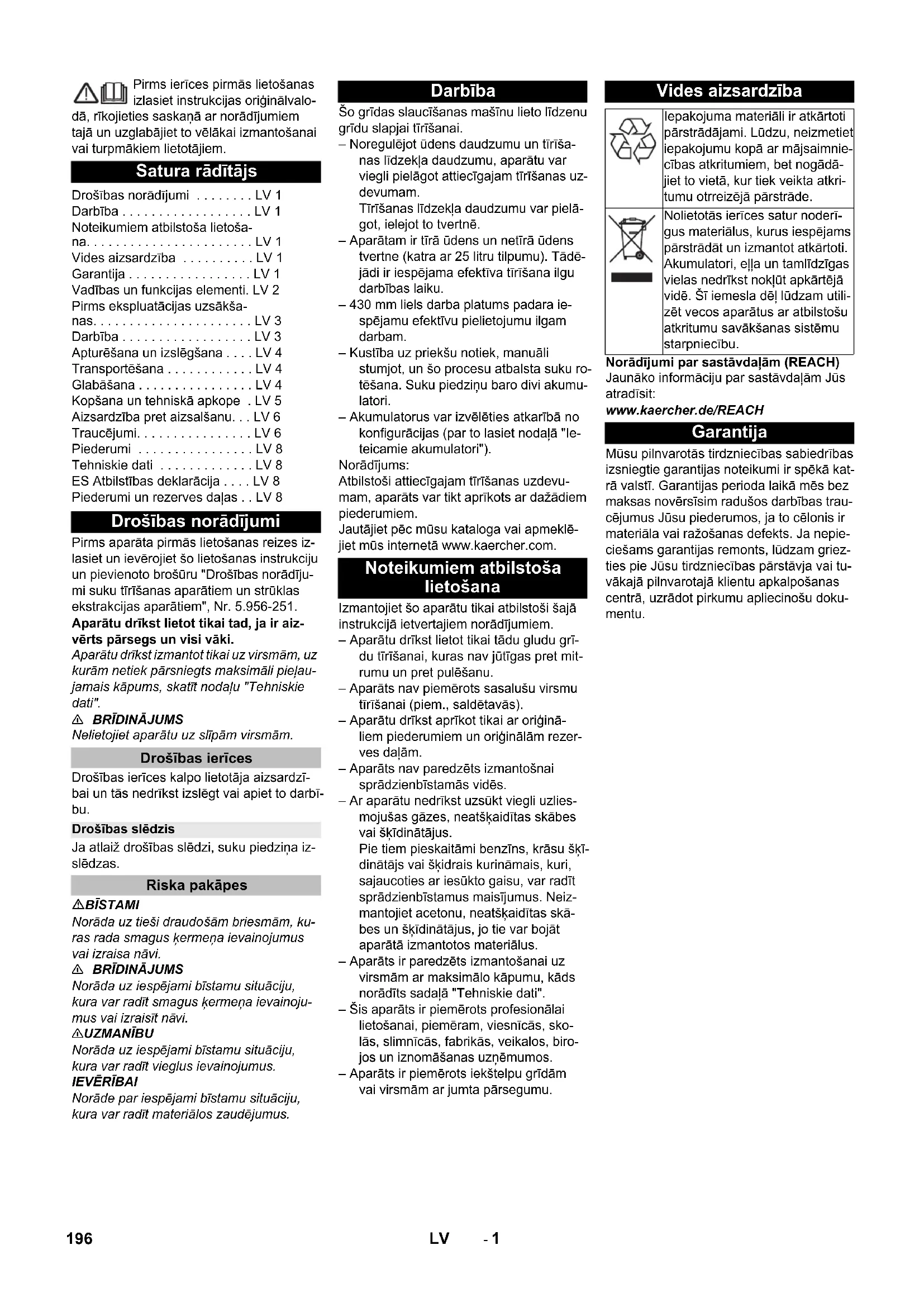 Norāde par iespējami bīstamu situāciju, kura var radīt materiālos zaudējumus. Šo grīdas slaucīšanas mašīnu lieto līdzenu grīdu slapjai tīrīšanai. – Noregulējot ūdens daudzumu un tīrīša- nas līdzekļa daudzumu, aparātu var viegli pielāgot attiecīgajam tīrīšanas uz- devumam. Tīrīšanas līdzekļa daudzumu var pielā- got, ielejot to tvertnē. – Aparātam ir tīrā ūdens un netīrā ūdens tvertne (katra ar 25 litru tilpumu). Tādē- jādi ir iespējama efektīva tīrīšana ilgu darbības laiku. – 430 mm liels darba platums padara ie- spējamu efektīvu pielietojumu ilgam darbam. – Kustība uz priekšu notiek, manuāli stumjot, un šo procesu atbalsta suku ro- tēšana. Suku piedziņu baro divi akumu- latori. – Akumulatorus var izvēlēties atkarībā no konfigurācijas (par to lasiet nodaļā "Ie- teicamie akumulatori"). Norādījums: Atbilstoši attiecīgajam tīrīšanas uzdevu- mam, aparāts var tikt aprīkots ar dažādiem piederumiem. Jautājiet pēc mūsu kataloga vai apmeklē- jiet mūs internetā www.kaercher.com. Izmantojiet šo aparātu tikai atbilstoši šajā instrukcijā ietvertajiem norādījumiem. – Aparātu drīkst lietot tikai tādu gludu grī- du tīrīšanai, kuras nav jūtīgas pret mit- rumu un pret pulēšanu. – Aparāts nav piemērots sasalušu virsmu tīrīšanai (piem., saldētavās). – Aparātu drīkst aprīkot tikai ar oriģinā- liem piederumiem un oriģinālām rezer- ves daļām. – Aparāts nav paredzēts izmantošnai sprādzienbīstamās vidēs. – Ar aparātu nedrīkst uzsūkt viegli uzlies- mojušas gāzes, neatšķaidītas skābes vai šķīdinātājus. Pie tiem pieskaitāmi benzīns, krāsu šķī- dinātājs vai šķidrais kurināmais, kuri, sajaucoties ar iesūkto gaisu, var radīt sprādzienbīstamus maisījumus. Neiz- mantojiet acetonu, neatšķaidītas skā- bes un šķīdinātājus, jo tie var bojāt aparātā izmantotos materiālus. – Aparāts ir paredzēts izmantošanai uz virsmām ar maksimālo kāpumu, kāds norādīts sadaļā "Tehniskie dati". – Šis aparāts ir piemērots profesionālai lietošanai, piemēram, viesnīcās, sko- lās, slimnīcās, fabrikās, veikalos, biro- jos un iznomāšanas uzņēmumos. – Aparāts ir piemērots iekštelpu grīdām vai virsmām ar jumta pārsegumu. Norādījumi par sastāvdaļām (REACH) Jaunāko informāciju par sastāvdaļām Jūs atradīsit: www.kaercher.de/REACH Mūsu pilnvarotās tirdzniecības sabiedrības izsniegtie garantijas noteikumi ir spēkā kat- rā valstī. Garantijas perioda laikā mēs bez maksas novērsīsim radušos darbības trau- cējumus Jūsu piederumos, ja to cēlonis ir materiāla vai ražošanas defekts. Ja nepie- ciešams garantijas remonts, lūdzam griez- ties pie Jūsu tirdzniecības pārstāvja vai tu- vākajā pilnvarotajā klientu apkalpošanas centrā, uzrādot pirkumu apliecinošu doku- mentu. Satura rādītājs Drošības norādījumi . . . . . . . . LV 1 Darbība . . . . . . . . . . . . . . . . . . LV 1 Noteikumiem atbilstoša lietoša- na. . . . . . . . . . . . . . . . . . . . . . . LV 1 Vides aizsardzība . . . . . . . . . . LV 1 Garantija . . . . . . . . . . . . . . . . . LV 1 Vadības un funkcijas elementi. LV 2 Pirms ekspluatācijas uzsākša- nas. . . . . . . . . . . . . . . . . . . . . . LV 3 Darbība . . . . . . . . . . . . . . . . . . LV 3 Apturēšana un izslēgšana . . . . LV 4 Transportēšana . . . . . . . . . . . . LV 4 Glabāšana . . . . . . . . . . . . . . . . LV 4 Kopšana un tehniskā apkope . LV 5 Aizsardzība pret aizsalšanu. . . LV 6 Traucējumi. . . . . . . . . . . . . . . . LV 6 Piederumi . . . . . . . . . . . . . . . . LV 8 Tehniskie dati . . . . . . . . . . . . . LV 8 ES Atbilstības deklarācija . . . . LV 8 Piederumi un rezerves daļas . . LV 8 Drošības norādījumi Drošības ierīces Drošības slēdzis Riska pakāpes Darbība Noteikumiem atbilstoša lietošana Vides aizsardzība Iepakojuma materiāli ir atkārtoti pārstrādājami. Lūdzu, neizmetiet iepakojumu kopā ar mājsaimnie- cības atkritumiem, bet nogādā- jiet to vietā, kur tiek veikta atkri- tumu otrreizējā pārstrāde. Nolietotās ierīces satur noderī- gus materiālus, kurus iespējams pārstrādāt un izmantot atkārtoti. Akumulatori, eļļa un tamlīdzīgas vielas nedrīkst nokļūt apkārtējā vidē. Šī iemesla dēļ lūdzam utili- zēt vecos aparātus ar atbilstošu atkritumu savākšanas sistēmu starpniecību. Garantija 196 LV- 2 1 Šķiedru filtrs 2 Drošības slēdzis 3 Akumulators * 4 Netīrā ūdens tvertnes noteces šļūtene ar dozētāju 5 Homebase turētājsliede 6 Pludiņš 7 Tīrā ūdens tvertne 8 Tīrā ūdens tvertnes noslēgs 9 Tīrīšanas galviņa 10 Diskveida suka 11 Tīrā ūdens tvertnes iepildīšanas atvē- rums 12 Stīpa suku nomaiņai 13 Netīrā ūdens tvertne 14 Transportēšanas šasijas pedālis 15 Tīrā ūdens uzpildes līmeņa indikācija 16 Grozāmrokturis sūkšanas stieņa sa- svēršanai 17 Sūkšanas stieņa augstuma regulēšana * 18 Uzgriežņi sūkšanas stieņa nostiprinā- šanai 19 Sūkšanas stienis * 20 Sūkšanas šļūtene 21 Ūdens daudzuma regulēšanas poga 22 Baterijas kontaktspraudnis 23 Sūkšanas stieņa nolaišanas svira 24 Vadības pults 25 Vadāmais rokturis 26 Novietne tīrīšanas komplektam "Home- base Box" 27 Netīrā ūdens tvertnes vāks