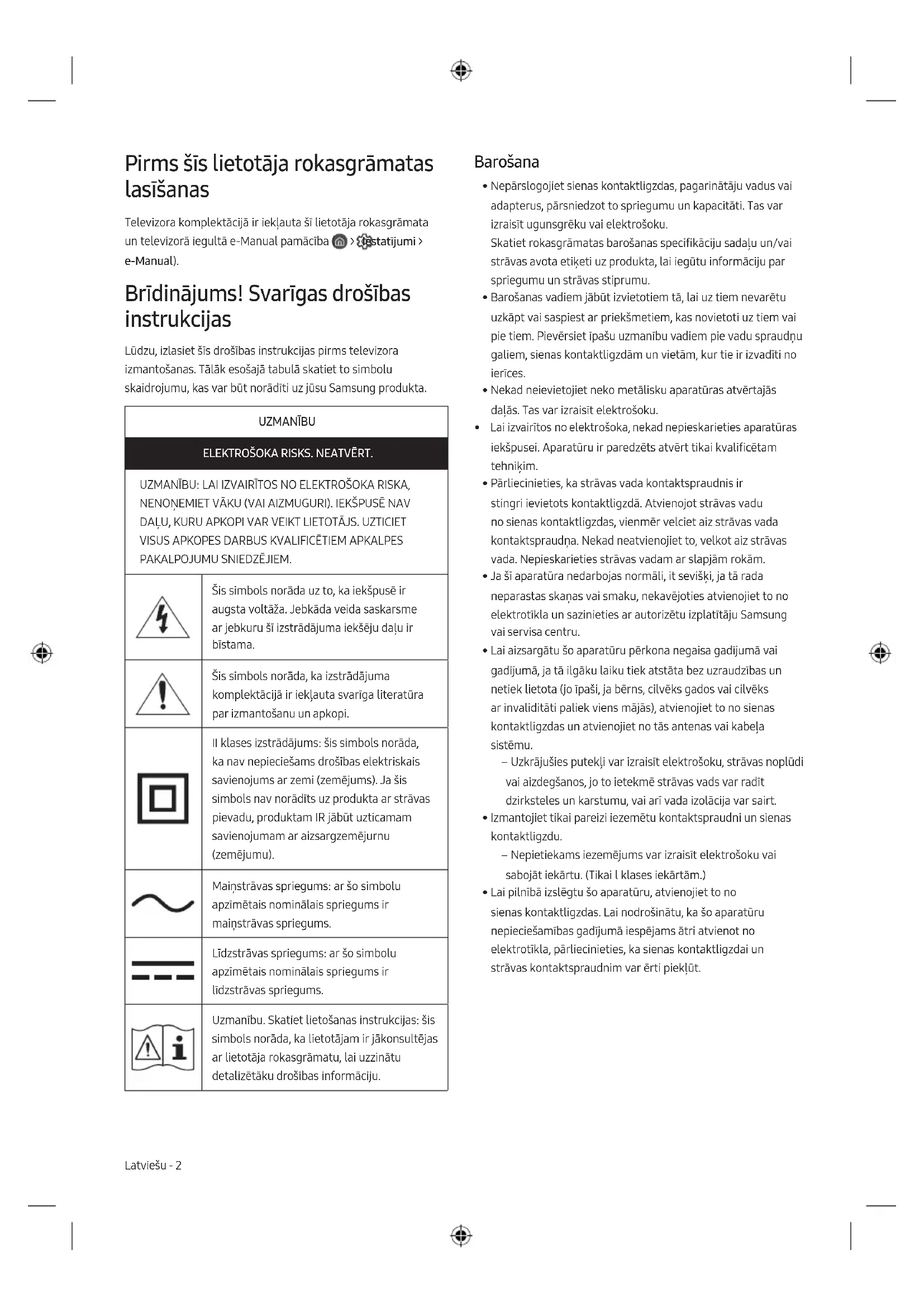 - Lietotāja rokasgrāmatas attēli un ilustrācijas ir sniegti tikai uzziņai un var atšķirties no izstrādājuma patiesā izskata. Izstrādājuma dizains un specifikācijas var mainīties bez iepriekšēja brīdinājuma. Pēc neautorizēta pakalpojuma sniedzēja veiktiem labojumiem, paša lietotāja veiktiem labojumiem vai neprofesionāļa veiktiem produkta labojumiem Samsung neatbild par jebkādu produkta bojājumu, kaitējumu vai jebkādu produkta drošības jautājumu, ko izraisījis mēģinājums labot produktu, precīzi neievērojot šīs labošanas un uzturēšanas instrukcijas. Jebkāds produkta bojājums, ko izraisījis jebkuras personas, kas nav Samsung sertificēts pakalpojuma sniedzējs, mēģinājums to labot, netiks segts ar garantiju. Lūdzu, apmeklējiet tīmekļa vietni samsung.com/support, lai atrastu sīkāku informāciju par ārējo strāvas adapteri un tālvadības pulti, kas ir saistīti ar ES Ekodizaina direktīvu - ErP regulējumu Latviešu - 8Izstrādājuma pareiza likvidēšana (Attiecas uz nolietotām elektriskām un elektroniskām ierīcēm) (Piemērojams valstīs ar atsevišķām savākšanas sistēmām) Šis apzīmējums, kas redzams uz izstrādājuma, papildpiederumiem vai dokumentācijā, norāda, ka no izstrādājuma un tā elektroniskajiem papildpiederumiem (piem., lādētāja, austiņām, USB vada) kalpošanas laika beigās nedrīkst atbrīvoties kopā ar citiem mājsaimniecības atkritumiem. Lai novērstu videi un cilvēku veselībai iespējamo kaitējumu, kas ir saistīts ar nekontrolējamu atkritumu izmešanu, iepriekšminētie priekšmeti jānošķir no citiem atkritumiem un jāpārstrādā, lai sekmētu materiālo resursu atbildīgu atkārtotu lietošanu. Mājsaimniecības lietotājiem jāsazinās vai nu ar veikalu, kurā šis izstrādājums ir pirkts, vai vietējo pašvaldību, lai saņemtu informāciju par vietu un veidu, kādā var nodrošināt videi draudzīgu šī izstrādājuma otrreizēju pārstrādi. Rūpnieciskajiem lietotājiem jāsazinās ar piegādātāju un jāpārbauda pirkuma līguma nosacījumi. Šo izstrādājumu un tā elektroniskos papildpiederumus nedrīkst sajaukt ar citiem rūpnieciskajiem atkritumiem. Izstrādājuma bateriju pareiza likvidēšana (Piemērojams valstīs ar atsevišķām savākšanas sistēmām) Šis baterijas, rokasgrāmatas vai iepakojuma marķējums norāda, ka izstrādājuma baterijas to ekspluatācijas laika beigās nedrīkst izmest kopā ar citiem mājsaimniecības atkritumiem. Marķējumi ar ķīmiskajiem simboliem Hg, Cd vai Pb norāda, ka baterijas dzīvsudraba, kadmija vai svina daudzums pārsniedz Direktīvā 2006/66/EK norādītos līmeņus. Ja no baterijām neatbrīvojas atbilstoši nosacījumiem, šīs vielas var radīt kaitējumu cilvēku veselībai un videi. Lai aizsargātu dabas resursus un veicinātu materiālu otrreizēju izmantošanu, lūdzu, atdaliet baterijas no cita veida atkritumiem un nododiet pārstrādei, izmantojot vietējo bezmaksas bateriju savākšanas sistēmu. Latviešu - 9 LatviešuPrieš skaitant šį naudotojo vadovą Be šio naudotojo vadovo, televizoriuje taip pat yra „e-Manual“ ( > Nustatymai > e-Manual). Įspėjimas! Svarbūs saugos nurodymai Prieš naudodami televizorių, perskaitykite saugos nurodymus. Simbolių, kurių gali būti ant jūsų „Samsung“ gaminio, paaiškinimus rasite toliau pateiktoje lentelėje. ATSARGIAI ELEKTROS SMŪGIO PAVOJUS. NEATIDARYTI. ATSARGIAI. KAD SUMAŽINTUMĖTE ELEKTROS IŠKROVOS RIZIKĄ, NENUIMKITE DANGČIO (ARBA UŽPAKALINĖS DALIES). NĖRA VIDINIŲ DALIŲ, KURIAS GALI PRIŽIŪRĖTI NAUDOTOJAS. VISAS PRIEŽIŪROS PASLAUGAS TURI ATLIKTI KVALIFIKUOTAS TECHNIKAS. Šis simbolis nurodo, kad viduje teka aukšta įtampa. Liestis su bet kokiomis vidinėmis gaminio dalimis yra pavojinga. Šis simbolis nurodo, kad televizorius pristatomas kartu su svarbia medžiaga apie jo veikimą ir techninę priežiūrą. Tai yra II klasės prietaisas. Šis simbolis reiškia, kad apsauginis elektrinis sujungimas su žeme (įžeminimas) nebūtinas. Jeigu šio simbolio ant gaminio su maitinimo laidu nėra, gaminys PRIVALO turėti patikimą įžeminimo jungtį. Kintamosios srovės įtampa. Šiuo simboliu pažymėta vardinė įtampa yra kintamosios srovės įtampa. Nuolatinės srovės įtampa. Šiuo simboliu pažymėta vardinė įtampa yra nuolatinės srovės įtampa. Dėmesio. Vadovaukitės naudojimo instrukcijomis. Šis simbolis rodo, kad būtina vadovautis naudojimo instrukcijomis, susijusiomis su sauga. Maitinimas