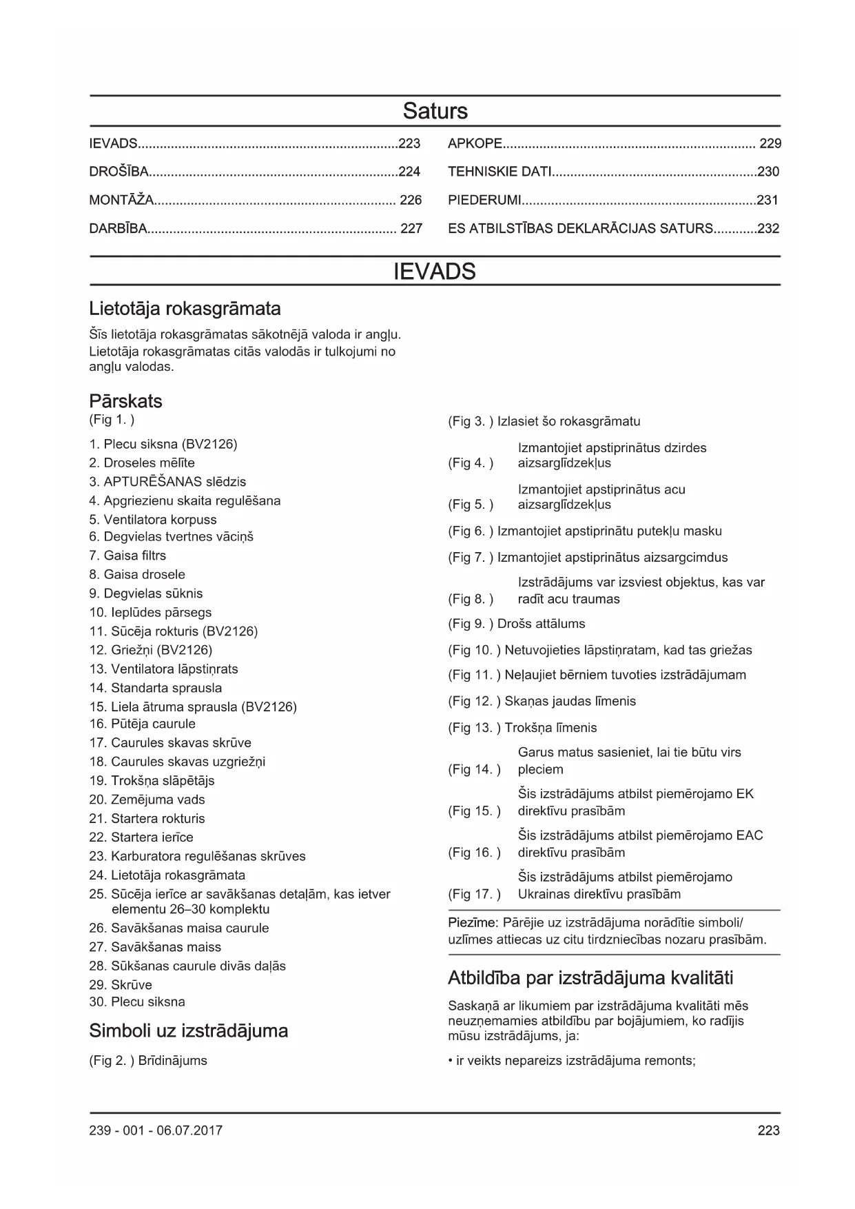 Simboli uz izstrādājuma (Fig 2. ) Brīdinājums (Fig 3. ) Izlasiet šo rokasgrāmatu (Fig 4. ) Izmantojiet apstiprinātus dzirdes aizsarglīdzekļus (Fig 5. ) Izmantojiet apstiprinātus acu aizsarglīdzekļus (Fig 6. ) Izmantojiet apstiprinātu putekļu masku (Fig 7. ) Izmantojiet apstiprinātus aizsargcimdus (Fig 8. ) Izstrādājums var izsviest objektus, kas var radīt acu traumas (Fig 9. ) Drošs attālums (Fig 10. ) Netuvojieties lāpstiņratam, kad tas griežas (Fig 11. ) Neļaujiet bērniem tuvoties izstrādājumam (Fig 12. ) Skaņas jaudas līmenis (Fig 13. ) Trokšņa līmenis (Fig 14. ) Garus matus sasieniet, lai tie būtu virs pleciem (Fig 15. ) Šis izstrādājums atbilst piemērojamo EK direktīvu prasībām (Fig 16. ) Šis izstrādājums atbilst piemērojamo EAC direktīvu prasībām (Fig 17. ) Šis izstrādājums atbilst piemērojamo Ukrainas direktīvu prasībām Piezīme: Pārējie uz izstrādājuma norādītie simboli/ uzlīmes attiecas uz citu tirdzniecības nozaru prasībām. Atbildība par izstrādājuma kvalitāti Saskaņā ar likumiem par izstrādājuma kvalitāti mēs neuzņemamies atbildību par bojājumiem, ko radījis mūsu izstrādājums, ja: