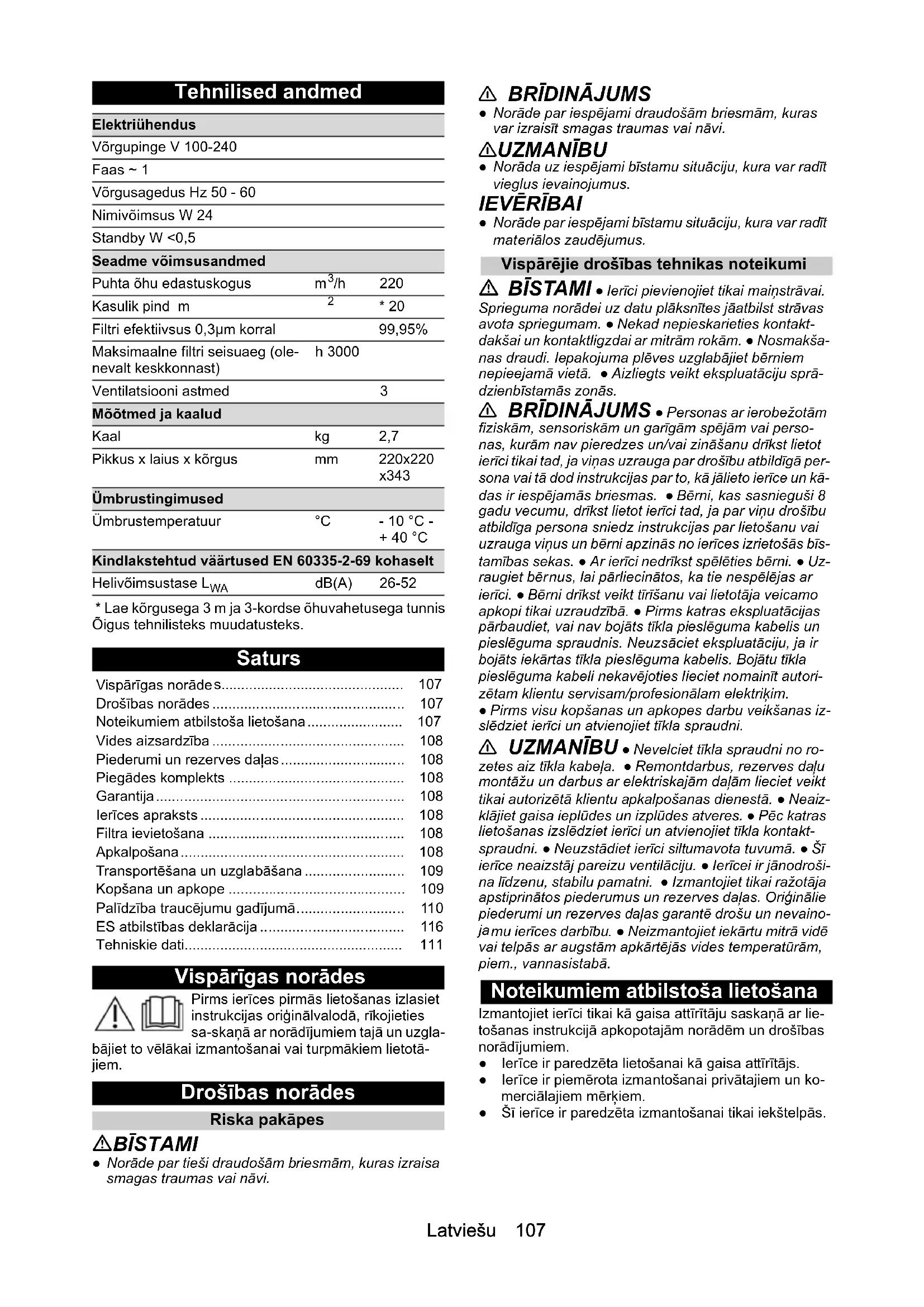 - Lae kõrgusega 3 m ja 3-kordse õhuvahetusega tunnis Õigus tehnilisteks muudatusteks. Saturs Vispārīgas norādes Pirms ierīces pirmās lietošanas izlasiet instrukcijas oriģinālvalodā, rīkojieties sa-skaņā ar norādījumiem tajā un uzgla- bājiet to vēlākai izmantošanai vai turpmākiem lietotā- jiem. Drošības norādes Riska pakāpes BĪSTAMI ● Norāde par tieši draudošām briesmām, kuras izraisa smagas traumas vai nāvi.