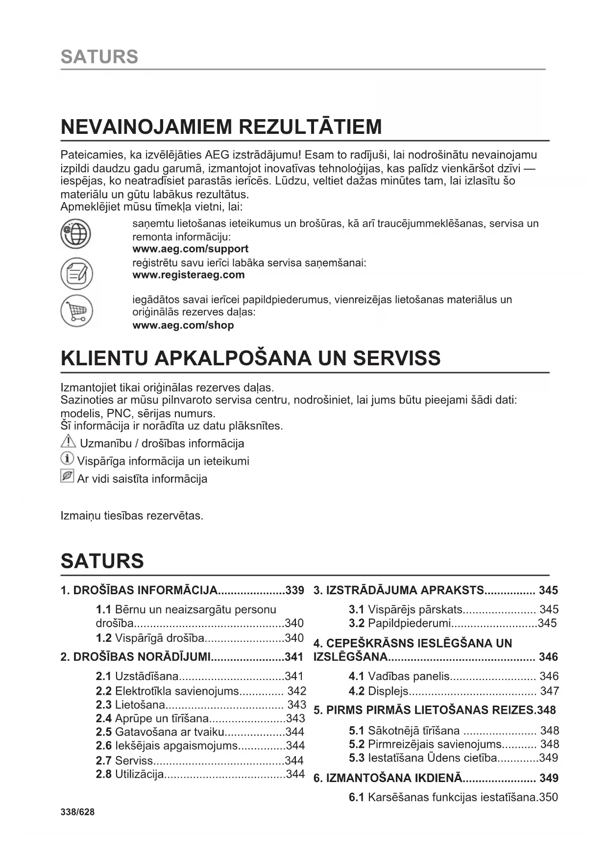 Pateicamies, ka izvēlējāties AEG izstrādājumu! Esam to radījuši, lai nodrošinātu nevainojamu izpildi daudzu gadu garumā, izmantojot inovatīvas tehnoloģijas, kas palīdz vienkāršot dzīvi — iespējas, ko neatradīsiet parastās ierīcēs. Lūdzu, veltiet dažas minūtes tam, lai izlasītu šo materiālu un gūtu labākus rezultātus. Apmeklējiet mūsu tīmekļa vietni, lai: saņemtu lietošanas ieteikumus un brošūras, kā arī traucējummeklēšanas, servisa un remonta informāciju: www.aeg.com/support reģistrētu savu ierīci labāka servisa saņemšanai: www.registeraeg.com iegādātos savai ierīcei papildpiederumus, vienreizējas lietošanas materiālus un oriģinālās rezerves daļas: www.aeg.com/shop