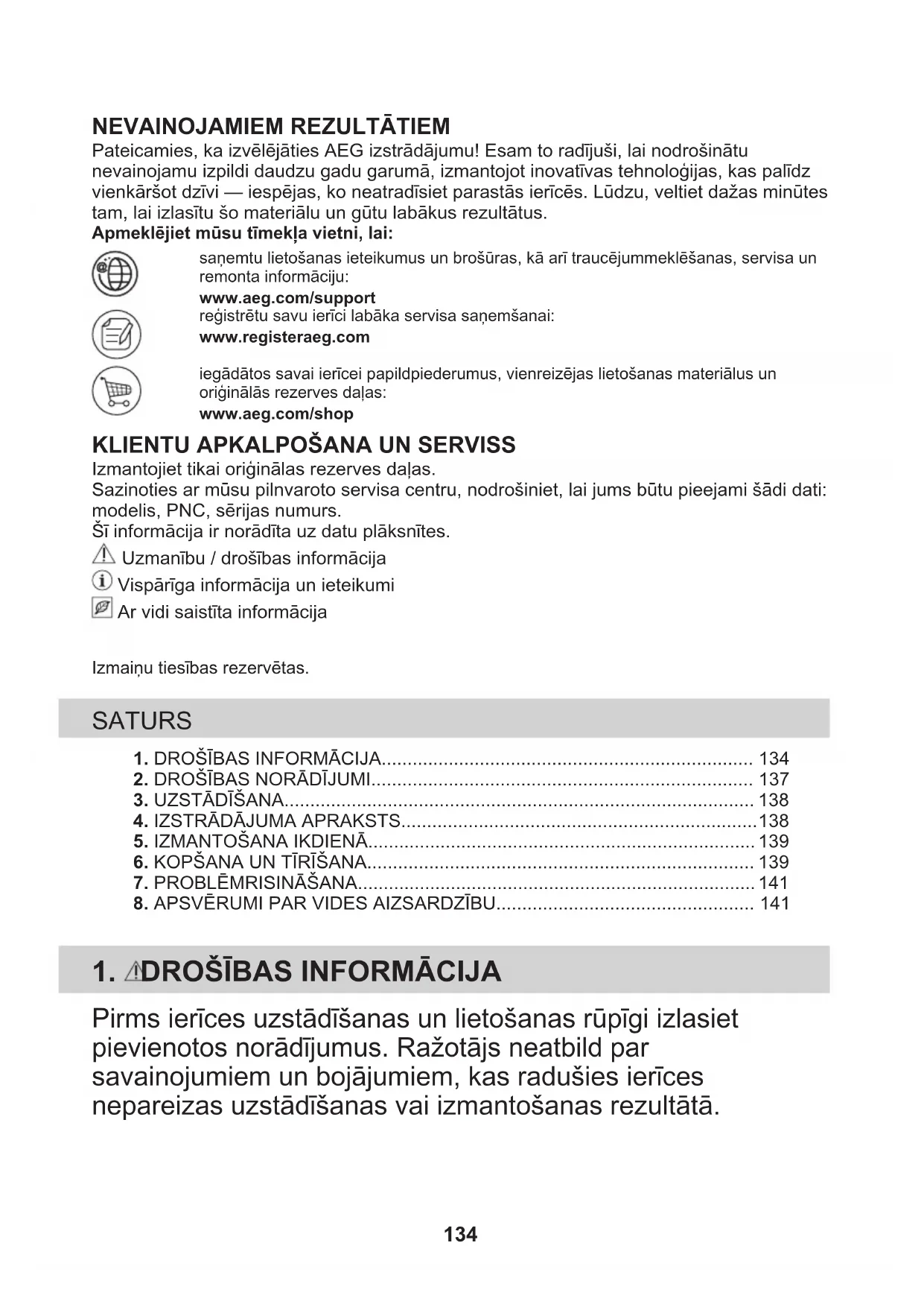 Pateicamies, ka izvēlējāties AEG izstrādājumu! Esam to radījuši, lai nodrošinātunevainojamu izpildi daudzu gadu garumā, izmantojot inovatīvas tehnoloģijas, kas palīdzvienkāršot dzīvi — iespējas, ko neatradīsiet parastās ierīcēs. Lūdzu, veltiet dažas minūtestam, lai izlasītu šo materiālu un gūtu labākus rezultātus.Apmeklējiet mūsu tīmekļa vietni, lai:saņemtu lietošanas ieteikumus un brošūras, kā arī traucējummeklēšanas, servisa unremonta informāciju:www.aeg.com/supportreģistrētu savu ierīci labāka servisa saņemšanai:www.registeraeg.comiegādātos savai ierīcei papildpiederumus, vienreizējas lietošanas materiālus unoriģinālās rezerves daļas:www.aeg.com/shop