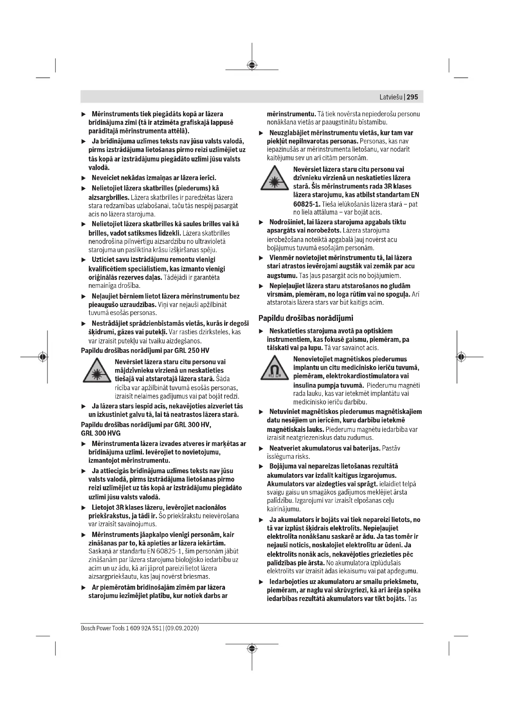 LIETOTĀJAM. u Uzmanību – ja tiek veiktas citas darbības vai lietotas citas regulēšanas ierīces, nekā norādīts šeit vai citos procedūru aprakstos, tas var radīt bīstamu starojuma iedarbību. 1 609 92A 5S1 | (09.09.2020) Bosch Power ToolsLatviešu | 295 u Mērinstruments tiek piegādāts kopā ar lāzera brīdinājuma zīmi (tā ir atzīmēta grafiskajā lappusē parādītajā mērinstrumenta attēlā). u Ja brīdinājuma uzlīmes teksts nav jūsu valsts valodā, pirms izstrādājuma lietošanas pirmo reizi uzlīmējiet uz tās kopā ar izstrādājumu piegādāto uzlīmi jūsu valsts valodā. u Neveiciet nekādas izmaiņas ar lāzera ierīci. u Nelietojiet lāzera skatbrilles (piederums) kā aizsargbrilles. Lāzera skatbrilles ir paredzētas lāzera stara redzamības uzlabošanai, taču tās nespēj pasargāt acis no lāzera starojuma. u Nelietojiet lāzera skatbrilles kā saules brilles vai kā brilles, vadot satiksmes līdzekli. Lāzera skatbrilles nenodrošina pilnvērtīgu aizsardzību no ultravioletā starojuma un pasliktina krāsu izšķiršanas spēju. u Uzticiet savu izstrādājumu remontu vienīgi kvalificētiem speciālistiem, kas izmanto vienīgi oriģinālās rezerves daļas. Tādējādi ir garantēta nemainīga drošība. u Neļaujiet bērniem lietot lāzera mērinstrumentu bez pieaugušo uzraudzības. Viņi var nejauši apžilbināt tuvumā esošās personas. u Nestrādājiet sprādzienbīstamās vietās, kurās ir degoši šķidrumi, gāzes vai putekļi. Var rasties dzirksteles, kas var izraisīt putekļu vai tvaiku aizdegšanos. Papildu drošības norādījumi par GRL250HV Nevērsiet lāzera staru citu personu vai mājdzīvnieku virzienā un neskatieties tiešajā vai atstarotajā lāzera starā. Šāda rīcība var apžilbināt tuvumā esošās personas, izraisīt nelaimes gadījumus vai pat bojāt redzi. u Ja lāzera stars iespīd acīs, nekavējoties aizveriet tās un izkustiniet galvu tā, lai tā neatrastos lāzera starā. Papildu drošības norādījumi par GRL300HV, GRL300HVG u Mērinstrumenta lāzera izvades atveres ir marķētas ar brīdinājuma uzlīmi. Ievērojiet to novietojumu, izmantojot mērinstrumentu. u Ja attiecīgās brīdinājuma uzlīmes teksts nav jūsu valsts valodā, pirms izstrādājuma lietošanas pirmo reizi uzlīmējiet uz tās kopā ar izstrādājumu piegādāto uzlīmi jūsu valsts valodā. u Lietojot 3R klases lāzeru, ievērojiet nacionālos priekšrakstus, ja tādi ir. Šo priekšrakstu neievērošana var izraisīt savainojumus. u Mērinstruments jāapkalpo vienīgi personām, kair zināšanas par to, kā apieties ar lāzera iekārtām. Saskaņā ar standartu EN 60825-1, šīm personām jābūt zināšanām par lāzera starojuma bioloģisko iedarbību uz acīm un uz ādu, kā arī jāprot pareizi lietot lāzera aizsargpriekšautu, kas ļauj novērst briesmas. u Ar piemērotām brīdinošajām zīmēm par lāzera starojumu iezīmējiet platību, kur notiek darbs ar mērinstrumentu. Tā tiek novērsta nepiederošu personu nonākšana vietās ar paaugstinātu bīstamību. u Neuzglabājiet mērinstrumentu vietās, kur tam var piekļūt nepilnvarotas personas. Personas, kas nav iepazinušās ar mērinstrumenta lietošanu, var nodarīt kaitējumu sev un arī citām personām. Nevērsiet lāzera staru citu personu vai dzīvnieku virzienā un neskatieties lāzera starā. Šis mērinstruments rada 3R klases lāzera starojumu, kas atbilst standartam EN 60825-1. Tieša ielūkošanās lāzera starā– pat no liela attāluma– var bojāt acis. u Nodrošiniet, lai lāzera starojuma apgabals tiktu apsargāts vai norobežots. Lāzera starojuma ierobežošana noteiktā apgabalā ļauj novērst acu bojājumus tuvumā esošajām personām. u Vienmēr novietojiet mērinstrumentu tā, lai lāzera stari atrastos ievērojami augstāk vai zemāk par acu augstumu. Tas ļaus pasargāt acis no bojājumiem. u Nepieļaujiet lāzera staru atstarošanos no gludām virsmām, piemēram, no loga rūtīm vai no spoguļa. Arī atstarotais lāzera stars var būt kaitīgs acīm. Papildu drošības norādījumi u Neskatieties starojuma avotā pa optiskiem instrumentiem, kas fokusē gaismu, piemēram, pa tālskati vai pa lupu. Tā var savainot acis. Nenovietojiet magnētiskos piederumus implantu un citu medicīnisko ierīču tuvumā, piemēram, elektrokardiostimulatora vai insulīna pumpja tuvumā. Piederumu magnēti rada lauku, kas var ietekmēt implantātu vai medicīnisko ierīču darbību. u Netuviniet magnētiskos piederumus magnētiskajiem datu nesējiem un ierīcēm, kuru darbību ietekmē magnētiskais lauks. Piederumu magnētu iedarbība var izraisīt neatgriezeniskus datu zudumus. u Neatveriet akumulatorus vai baterijas. Pastāv īsslēguma risks. u Bojājuma vai nepareizas lietošanas rezultātā akumulators var izdalīt kaitīgus izgarojumus. Akumulators var aizdegties vai sprāgt. ielaidiet telpā svaigu gaisu un smagākos gadījumos meklējiet ārsta palīdzību. Izgarojumi var izraisīt elpošanas ceļu kairinājumu. u Ja akumulators ir bojāts vai tiek nepareizi lietots, no tā var izplūst šķidrais elektrolīts. Nepieļaujiet elektrolīta nonākšanu saskarē ar ādu. Ja tas tomēr ir nejauši noticis, noskalojiet elektrolītu ar ūdeni. Ja elektrolīts nonāk acīs, nekavējoties griezieties pēc palīdzības pie ārsta. No akumulatora izplūdušais elektrolīts var izraisīt ādas iekaisumu vai pat apdegumu. u Iedarbojoties uz akumulatoru ar smailu priekšmetu, piemēram, ar naglu vai skrūvgriezi, kā arī ārēja spēka iedarbības rezultātā akumulators var tikt bojāts. Tas Bosch Power Tools 1 609 92A 5S1 | (09.09.2020)296 | Latviešu var radīt iekšēju īsslēgumu, kā rezultātā akumulators var aizdegties, dūmot, eksplodēt vai pārkarst. u Laikā, kad akumulators netiek lietots, nepieļaujiet tā kontaktu saskaršanos ar saspraudēm, monētām, atslēgām, naglām, skrūvēm vai citiem nelieliem metāla priekšmetiem, kas varētu i