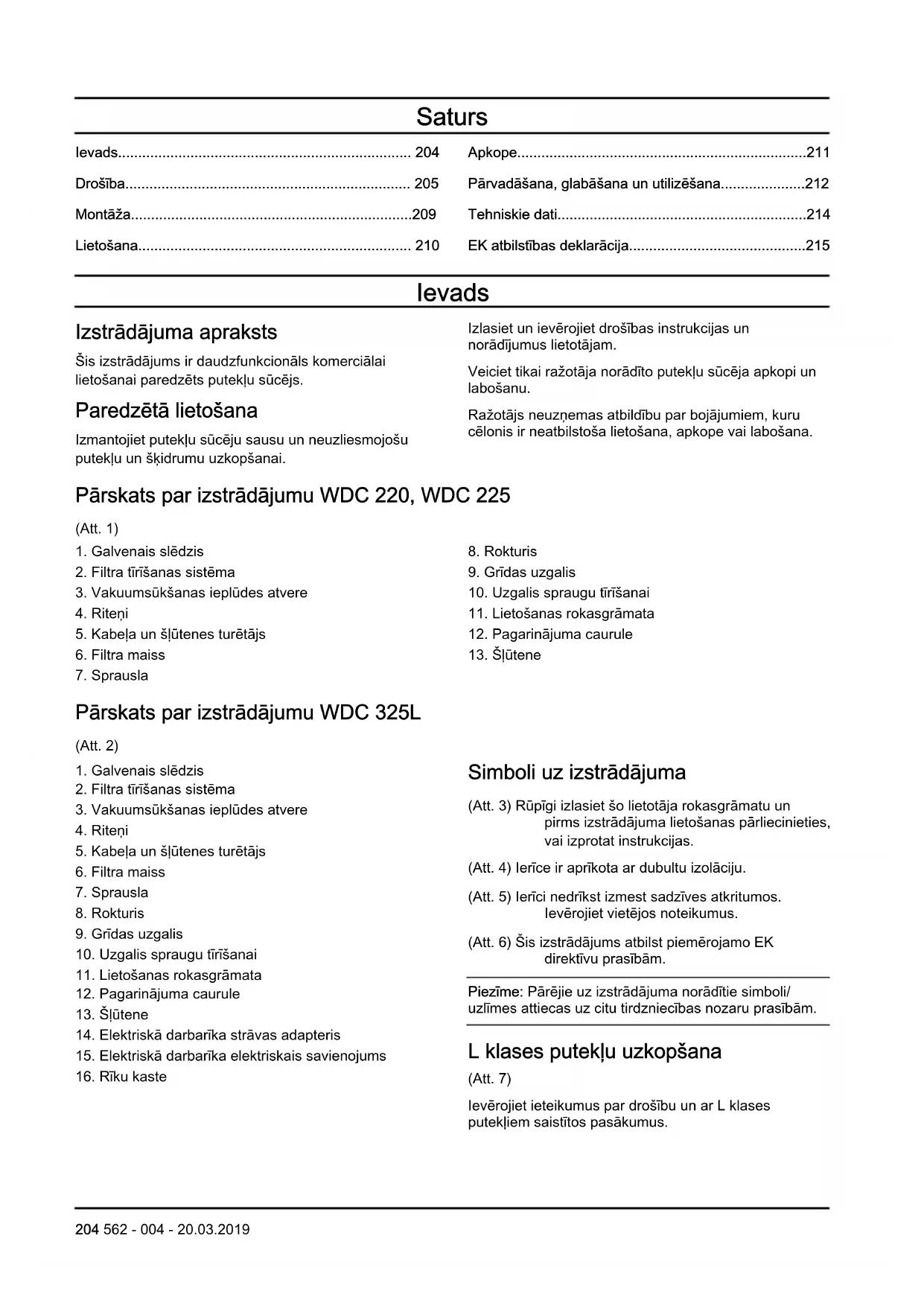 - EK atbilstības deklarācija Ievads Izstrādājuma apraksts Šis izstrādājums ir daudzfunkcionāls komerciālai lietošanai paredzēts putekļu sūcējs. Paredzētā lietošana Izmantojiet putekļu sūcēju sausu un neuzliesmojošu putekļu un šķidrumu uzkopšanai. Izlasiet un ievērojiet drošības instrukcijas un norādījumus lietotājam. Veiciet tikai ražotāja norādīto putekļu sūcēja apkopi un labošanu. Ražotājs neuzņemas atbildību par bojājumiem, kuru cēlonis ir neatbilstoša lietošana, apkope vai labošana. Pārskats par izstrādājumu WDC 220, WDC 225 (Att. 1) p. 215