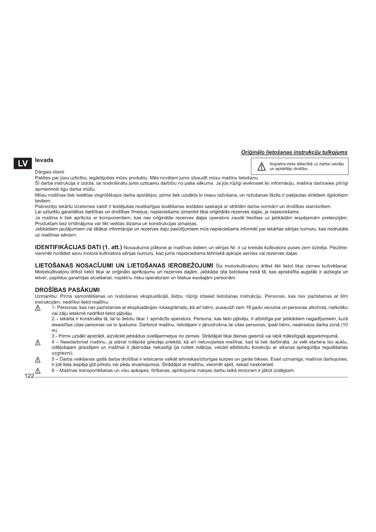 Uzmanību: Pirms samontēšanas un nodošanas ekspluatācijā, lūdzu, rūpīgi izlasiet lietošanas instrukciju. Personas, kas nav pazīstamas ar šīm instrukcijām, nedrīkst lietot mašīnu. 1- Personas, kas nav pazīstamas ar ekspluatācijas rokasgrāmatu, kā arī bērni, pusaudži zem 16 gadu vecuma un personas alkohola, narkotiku vai zāļu ietekmē nedrīkst lietot pļāvēju. 2 – Iekārta ir konstruēta tā, lai to lietotu tikai 1 apmācīts operators. Persona, kas lieto pļāvēju, ir atbildīga par jebkādiem negadījumiem, kurā iesaistītas citas personas vai to īpašums. Darbinot mašīnu, lietotājam ir jānodrošina lai citas personas, īpaši bērni, neatrastos darba zonā (10 m). 3 - Pirms uzsākt apstrādi, aizvāciet jebkādus svešķermeņus no zemes. Strādājiet tikai dienas gaismā vai labā mākslīgajā apgaismojumā. 4 – Neiedarbiniet mašīnu, ja stāvat rotējoša griezēja priekšā, kā arī netuvojieties mašīnai, kad tā tiek darbināta. Ja velk startera īso auklu, rotējošajam griezējam un mašīnai ir jāatrodas nekustīgi (ja notiek rotācija, veiciet atbilstošu korekciju ar siksnas spriegotāja regulēšanas uzgriezni). 5 – Darba veikšanas gaitā darba drošībai ir ieteicams valkāt tehniskas/izturīgas kurpes un garās bikses. Esiet uzmanīgs, mašīnai darbojoties, ir ļoti liela iespēja gūt pirkstu vai pēdu ievainojumus. Strādājot ar mašīnu, vienmēr ejiet, nekad neskrieniet. 6 – Mašīnas transportēšanas un visu apkopes, tīrīšanas, aprīkojuma maiņas darbu laikā motoram ir jābūt izslēgtam.