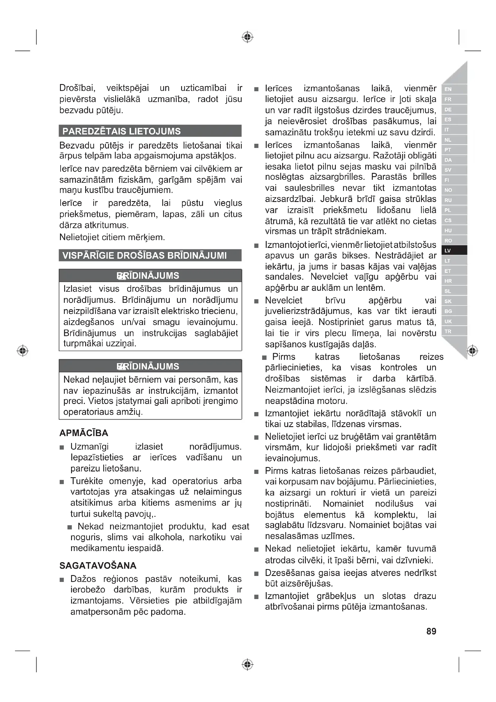 ■ Uzmanīgi izlasiet norādījumus. Iepazīstieties ar ierīces vadīšanu un pareizu lietošanu. ■ Turėkite omenyje, kad operatorius arba vartotojas yra atsakingas už nelaimingus atsitikimus arba kitiems asmenims ar jų turtui sukeltą pavojų,. ■ Nekad neizmantojiet produktu, kad esat noguris, slims vai alkohola, narkotiku vai medikamentu iespaidā. SAGATAVOŠANA ■ Dažos reģionos pastāv noteikumi, kas ierobežo darbības, kurām produkts ir izmantojams. Vērsieties pie atbildīgajām amatpersonām pēc padoma. ■ Ierīces izmantošanas laikā, vienmēr lietojiet ausu aizsargu. Ierīce ir ļoti skaļa un var radīt ilgstošus dzirdes traucējumus, ja neievērosiet drošības pasākumus, lai samazinātu trokšņu ietekmi uz savu dzirdi. ■ Ierīces izmantošanas laikā, vienmēr lietojiet pilnu acu aizsargu. Ražotāji obligāti iesaka lietot pilnu sejas masku vai pilnībā noslēgtas aizsargbrilles. Parastās brilles vai saulesbrilles nevar tikt izmantotas aizsardzībai. Jebkurā brīdī gaisa strūklas var izraisīt priekšmetu lidošanu lielā ātrumā, kā rezultātā tie var atlēkt no cietas virsmas un trāpīt strādniekam. ■ Izmantojot ierīci, vienmēr lietojiet atbilstošus apavus un garās bikses. Nestrādājiet ar iekārtu, ja jums ir basas kājas vai vaļējas sandales. Nevelciet vaļīgu apģērbu vai apģērbu ar auklām un lentēm. ■ Nevelciet brīvu apģērbu vai juvelierizstrādājumus, kas var tikt ierauti gaisa ieejā. Nostipriniet garus matus tā, lai tie ir virs plecu līmeņa, lai novērstu sapīšanos kustīgajās daļās. ■ Pirms katras lietošanas reizes pārliecinieties, ka visas kontroles un drošības sistēmas ir darba kārtībā. Neizmantojiet ierīci, ja izslēgšanas slēdzis neapstādina motoru. ■ Izmantojiet iekārtu norādītajā stāvoklī un tikai uz stabilas, līdzenas virsmas. ■ Nelietojiet ierīci uz bruģētām vai grantētām virsmām, kur lidojoši priekšmeti var radīt ievainojumus. ■ Pirms katras lietošanas reizes pārbaudiet, vai korpusam nav bojājumu. Pārliecinieties, ka aizsargi un rokturi ir vietā un pareizi nostiprināti. Nomainiet nodilušus vai bojātus elementus kā komplektu, lai saglabātu līdzsvaru. Nomainiet bojātas vai nesalasāmas uzlīmes. ■ Nekad nelietojiet iekārtu, kamēr tuvumā atrodas cilvēki, it īpaši bērni, vai dzīvnieki. ■ Dzesēšanas gaisa ieejas atveres nedrīkst būt aizsērējušas. ■ Izmantojiet grābekļus un slotas drazu atbrīvošanai pirms pūtēja izmantošanas.90 | Latviski