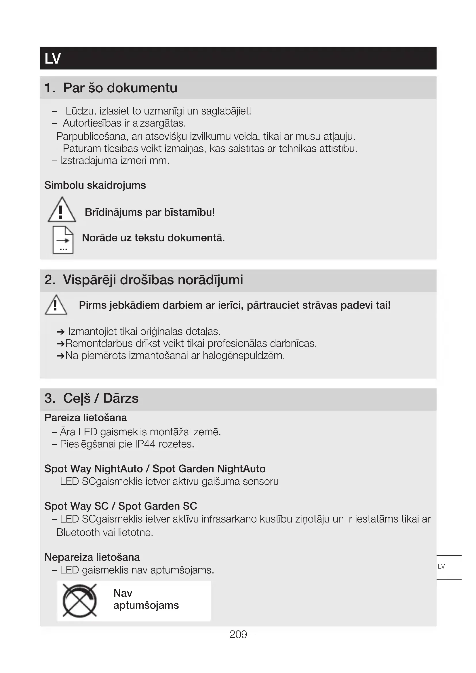 Pareiza lietošana – Āra LED gaismeklis montāžai zemē. – Pieslēgšanai pie IP44 rozetes. Spot Way NightAuto/Spot Garden NightAuto – LED SCgaismeklis ietver aktīvu gaišuma sensoru Spot Way SC/Spot Garden SC – LED SCgaismeklis ietver aktīvu infrasarkano kustību ziņotāju un ir iestatāms tikai ar Bluetooth vai lietotnē. Nepareiza lietošana – LED gaismeklis nav aptumšojams. Nav aptumšojams LV– 210 – Piegādes apjoms Spot Way (3.1 Att.) – Gaismeklis, iekļaujot kāju, grīdas pamatni un pieslēguma kabeli ar kontaktdakšu – Trīs skrūves – Trīs dībeļi Piegādes apjoms Spot Garden (3.2 Att.) – Gaismeklis, iekļaujot pieslēguma kabeli ar kontaktdakšu – Pīķis nostiprināšanai zemē – Divas skrūves Preces izmēri Spot Way (3.3 Att.) Preces izmēri Spot Garden (3.4 Att.) Informācija par preci (3.5 – 3.10 Att.) A Gaismekļa korpuss B Kustību ziņotājs (tikai Spot Way/Garden SC) C Gaišuma sensors (tikai Spot Way/Garden NightAuto) D Aptumšošanas iestatījums (tikai Spot Way/Garden NightAuto) E Kāja ar grīdas pamatni (tikai Spot ceļam) F Pīķis nostiprināšanai zemē (tikai Spot dārzam) G Tīkla pieslēguma kabelis ar kontaktdakšu Uztveres lauks Spot Way/Garden SC (3.11 – 3.16 Att.) Gaismas stipruma sadalījums (3.17 Att.)