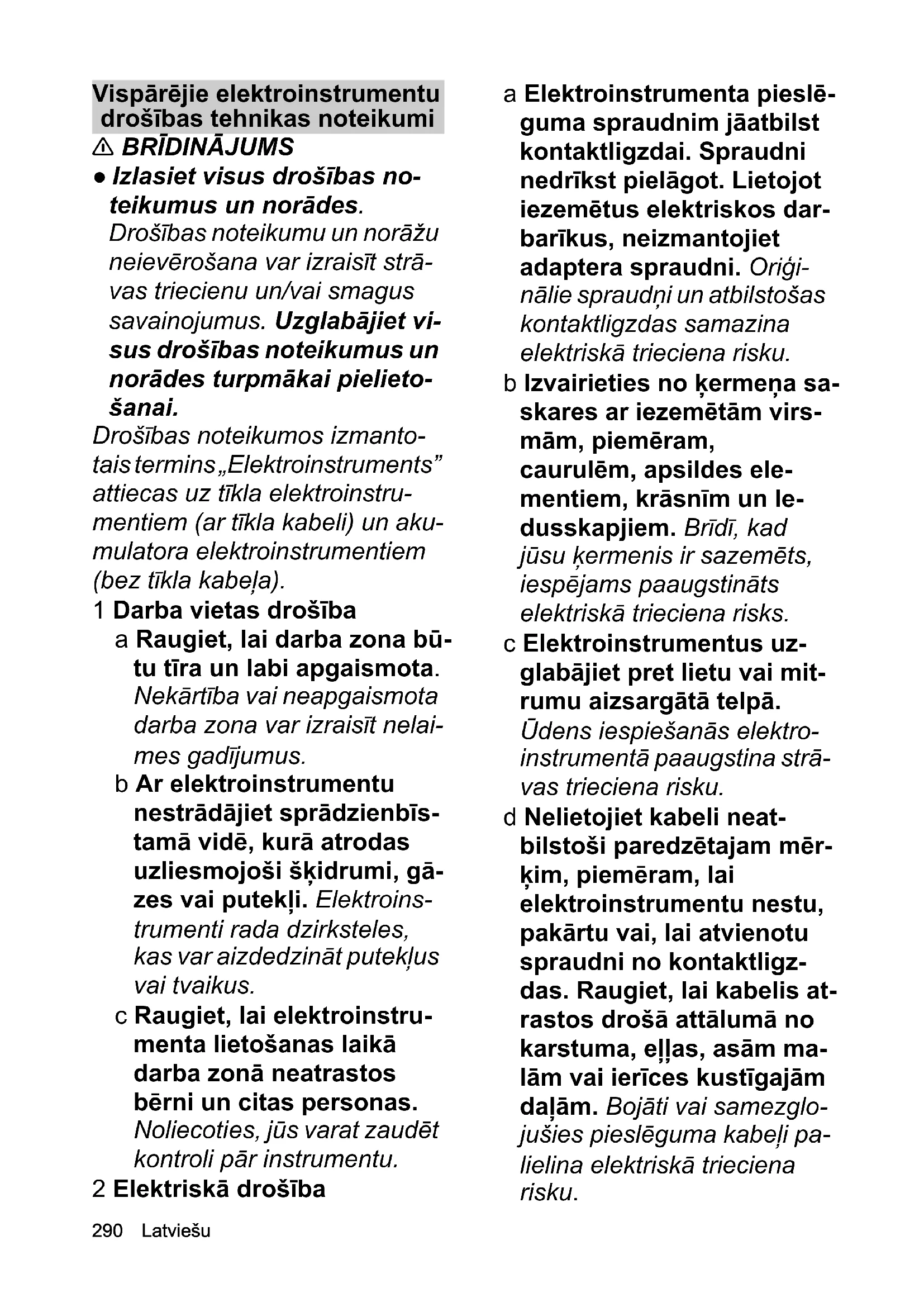 ● Izlasiet visus drošības no- teikumus un norādes. Drošības noteikumu un norāžu neievērošana var izraisīt strā- vas triecienu un/vai smagus savainojumus. Uzglabājiet vi- sus drošības noteikumus un norādes turpmākai pielieto- šanai. Drošības noteikumos izmanto- tais termins „Elektroinstruments” attiecas uz tīkla elektroinstru- mentiem (ar tīkla kabeli) un aku- mulatora elektroinstrumentiem (bez tīkla kabeļa). 1 Darba vietas drošība a Raugiet, lai darba zona bū- tu tīra un labi apgaismota. Nekārtība vai neapgaismota darba zona var izraisīt nelai- mes gadījumus. b Ar elektroinstrumentu nestrādājiet sprādzienbīs- tamā vidē, kurā atrodas uzliesmojoši šķidrumi, gā- zes vai putekļi. Elektroins- trumenti rada dzirksteles, kas var aizdedzināt putekļus vai tvaikus. c Raugiet, lai elektroinstru- menta lietošanas laikā darba zonā neatrastos bērni un citas personas. Noliecoties, jūs varat zaudēt kontroli pār instrumentu. 2 Elektriskā drošība a Elektroinstrumenta pieslē- guma spraudnim jāatbilst kontaktligzdai. Spraudni nedrīkst pielāgot. Lietojot iezemētus elektriskos dar- barīkus, neizmantojiet adaptera spraudni. Oriģi- nālie spraudņi un atbilstošas kontaktligzdas samazina elektriskā trieciena risku. b Izvairieties no ķermeņa sa- skares ar iezemētām virs- mām, piemēram, caurulēm, apsildes ele- mentiem, krāsnīm un le- dusskapjiem. Brīdī, kad jūsu ķermenis ir sazemēts, iespējams paaugstināts elektriskā trieciena risks. c Elektroinstrumentus uz- glabājiet pret lietu vai mit- rumu aizsargātā telpā. Ūdens iespiešanās elektro- instrumentā paaugstina strā- vas trieciena risku. d Nelietojiet kabeli neat- bilstoši paredzētajam mēr- ķim, piemēram, lai elektroinstrumentu nestu, pakārtu vai, lai atvienotu spraudni no kontaktligz- das. Raugiet, lai kabelis at- rastos drošā attālumā no karstuma, eļļas, asām ma- lām vai ierīces kustīgajām daļām. Bojāti vai samezglo- jušies pieslēguma kabeļi pa- lielina elektriskā trieciena risku.Latviešu 291 e Strādājot ar elektroinstru- mentu ārpus telpām, iz- mantojiet tikai lietošanai ārpus telpām paredzētus pagarinājuma kabeļus. Lietojot izmantošanai ārpus telpām paredzētu pagarinā- juma kabeli, tiek samazināts elektriskā trieciena risks. f Ja nav iespējams izvairī- ties no elektroinstrumenta lietošanas mitrā vidē, iz- mantojiet noplūdes strā- vas aizsargslēdzi. Noplūdes strāvas aizsarg- slēdža lietošana samazina elektriskā trieciena risku. 3 Personu drošība a Esiet uzmanīgs, pievērsiet uzmanību tam, ko darāt un ar elektroinstrumentu un strādājiet ar to rūpīgi. Ne- lietojiet elektroinstrumen- tu, ja esat noguris vai narkotisko vielu, alkohola vai medikamentu ietekmē. Elektroinstrumenta lietoša- nas laikā viens neuzmanī- bas brīdis var radīt nopietnus savainojumus. b Vienmēr nēsājiet perso- nisko aizsargaprīkojumu un aizsargbrilles. Personī- gā aizsargaprīkojuma, pie- mēram, putekļu maskas, neslīdošu drošības apavu, aizsargķiveres vai dzirdes aizsardzības lietošana atka- rībā no elektroinstrumenta veida un izmantošanas mēr- ķa, samazina savainojumu risku. c Izvairieties no nejaušas ekspluatācijas uzsākša- nas. Pirms elektroinstru- mentu pievienot strāvas padevei un/vai akumulato- ram, pacelt vai nest, pār- liecinieties, ka tas ir izslēgts. Ja elektroinstru- menta nešanas laikā pirkstu esat novietojis uz slēdža vai strāvas padevei pievienojat ieslēgtu iekārtu, tas var izrai- sīt nelaimes gadījumus. d Pirms ieslēgt elektroins- trumentu, noņemiet iesta- tīšanas instrumentus vai uzgriežņu atslēgu. Iekārtas rotējošā daļā ievietotais dar- barīks vai atslēga var radīt savainojumus. e Izvairieties no nepareiza ķermeņa stāvokļa. Stāviet stabilā pozīcijā un sagla- bājiet līdzsvaru. Tā elektro- instrumentu negaidītās situācijās varēsiet labāk kontrolēt. f Nēsājiet piemērotu apģēr- bu. Nenēsājiet platu ap- ģērbu vai rotaslietas. Raugiet, lai mati, apģērbs un cimdi neatrastos kustī- gu detaļu tuvumā. Kustīgās daļas var aizķert brīvu ap- ģērbu, cimdus, rotaslietas vai garus matus.292 Latviešu g Ja ir iespējams piemontēt putekļu nosūkšanas un savākšanas ierīces, pārlie- cinieties, ka tās ir pievie- notas un tiek izmantotas atbilstoši paredzētajam mērķim. Putekļu nosūkša- nas iekārtas izmantošana samazina putekļu radīto ap- draudējumu. 4 Elektroinstrumenta lietoša-