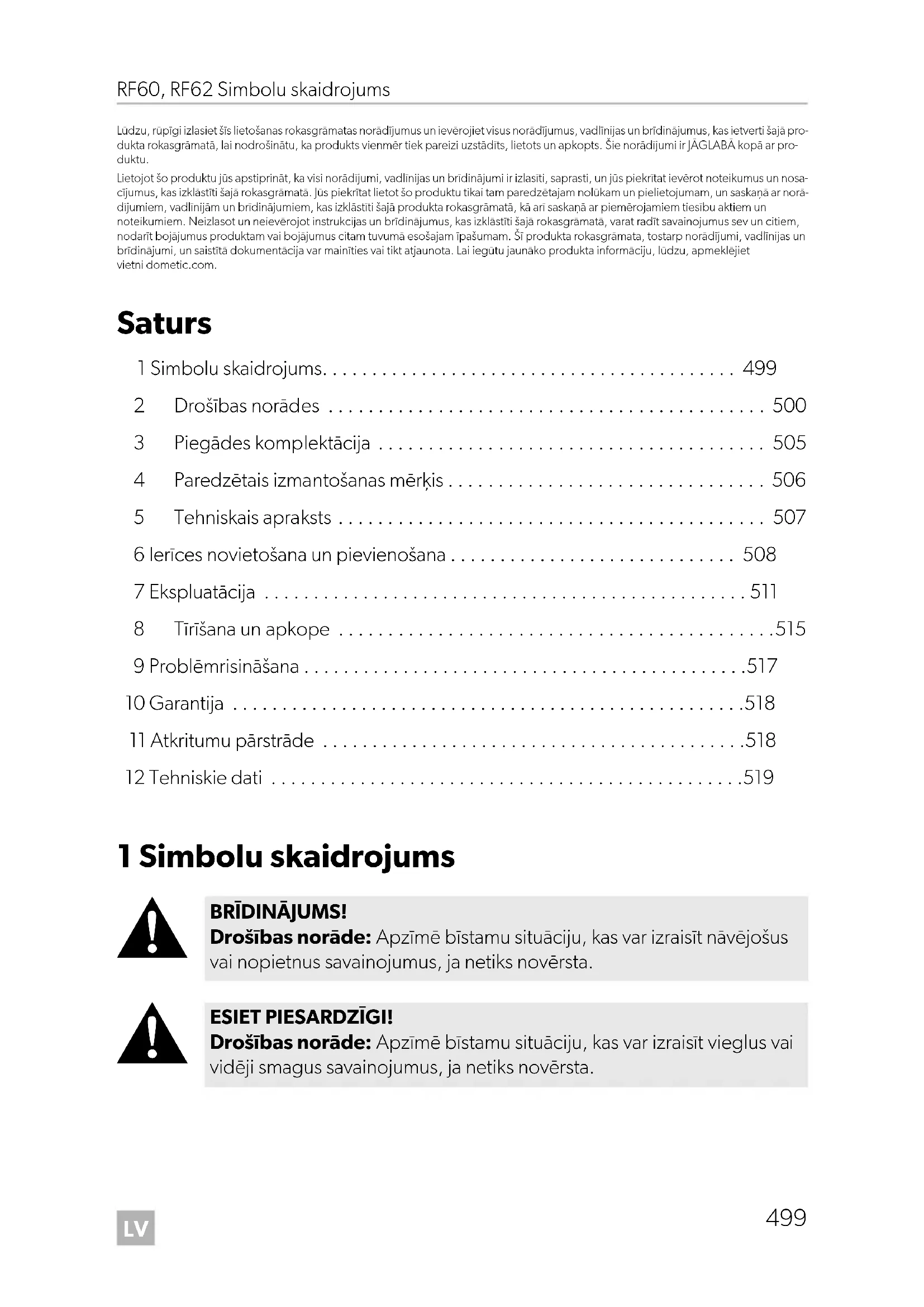 - Lūdzu, rūpīgi izlasiet šīs lietošanas rokasgrāmatas norādījumus un ievērojiet visus norādījumus, vadlīnijas un brīdinājumus, kas ietverti šajā pro- dukta rokasgrāmatā, lai nodrošinātu, ka produkts vienmēr tiek pareizi uzstādīts, lietots un apkopts. Šie norādījumi ir JĀGLABĀ kopā ar pro- duktu. Lietojot šo produktu jūs apstiprināt, ka visi norādījumi, vadlīnijas un brīdinājumi ir izlasīti, saprasti, un jūs piekrītat ievērot noteikumus un nosa- cījumus, kas izklāstīti šajā rokasgrāmatā. Jūs piekrītat lietot šo produktu tikai tam paredzētajam nolūkam un pielietojumam, un saskaņā ar norā- dījumiem, vadlīnijām un brīdinājumiem, kas izklāstīti šajā produkta rokasgrāmatā, kā arī saskaņā ar piemērojamiem tiesību aktiem un noteikumiem. Neizlasot un neievērojot instrukcijas un brīdinājumus, kas izklāstīti šajā rokasgrāmatā, varat radīt savainojumus sev un citiem, nodarīt bojājumus produktam vai bojājumus citam tuvumā esošajam īpašumam. Šī produkta rokasgrāmata, tostarp norādījumi, vadlīnijas un brīdinājumi, un saistītā dokumentācija var mainīties vai tikt atjaunota. Lai iegūtu jaunāko produkta informāciju, lūdzu, apmeklējiet vietni dometic.com. Saturs 1 Simbolu skaidrojums p. 499