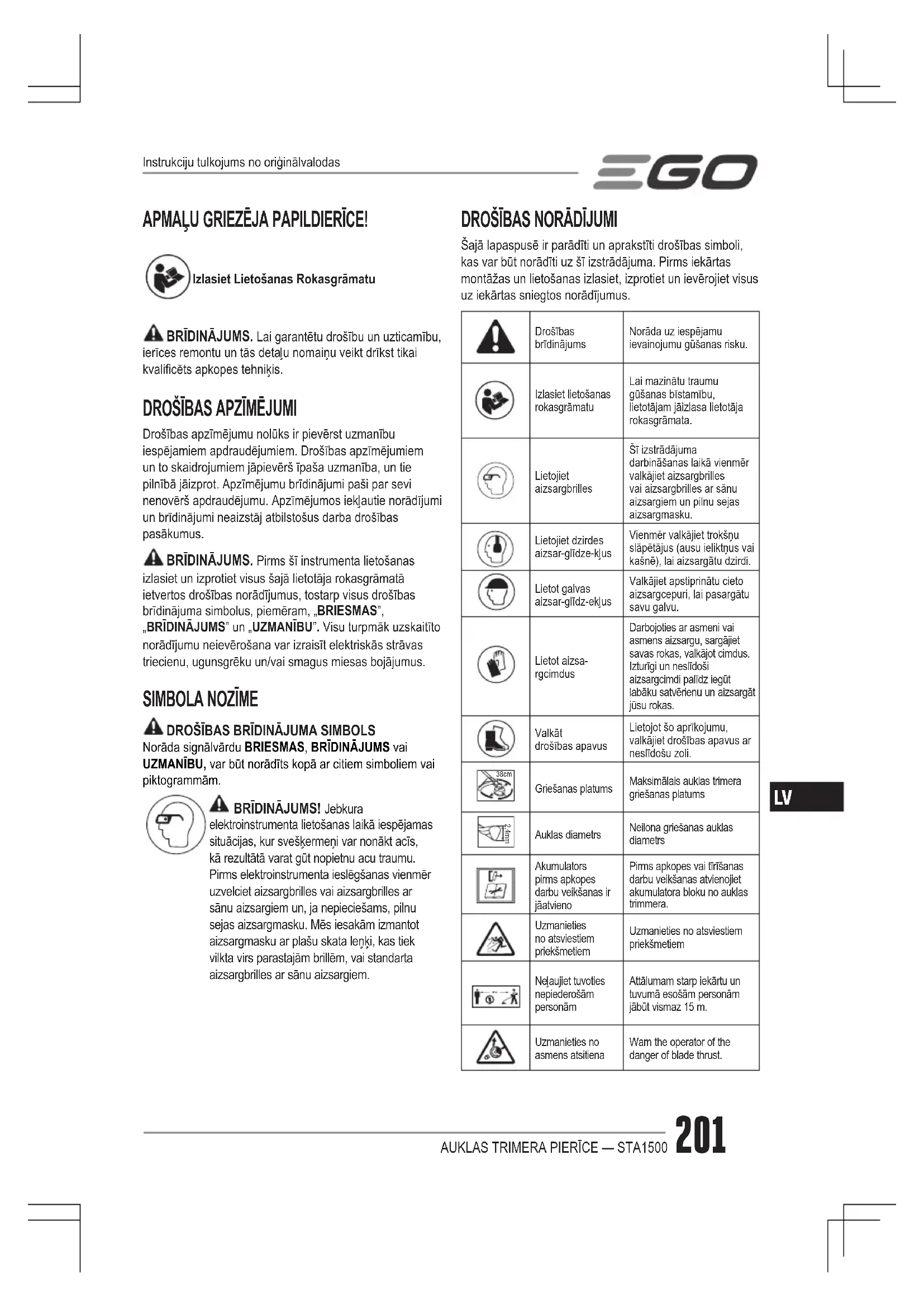 Šajā lapaspusē ir parādīti un aprakstīti drošības simboli, kas var būt norādīti uz šī izstrādājuma. Pirms iekārtas montāžas un lietošanas izlasiet, izprotiet un ievērojiet visus uz iekārtas sniegtos norādījumus. Drošības brīdinājumsNorāda uz iespējamu ievainojumu gūšanas risku.Izlasiet lietošanas rokasgrāmatuLai mazinātu traumu gūšanas bīstamību, lietotājam jāizlasa lietotāja rokasgrāmata.Lietojiet aizsargbrillesŠī izstrādājuma darbināšanas laikā vienmēr valkājiet aizsargbrilles vai aizsargbrilles ar sānu aizsargiem un pilnu sejas aizsargmasku.Lietojiet dzirdes aizsar-glīdze-kļusVienmēr valkājiet trokšņu slāpētājus (ausu ieliktņus vai kašnē), lai aizsargātu dzirdi.Lietot galvas aizsar-glīdz-ekļusValkājiet apstiprinātu cieto aizsargcepuri, lai pasargātu savu galvu.Lietot aizsa-rgcimdusDarbojoties ar asmeni vai asmens aizsargu, sargājiet savas rokas, valkājot cimdus. Izturīgi un neslīdoši aizsargcimdi palīdz iegūt labāku satvērienu un aizsargāt jūsu rokas.Valkāt drošības apavusLietojot šo aprīkojumu, valkājiet drošības apavus ar neslīdošu zoli. 38cm Griešanas platumsMaksimālais auklas trimera griešanas platums 2.4mm Auklas diametrsNeilona griešanas auklas diametrsAkumulators pirms apkopes darbu veikšanas ir jāatvienoPirms apkopes vai tīrīšanas darbu veikšanas atvienojiet akumulatora bloku no auklas trimmera.Uzmanieties no atsviestiem priekšmetiemUzmanieties no atsviestiem priekšmetiemNeļaujiet tuvoties nepiederošām personāmAttālumam starp iekārtu un tuvumā esošām personām jābūt vismaz 15 m.Uzmanieties no asmens atsitienaWarn the operator of the danger of blade thrust. Instrukciju tulkojums no oriģinālvalodasAUKLAS TRIMERA PIERĪCE — STA1500 202