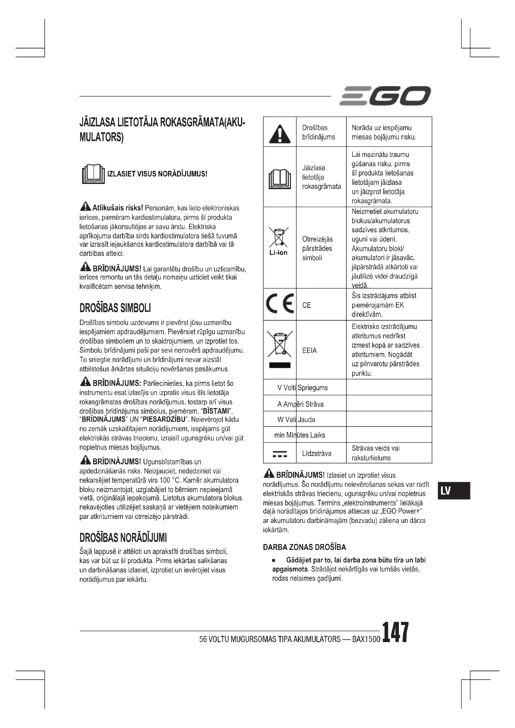 Šajā lappusē ir attēloti un aprakstīti drošības simboli, kas var būt uz šī produkta. Pirms iekārtas salikšanas un darbināšanas izlasiet, izprotiet un ievērojiet visus norādījumus par iekārtu.Drošības brīdinājumsNorāda uz iespējamu miesas bojājumu risku.Jāizlasa lietotāja rokasgrāmata Lai mazinātu traumu gūšanas risku, pirms šī produkta lietošanas lietotājam jāizlasa un jāizprot lietotāja rokasgrāmata. Li-ion Otrreizējās pārstrādes simboliNeizmetiet akumulatoru blokus/akumulatorus sadzīves atkritumos, ugunī vai ūdenī. Akumulatoru bloki/akumulatori ir jāsavāc, jāpārstrādā atkārtoti vai jāutilizē videi draudzīgā veidā. Šis izstrādājums atbilst piemērojamām EK direktīvām.EEIA Elektrisko izstrādājumu atkritumus nedrīkst izmest kopā ar sadzīves atkritumiem. Nogādāt uz pilnvarotu pārstrādes punktu.V Volti SpriegumsA Ampēri StrāvaW Vati Jaudamin Minūtes LaiksLīdzstrāvaStrāvas veids vai raksturlielums BRĪDINĀJUMS! Izlasiet un izprotiet visus norādījumus. Šo norādījumu neievērošanas sekas var radīt elektriskās strāvas triecienu, ugunsgrēku un/vai nopietnus miesas bojājumus. Termins „elektroinstruments” lielākajā daļā norādītajos brīdinājumos attiecas uz „EGO Power+” ar akumulatoru darbināmajām (bezvadu) zāliena un dārza iekārtām.