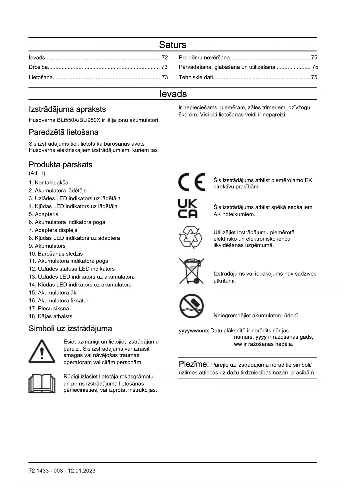 Simboli uz izstrādājuma Esiet uzmanīgi un lietojiet izstrādājumu pareizi. Šis izstrādājums var izraisīt smagas vai nāvējošas traumas operatoram vai citām personām. Rūpīgi izlasiet lietotāja rokasgrāmatu un pirms izstrādājuma lietošanas pārliecinieties, vai izprotat instrukcijas. Šis izstrādājums atbilst piemērojamo EK direktīvu prasībām. Šis izstrādājums atbilst spēkā esošajiem AK noteikumiem. Utilizējiet izstrādājumu piemērotā elektrisko un elektronisko ierīču likvidēšanas uzņēmumā. Izstrādājums vai iepakojums nav sadzīves atkritumi. Neiegremdējiet akumulatoru ūdenī. yyyywwxxxx Datu plāksnītē ir norādīts sērijas numurs. yyyy ir ražošanas gads, ww ir ražošanas nedēļa. Piezīme: Pārējie uz izstrādājuma norādītie simboli/ uzlīmes attiecas uz dažu tirdzniecības nozaru prasībām. 72 1433 - 003 - 12.01.2023Drošība Drošības definīcijas Brīdinājumi, norādes “Uzmanību!” un piezīmes tiek izmantotas, lai izceltu īpaši svarīgas lietotāja rokasgrāmatas daļas. BRĪDINĀJUMS: Tiek izmantota tad, ja rokasgrāmatā sniegto instrukciju neievērošanas dēļ operatoram vai blakus esošajām personām draud traumu vai nāves risks. IEVĒROJIET: Tiek izmantota tad, ja rokasgrāmatā sniegto instrukciju neievērošanas dēļ rodas izstrādājuma, citu materiālu vai blakus esošās teritorijas bojājuma risks. Piezīme: Tiek izmantota, lai sniegtu plašāku informāciju, kas nepieciešama attiecīgajā situācijā. Svarīgas drošības instrukcijas BRĪDINĀJUMS: Izlasiet visus drošības brīdinājumus un norādījumus. Neievērojot brīdinājumus un norādījumus, var rasties elektrotrauma, aizdegšanās un/vai smagas traumas. Piezīme: Saglabājiet visus brīdinājumus un instrukcijas.