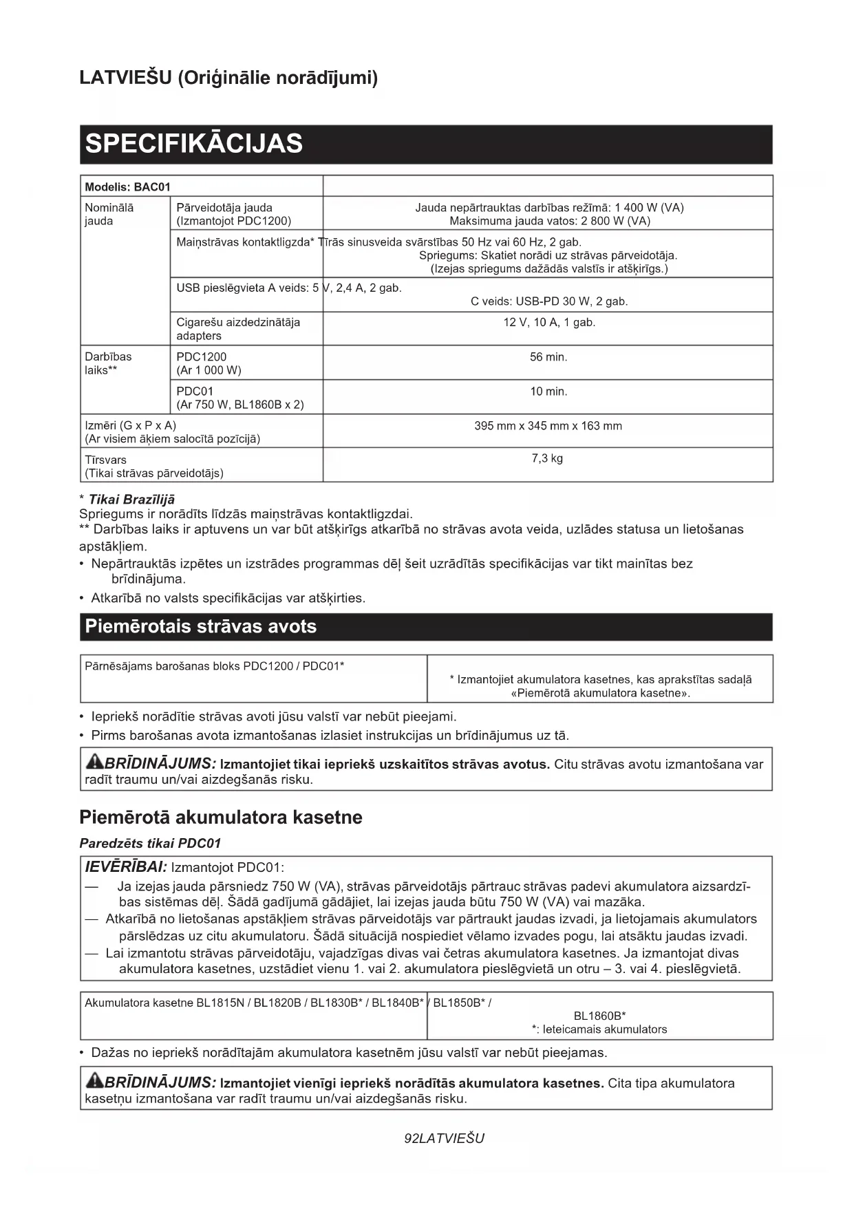 - MAKPAC HUOMAA: Jotkin luettelossa mainitut varusteet voi- vat sisältyä työkalun toimitukseen vakiovarusteina. Ne voivat vaihdella maittain.92 LATVIEŠU LATVIEŠU (Oriģinālie norādījumi) SPECIFIKĀCIJAS Modelis: BAC01 Nominālā jauda Pārveidotāja jauda (Izmantojot PDC1200) Jauda nepārtrauktas darbības režīmā: 1 400 W (VA) Maksimuma jauda vatos: 2 800 W (VA) Maiņstrāvas kontaktligzda* Tīrās sinusveida svārstības 50 Hz vai 60 Hz, 2 gab. Spriegums: Skatiet norādi uz strāvas pārveidotāja. (Izejas spriegums dažādās valstīs ir atšķirīgs.) USB pieslēgvieta A veids: 5 V, 2,4 A, 2 gab. C veids: USB-PD 30 W, 2 gab. Cigarešu aizdedzinātāja adapters 12 V, 10 A, 1 gab. Darbības laiks** PDC1200 (Ar 1 000 W) 56 min. PDC01 (Ar 750 W, BL1860B x 2) 10 min. Izmēri (G x P x A) (Ar visiem āķiem salocītā pozīcijā) 395 mm x 345 mm x 163 mm Tīrsvars (Tikai strāvas pārveidotājs) 7,3 kg
