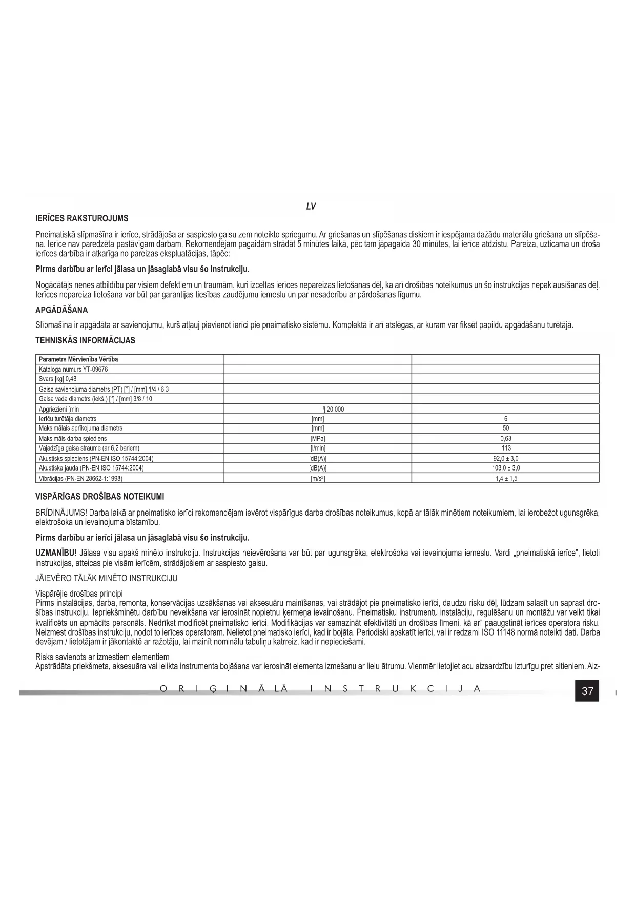 Pneimatiskā slīpmašīna ir ierīce, strādājoša ar saspiesto gaisu zem noteikto spriegumu. Ar griešanas un slīpēšanas diskiem ir iespējama dažādu materiālu griešana un slīpēša- na. Ierīce nav paredzēta pastāvīgam darbam. Rekomendējam pagaidām strādāt 5 minūtes laikā, pēc tam jāpagaida 30 minūtes, lai ierīce atdzistu. Pareiza, uzticama un droša ierīces darbība ir atkarīga no pareizas ekspluatācijas, tāpēc: Pirms darbību ar ierīci jālasa un jāsaglabā visu šo instrukciju. Nogādātājs nenes atbildību par visiem defektiem un traumām, kuri izceltas ierīces nepareizas lietošanas dēļ, ka arī drošības noteikumus un šo instrukcijas nepaklausīšanas dēļ. Ierīces nepareiza lietošana var būt par garantijas tiesības zaudējumu iemeslu un par nesaderību ar pārdošanas līgumu.