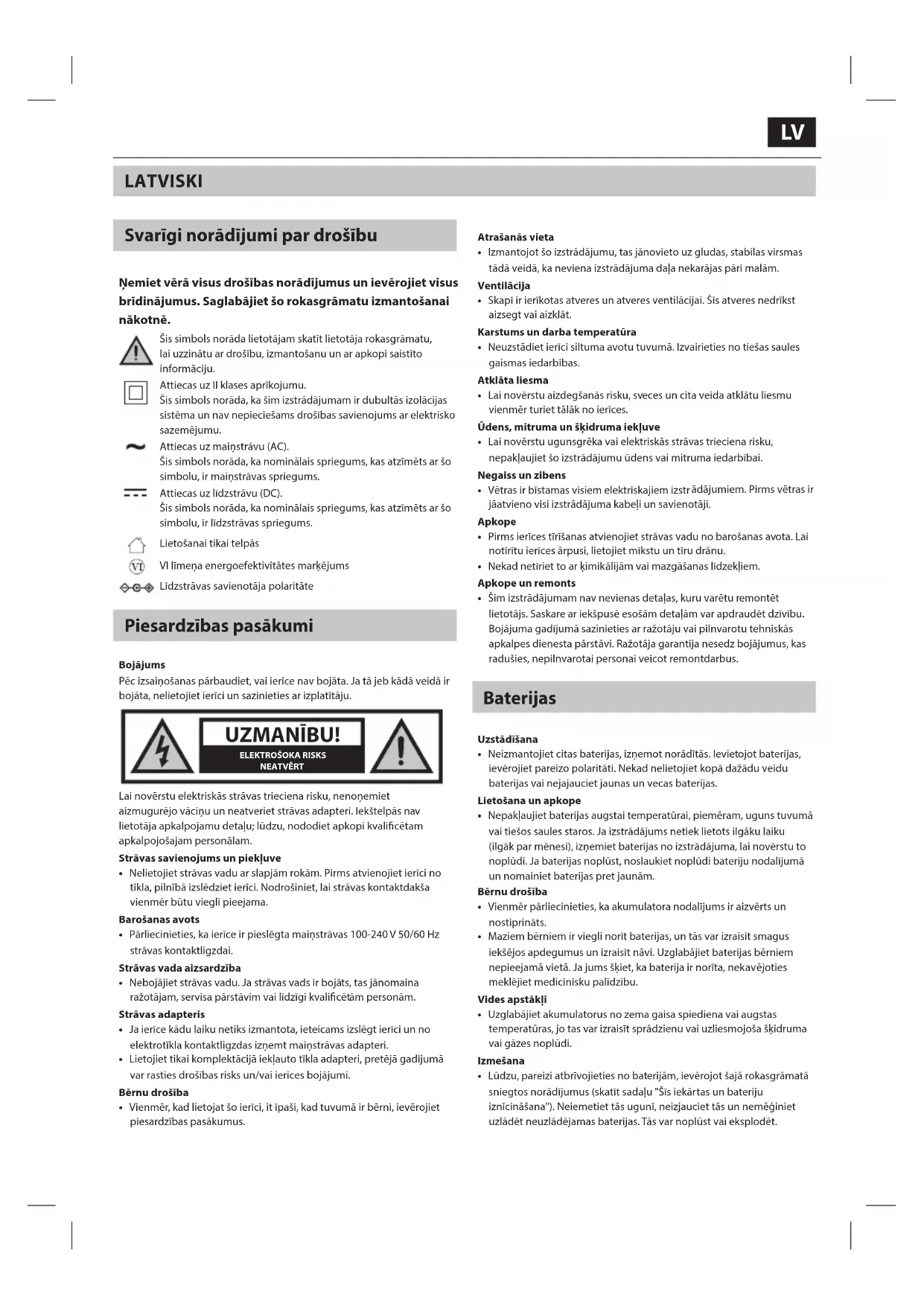 - Neizmantojiet citas baterijas, izņemot norādītās. Ievietojot baterijas, ievērojiet pareizo polaritāti. Nekad nelietojiet kopā dažādu veidu baterijas vai nejajauciet jaunas un vecas baterijas. Lietošana un apkope